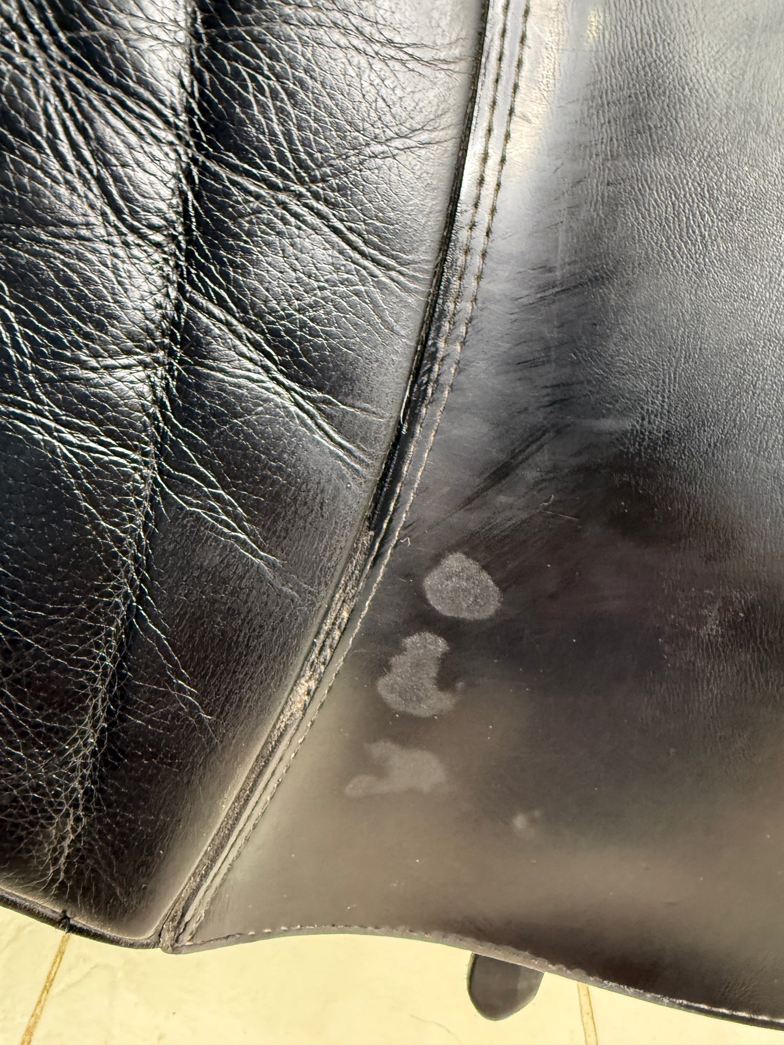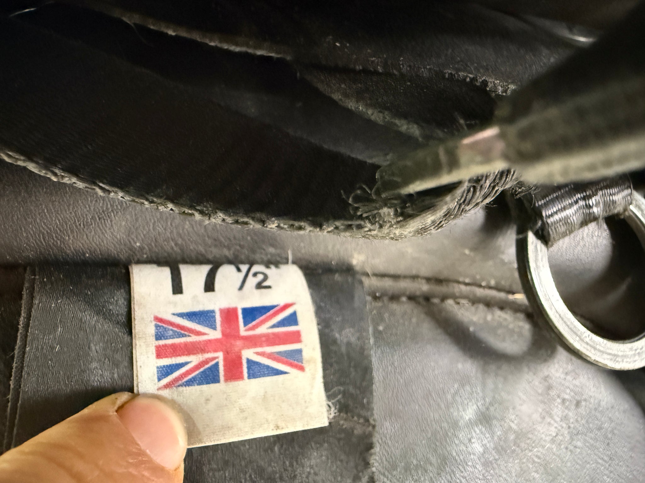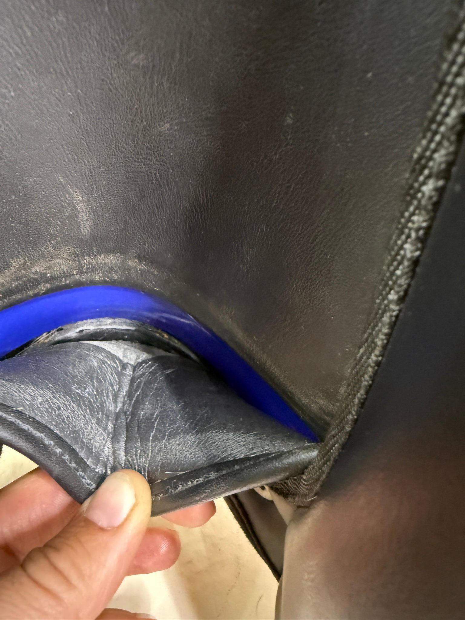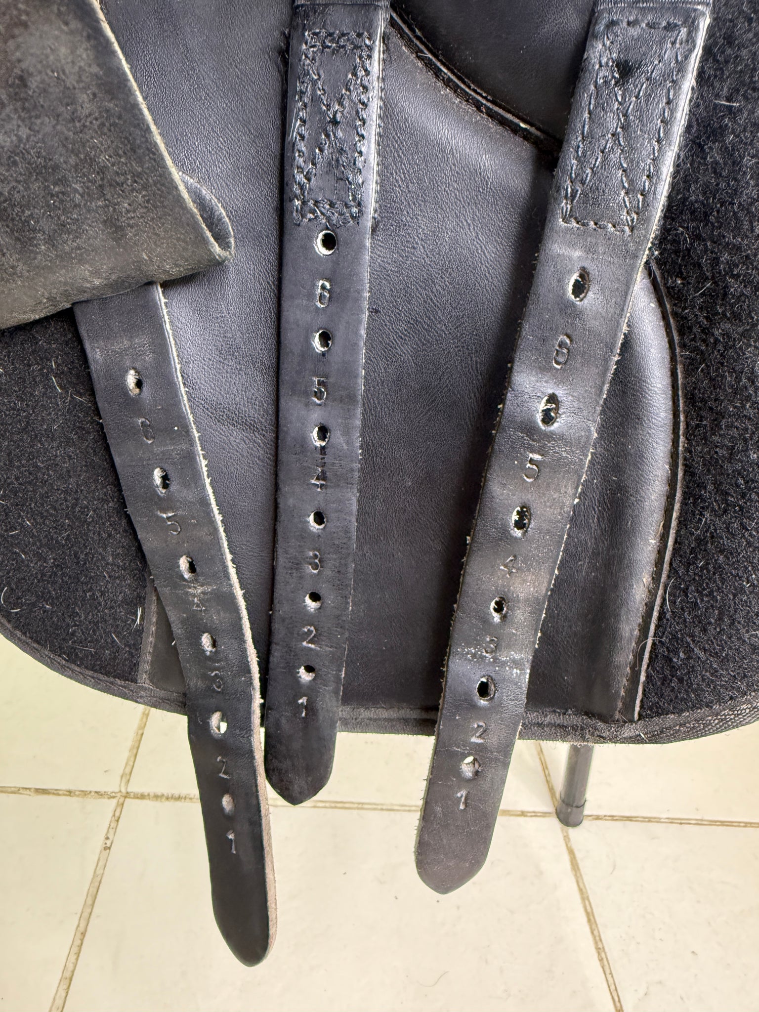 Leather seat & knees. Synthetic flap and underside. Velcro to add a block if needed. wool flocked panel. Uses the Throwgood R bar gullets.