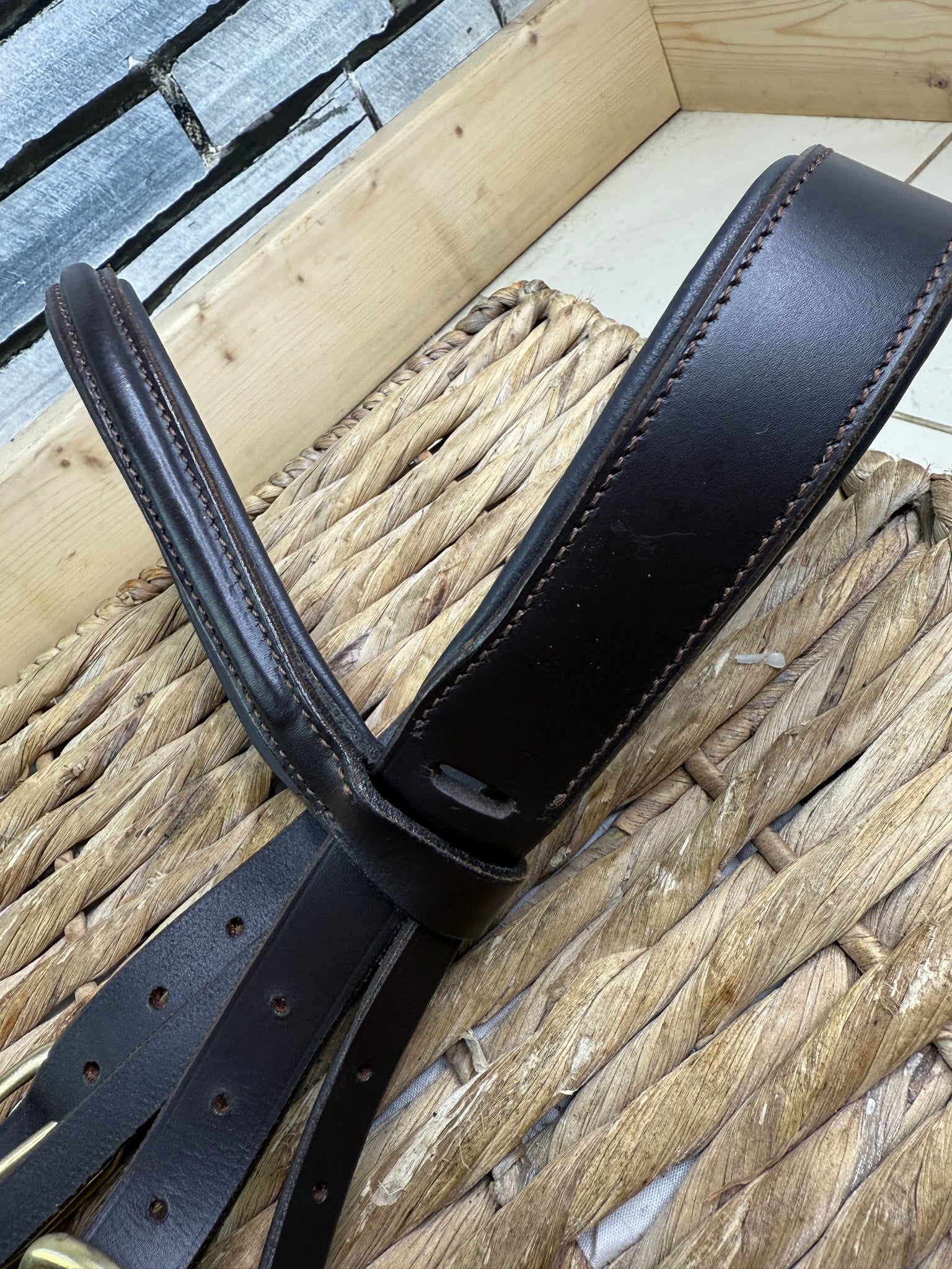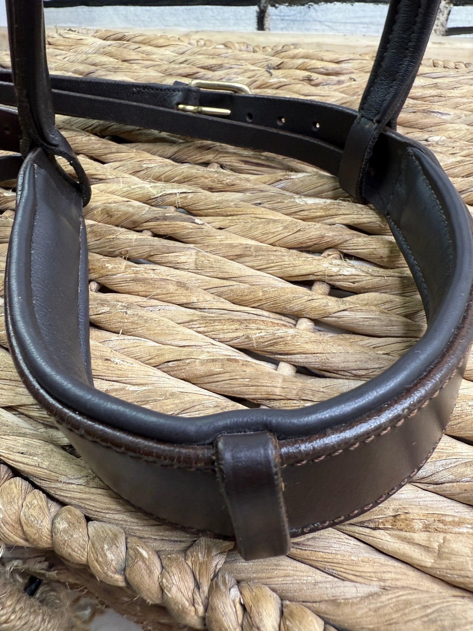Softly padded and supple leather. Headpiece, browband and cheeks only. Brown with brass fittings.