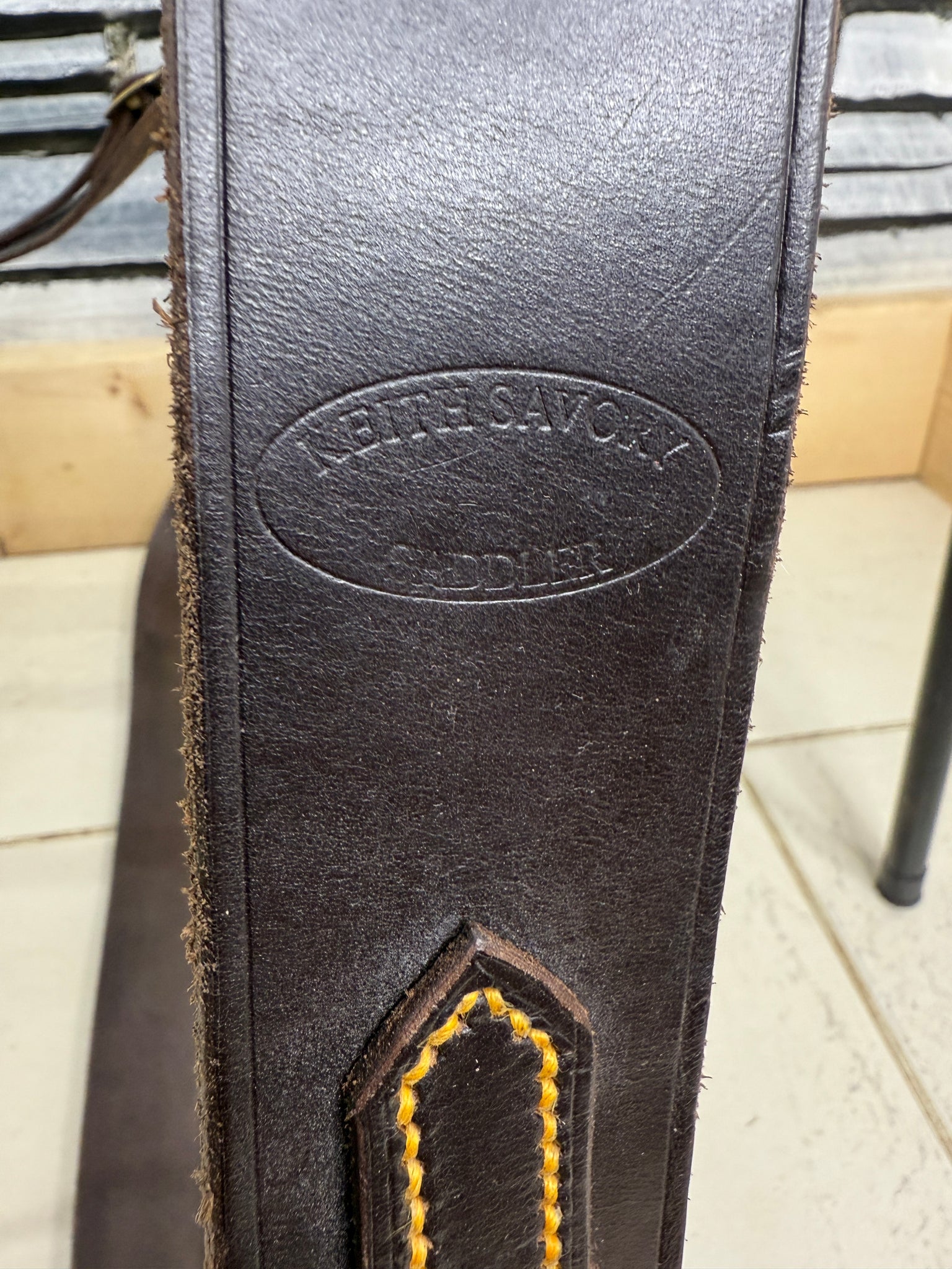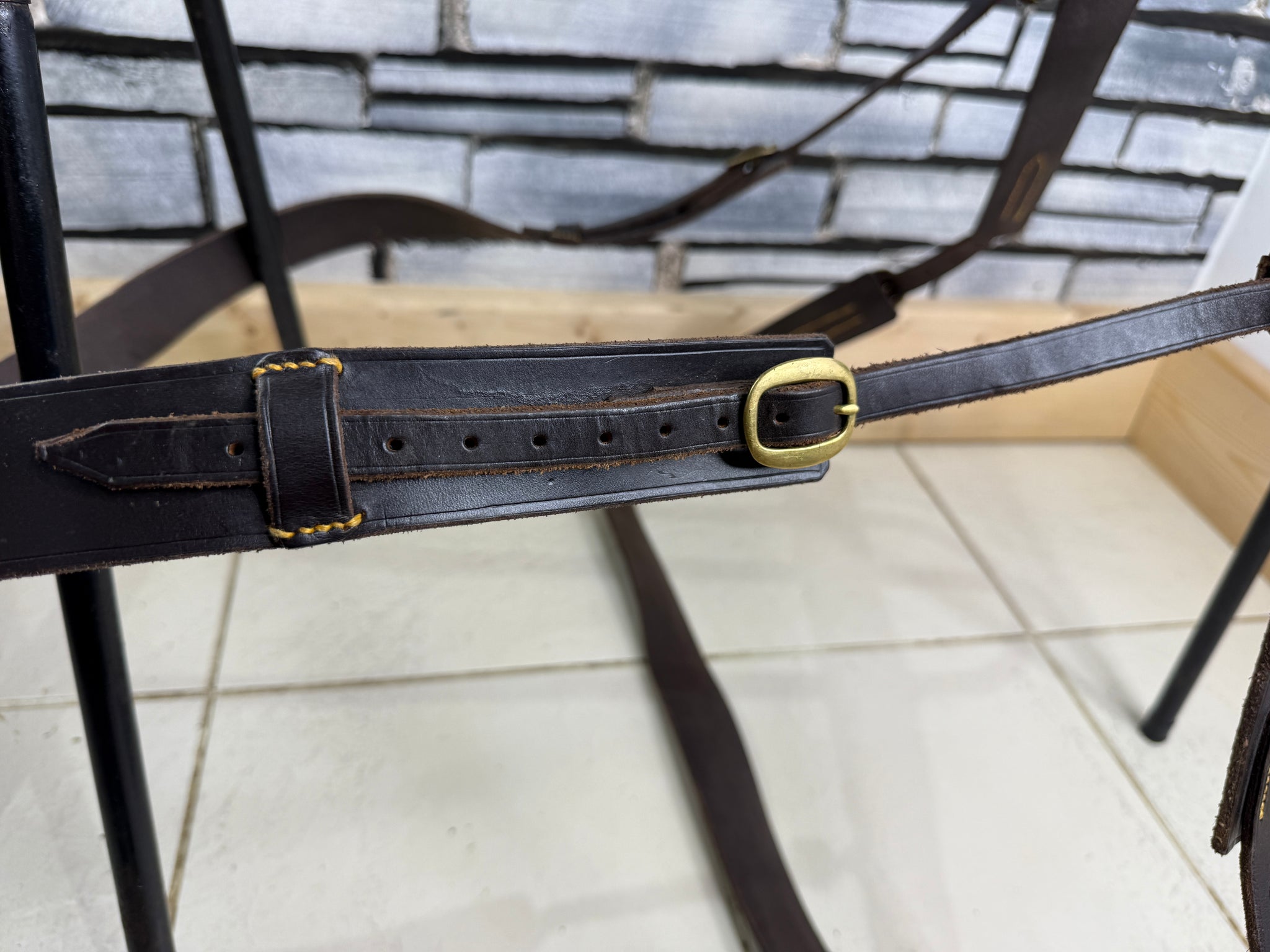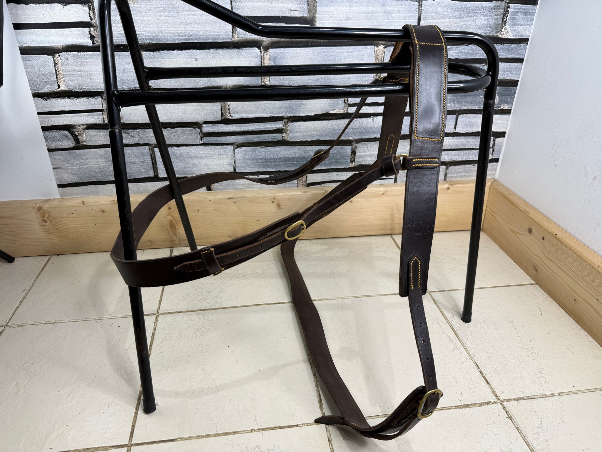 Unused. Super smart, English brown leather strap work. Tan leather, black suede lined, wool flocked pads. Gold stitching. Brass fittings. The very best quality.