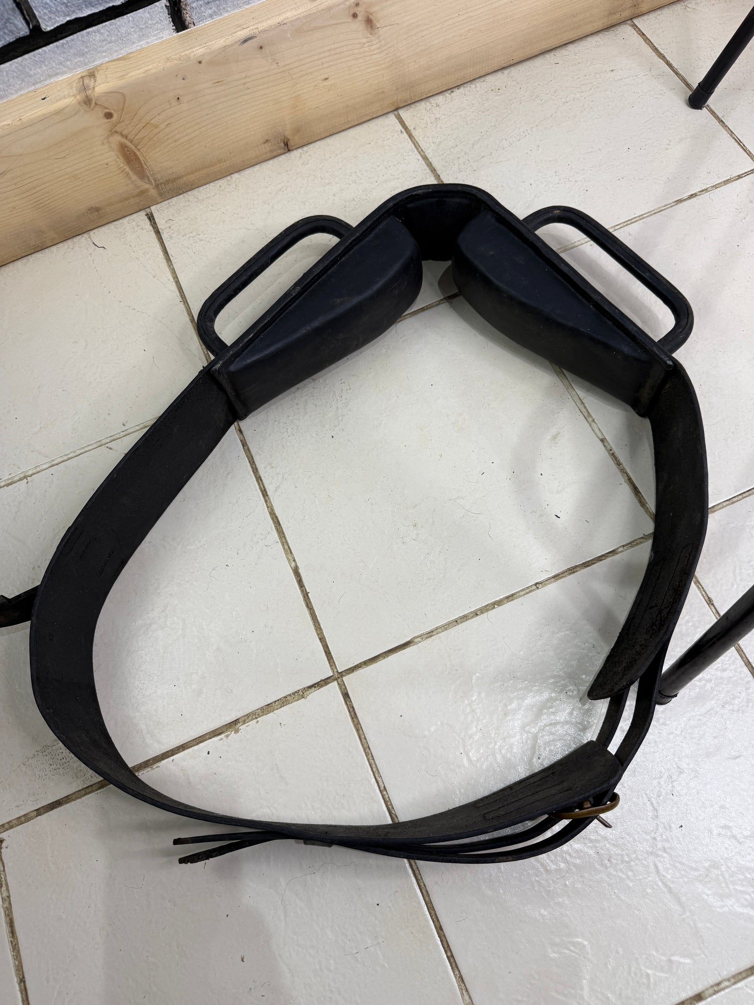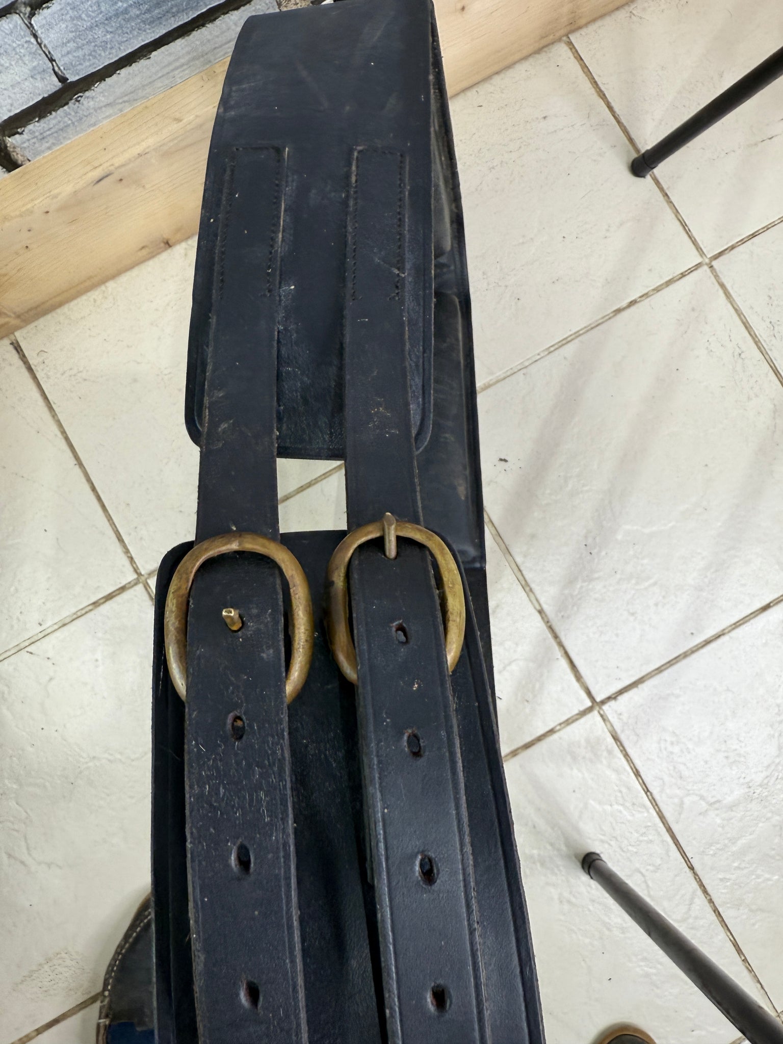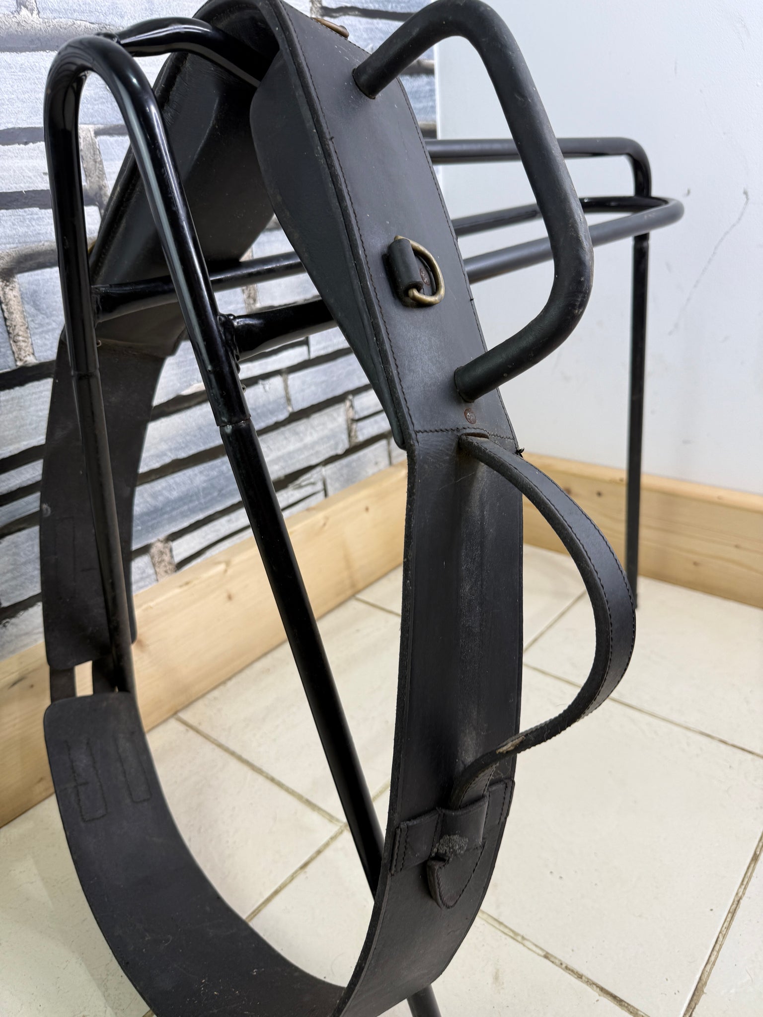 Well made, very solid. Brass fittings. Foam pads, wide leather with square fixed rings. Not had much use.