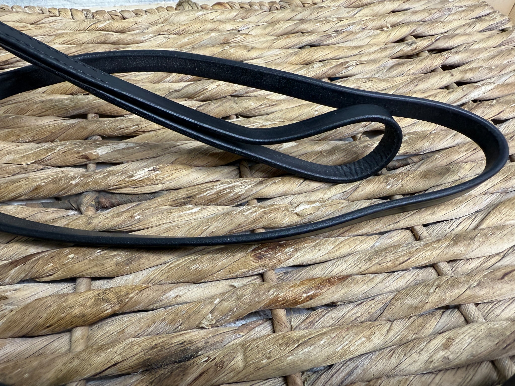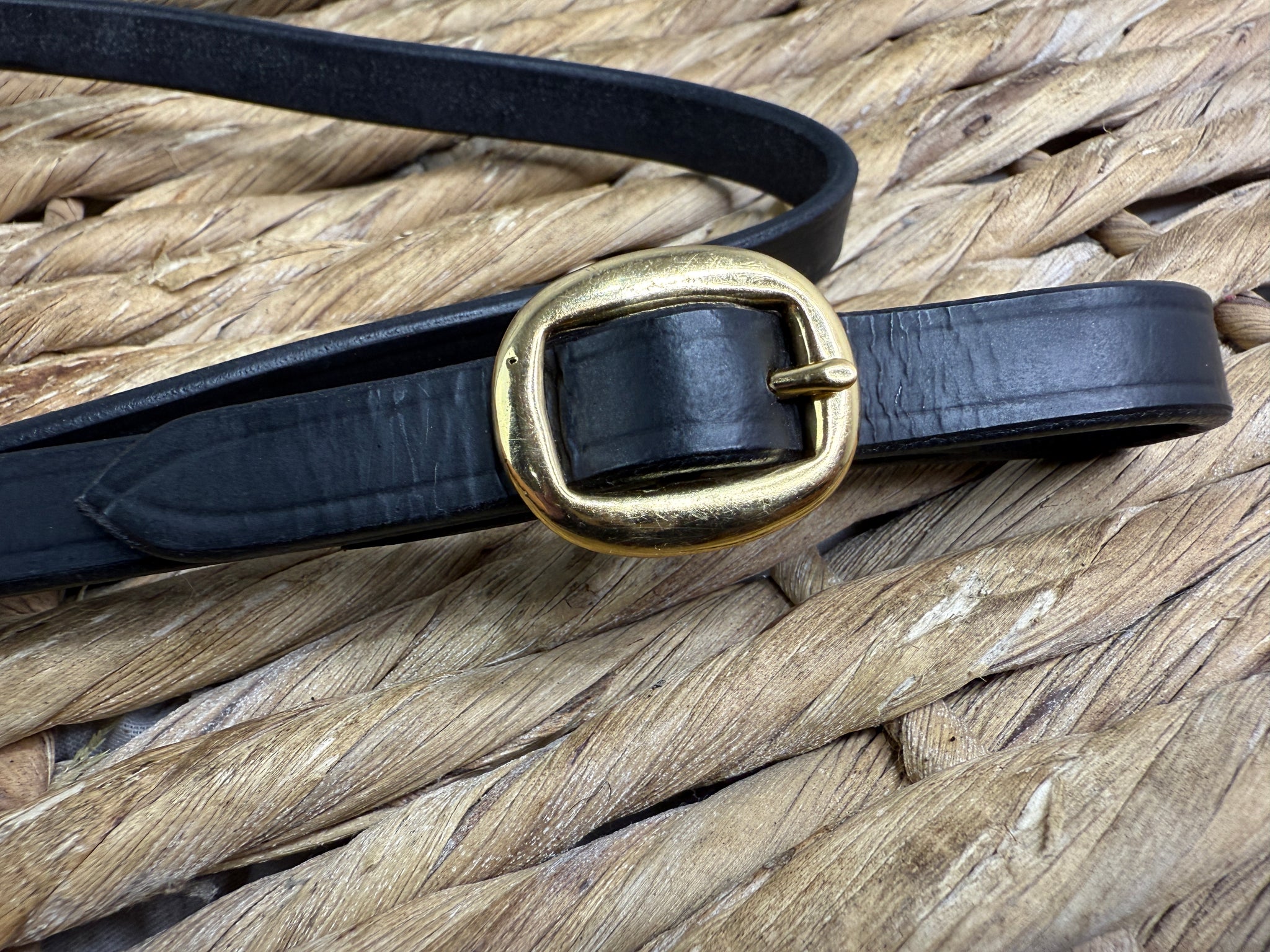 Black leather. 1/2” wide leather strap. Brass whole buckle and hand loop. 130cm long