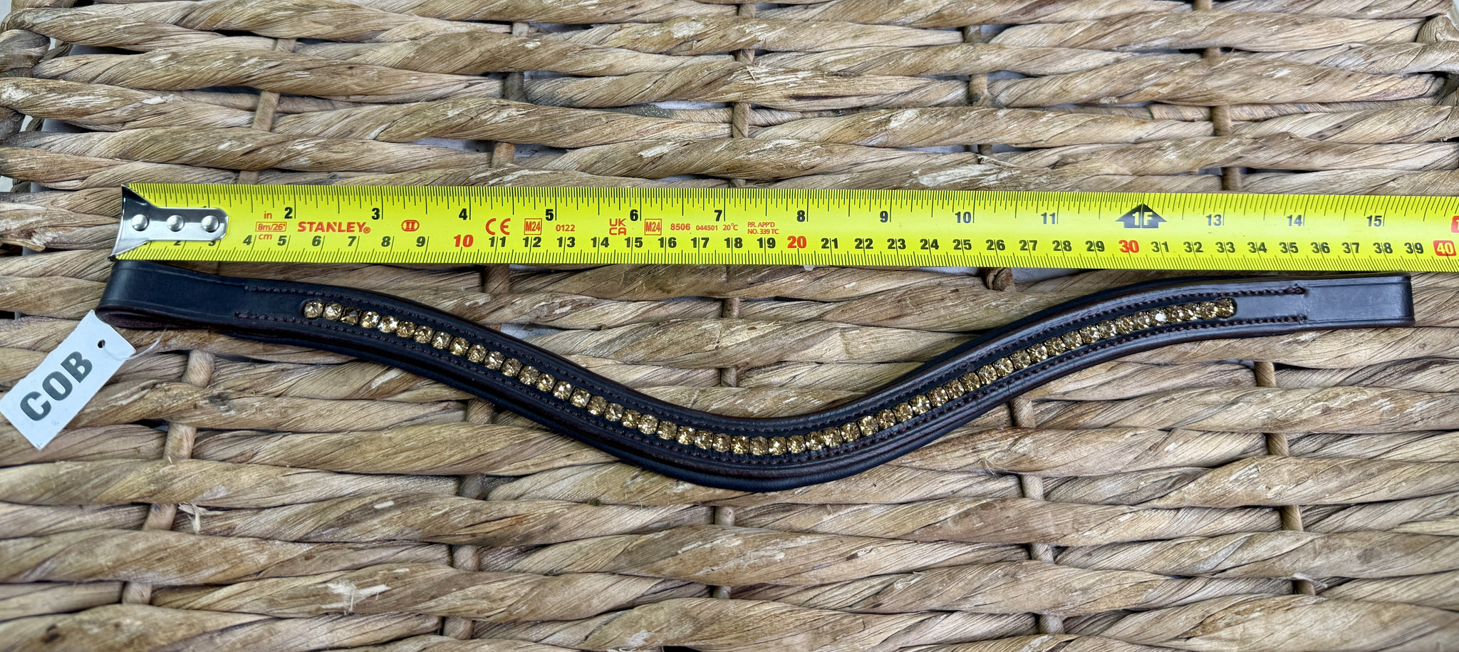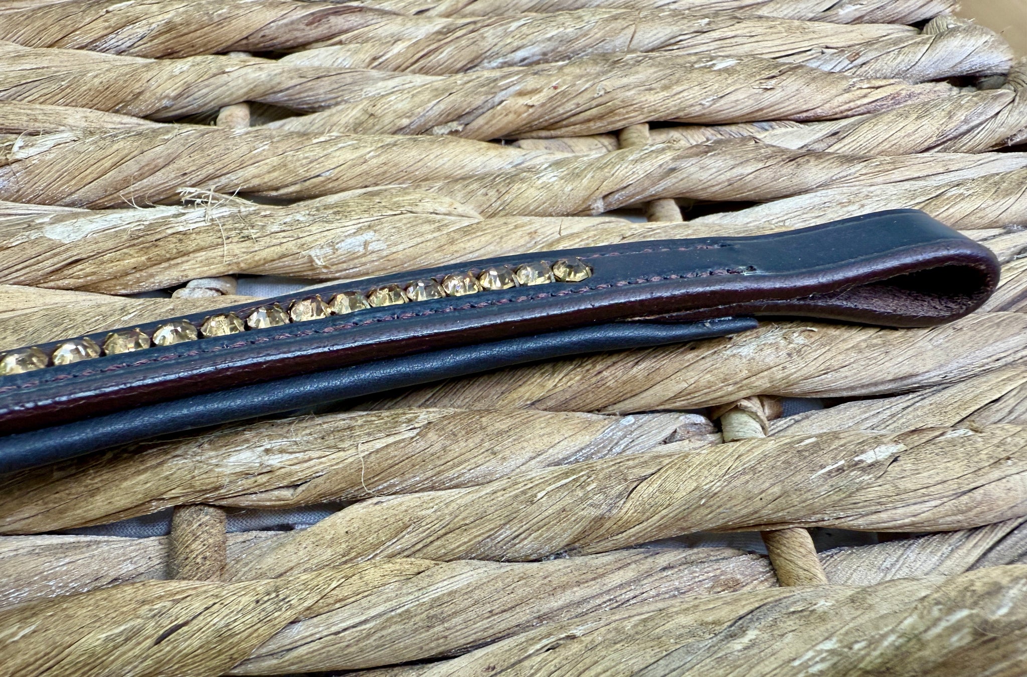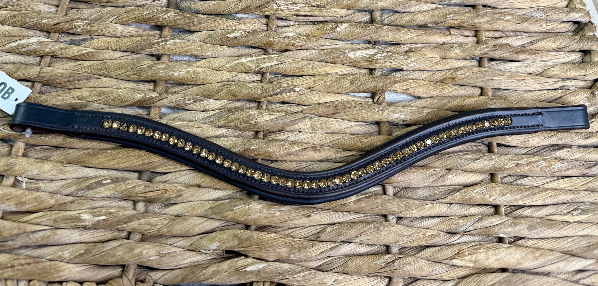 Quality leather. Padded browband with inset amber crystals. Brown only. Elegant wave design.