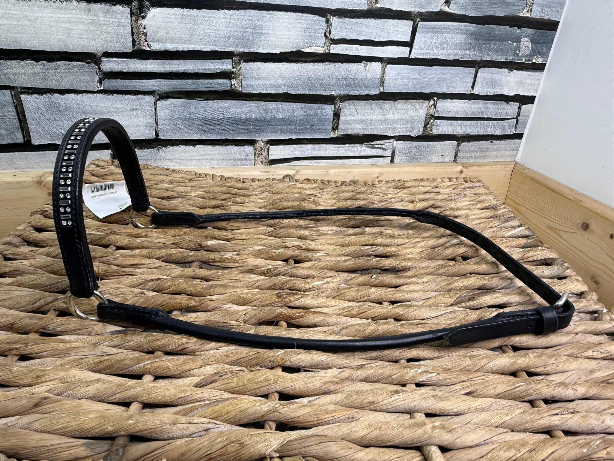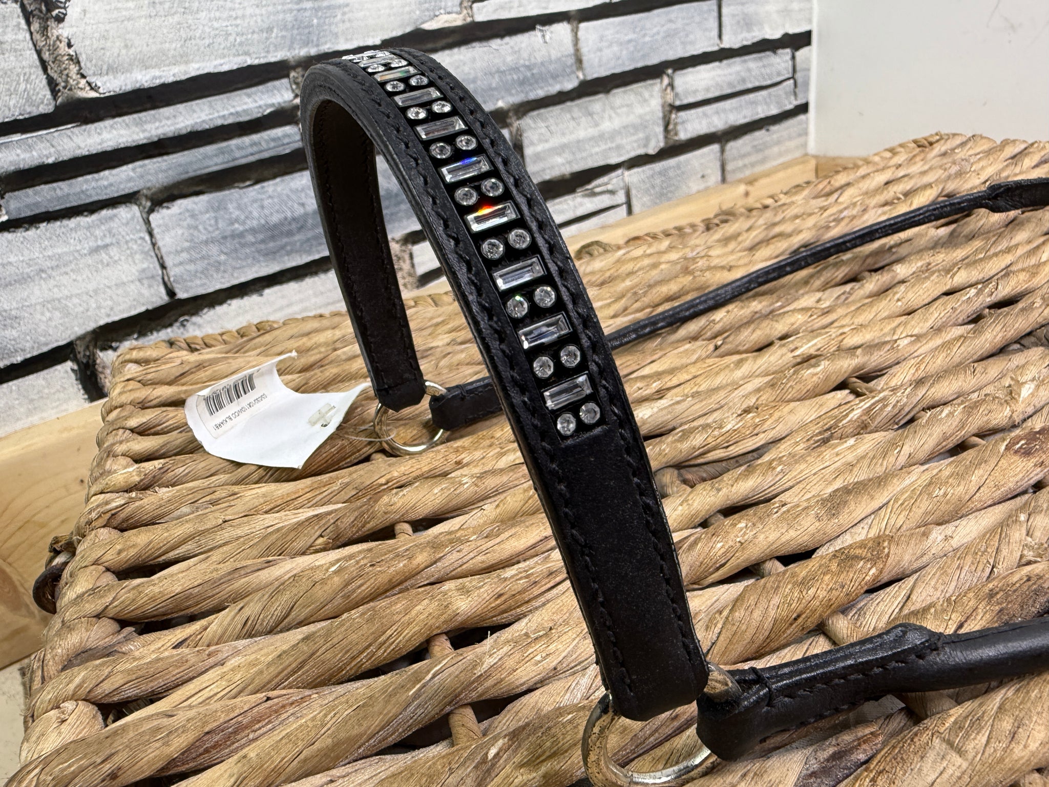 Beautiful rolled leather in-hand halter, brass fittings. Dot, Dot, Dash Diamantés inset into the noseband.