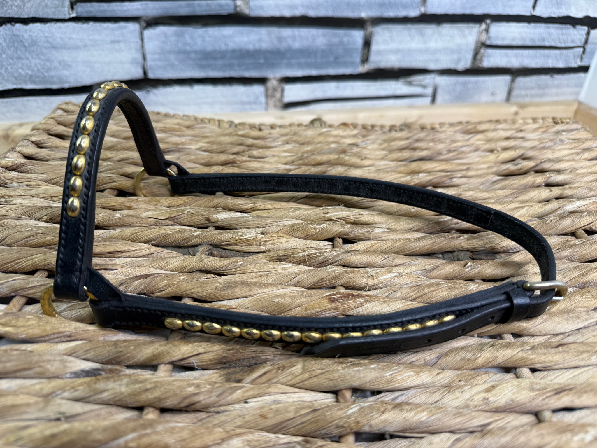 Beautiful leather in-hand halter, brass fittings. Brass beads inset along the noseband and both cheeks. Very flashy.