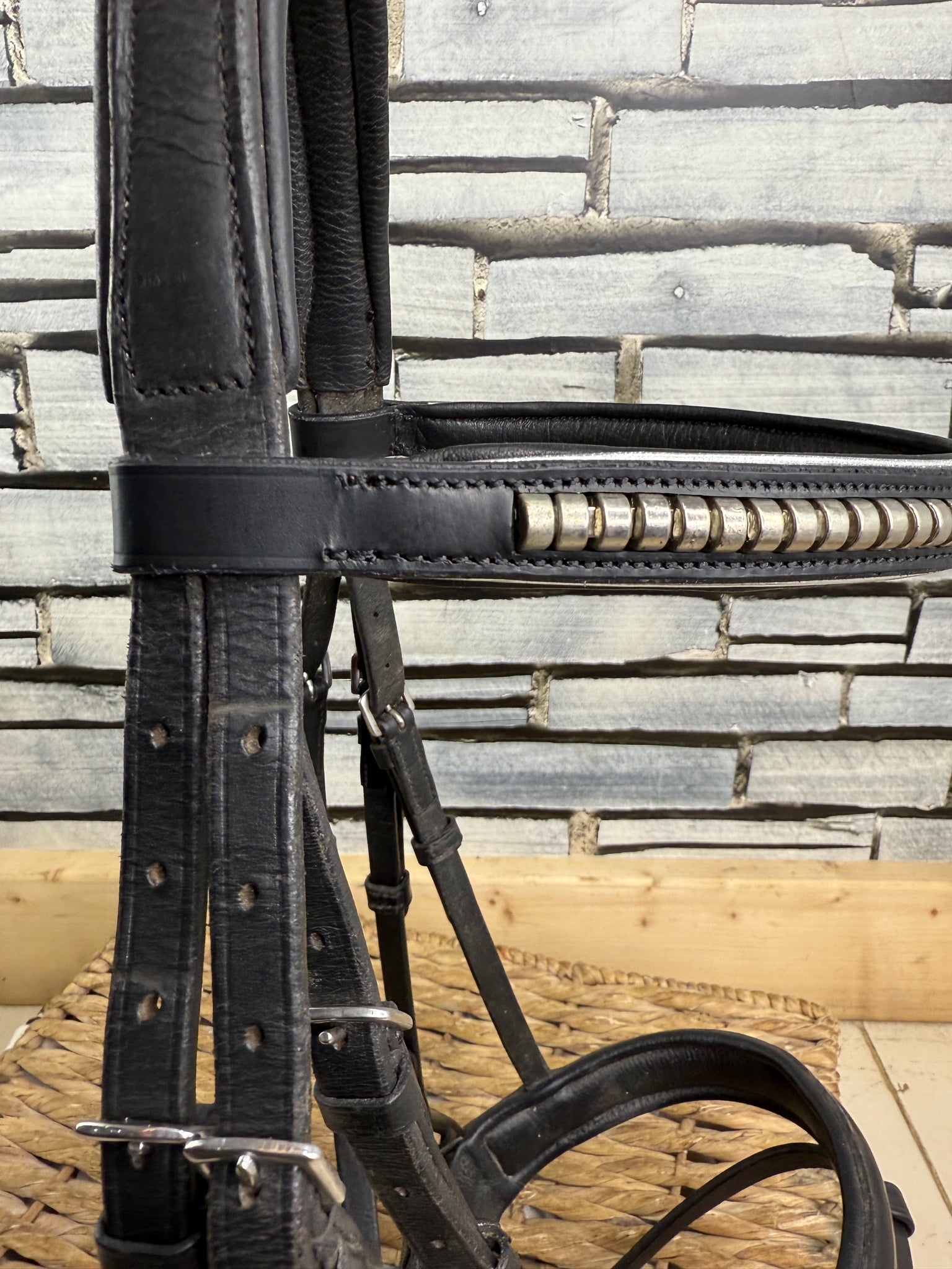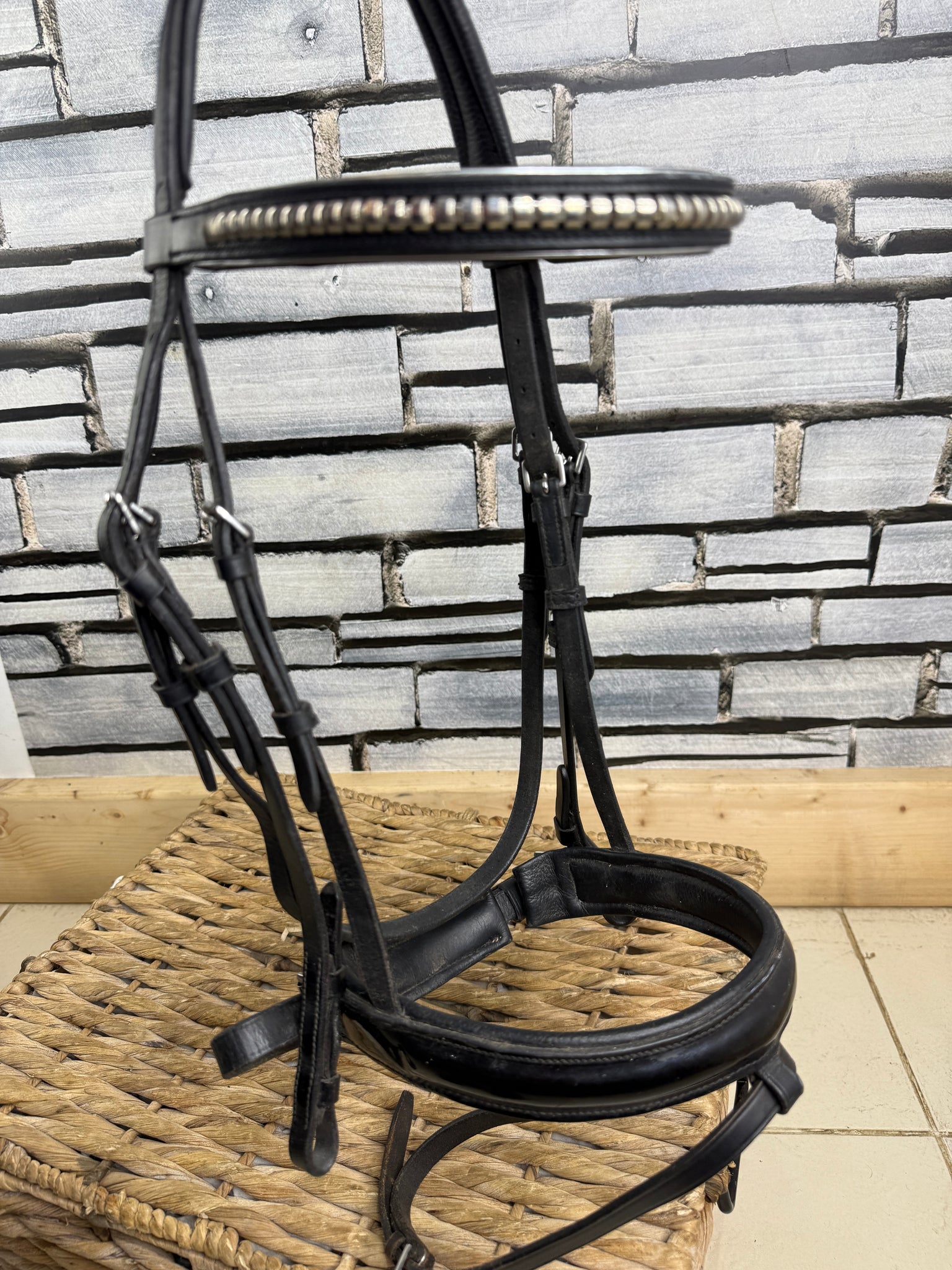 Black. Nice used condition. Supple leather. Lovely quality. Soft padded headpiece with double buckle noseband. Patent crank flash padded nose. Clinchered padded brow.