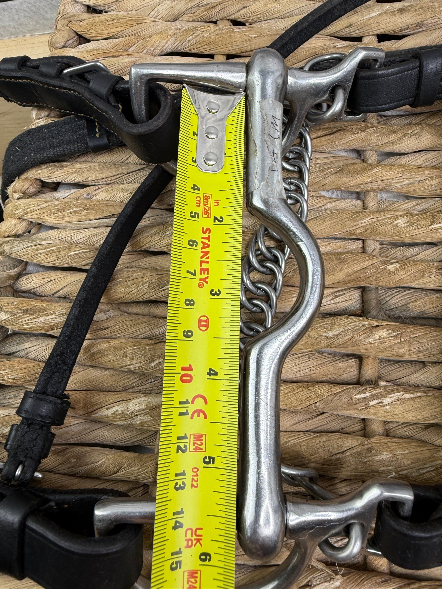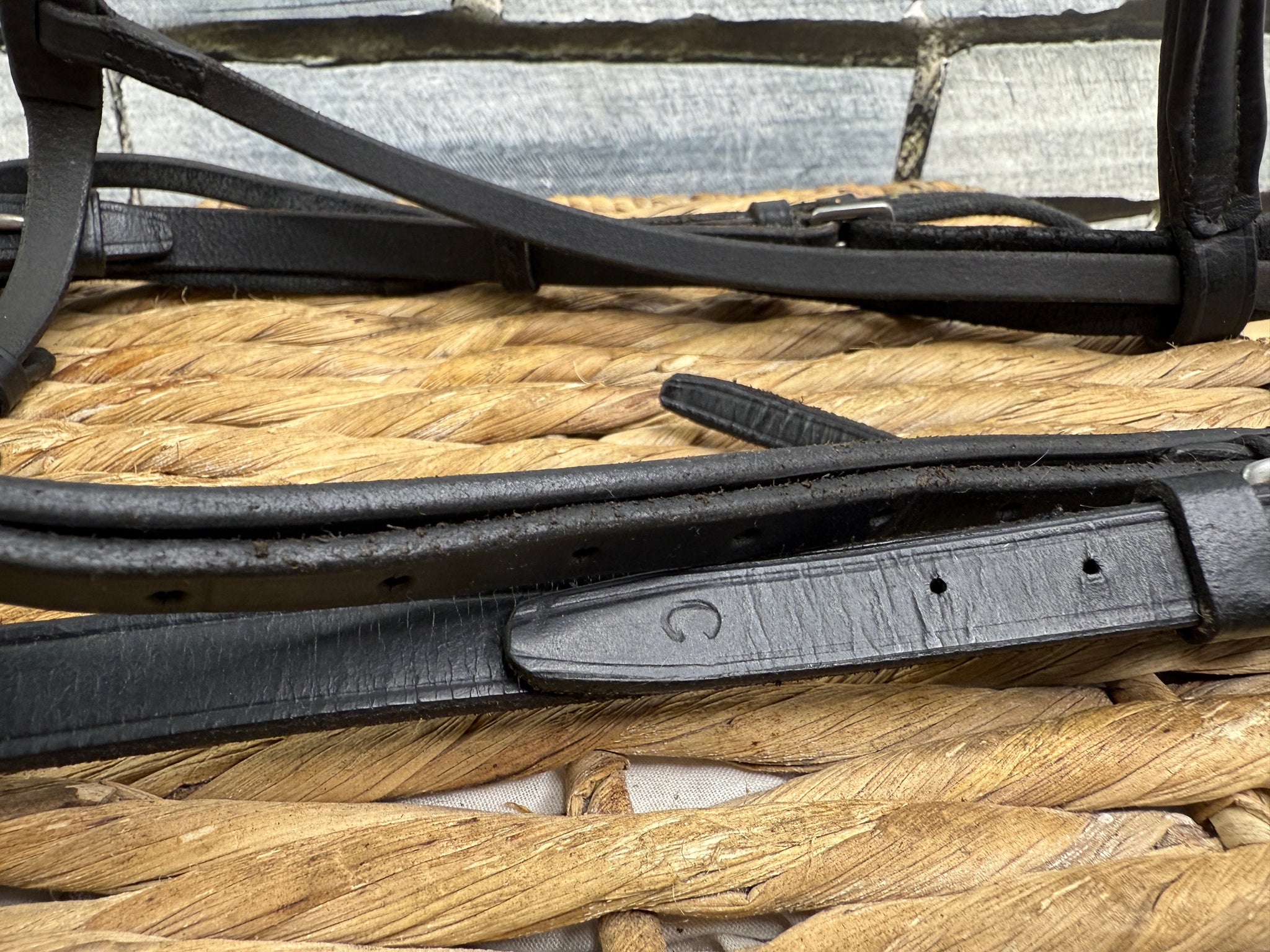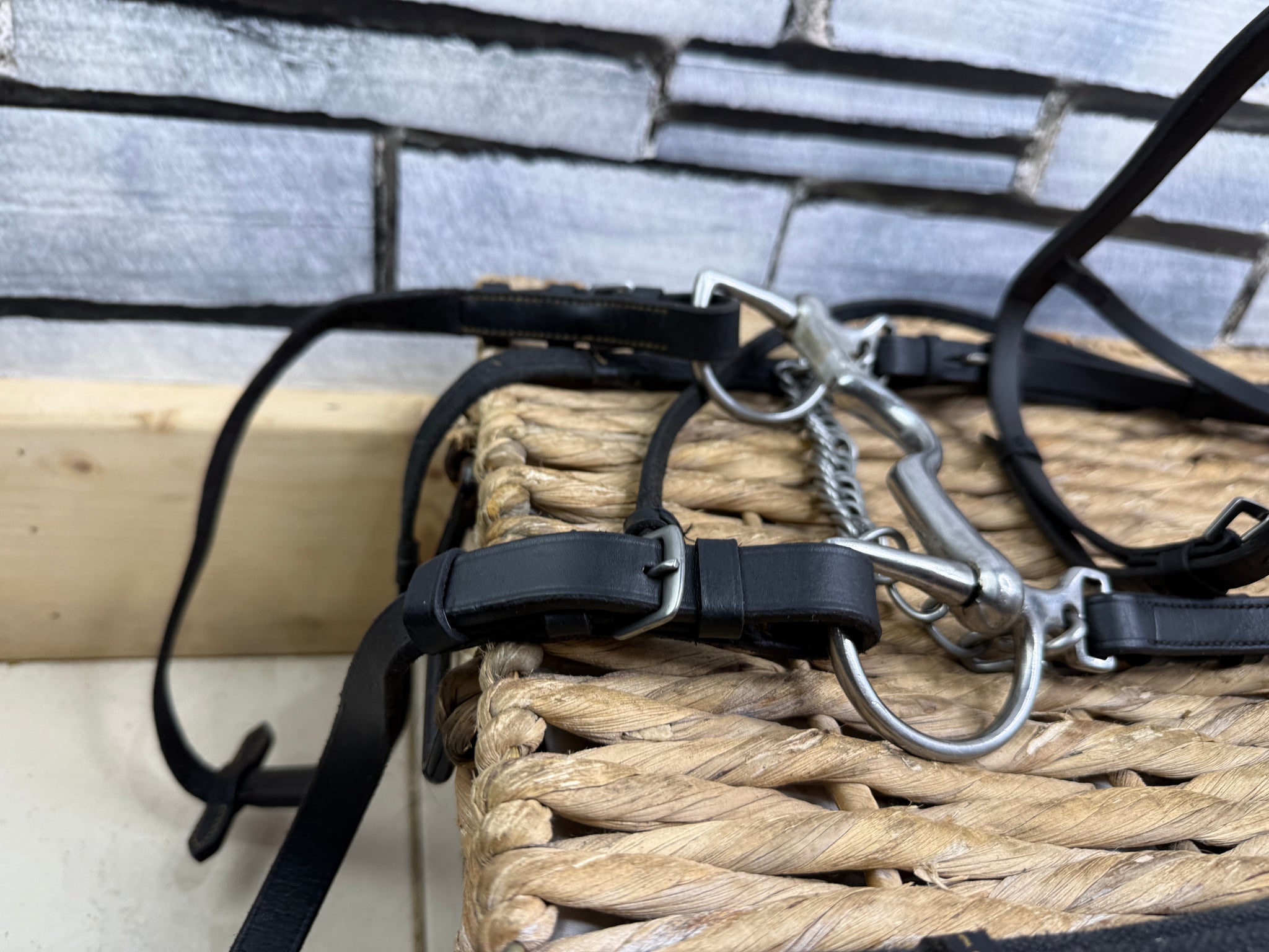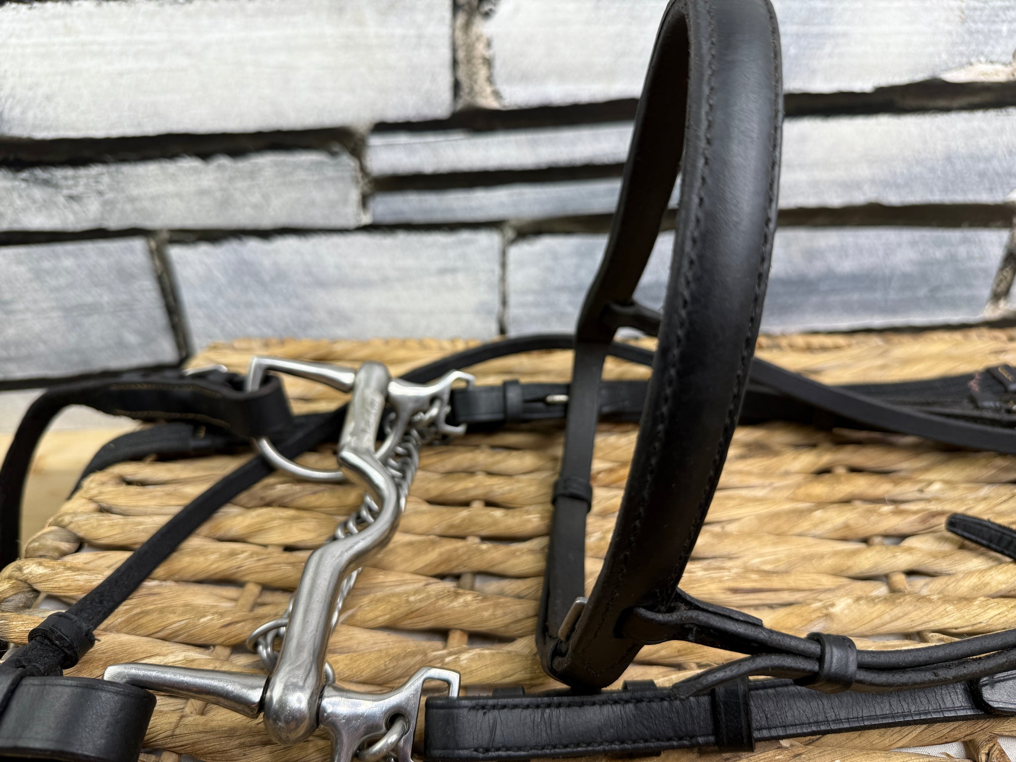 Lovely quality. Black English leather bridle. Continental reins. 5 1/2” porter kimblewick. Cavesson noseband. Smart, workmanlike setup, ready to use.