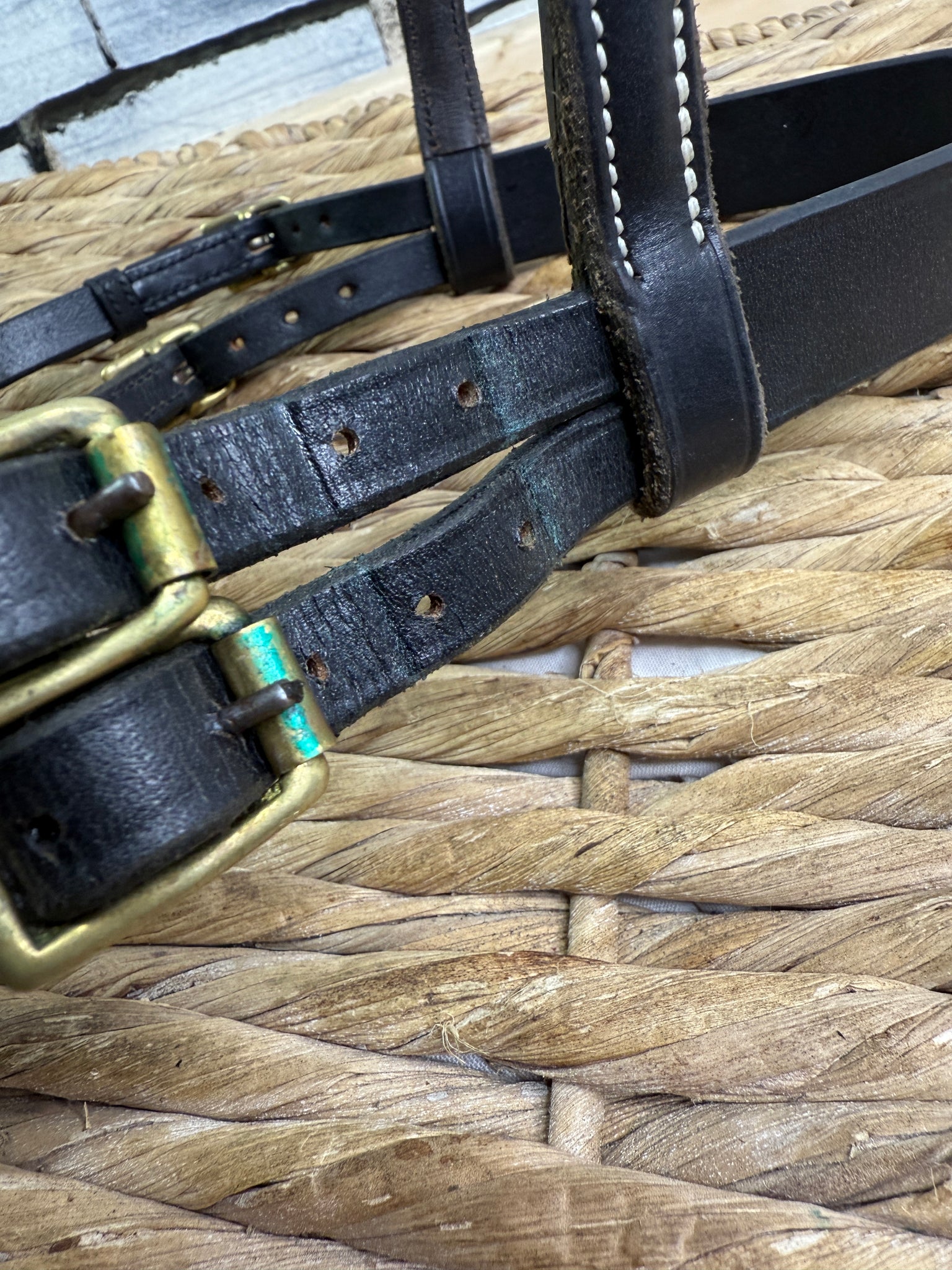 Leather is supple, proper English with Brass roller fittings. Cross under straps at the back with a ring to attach a lead.