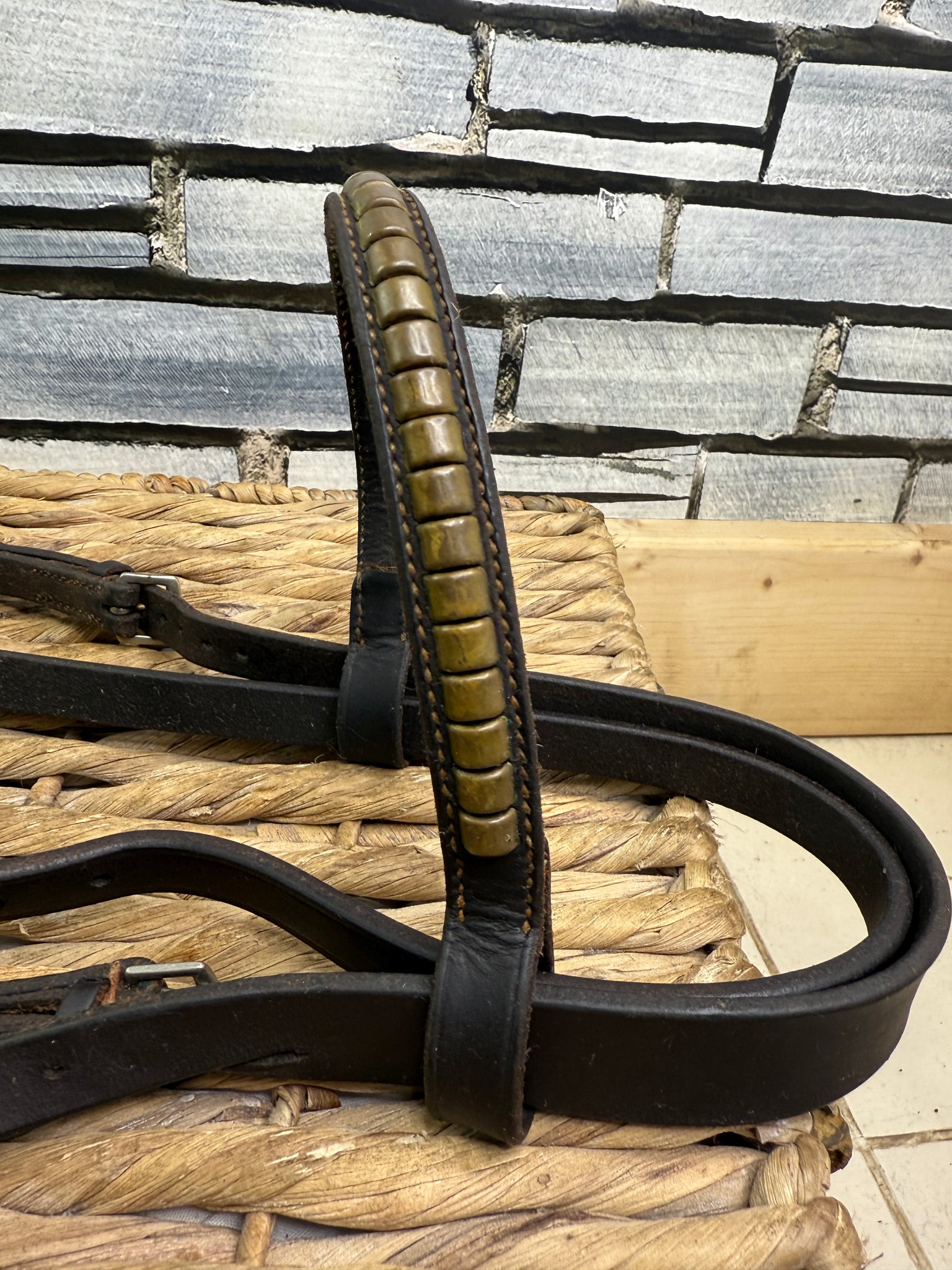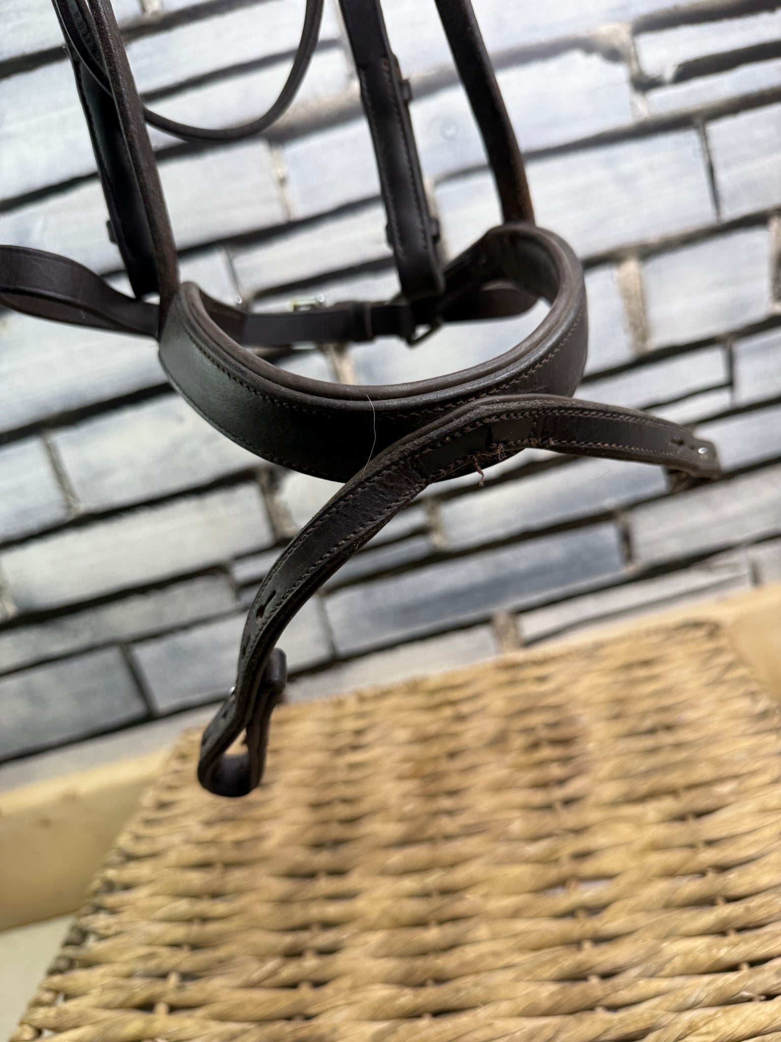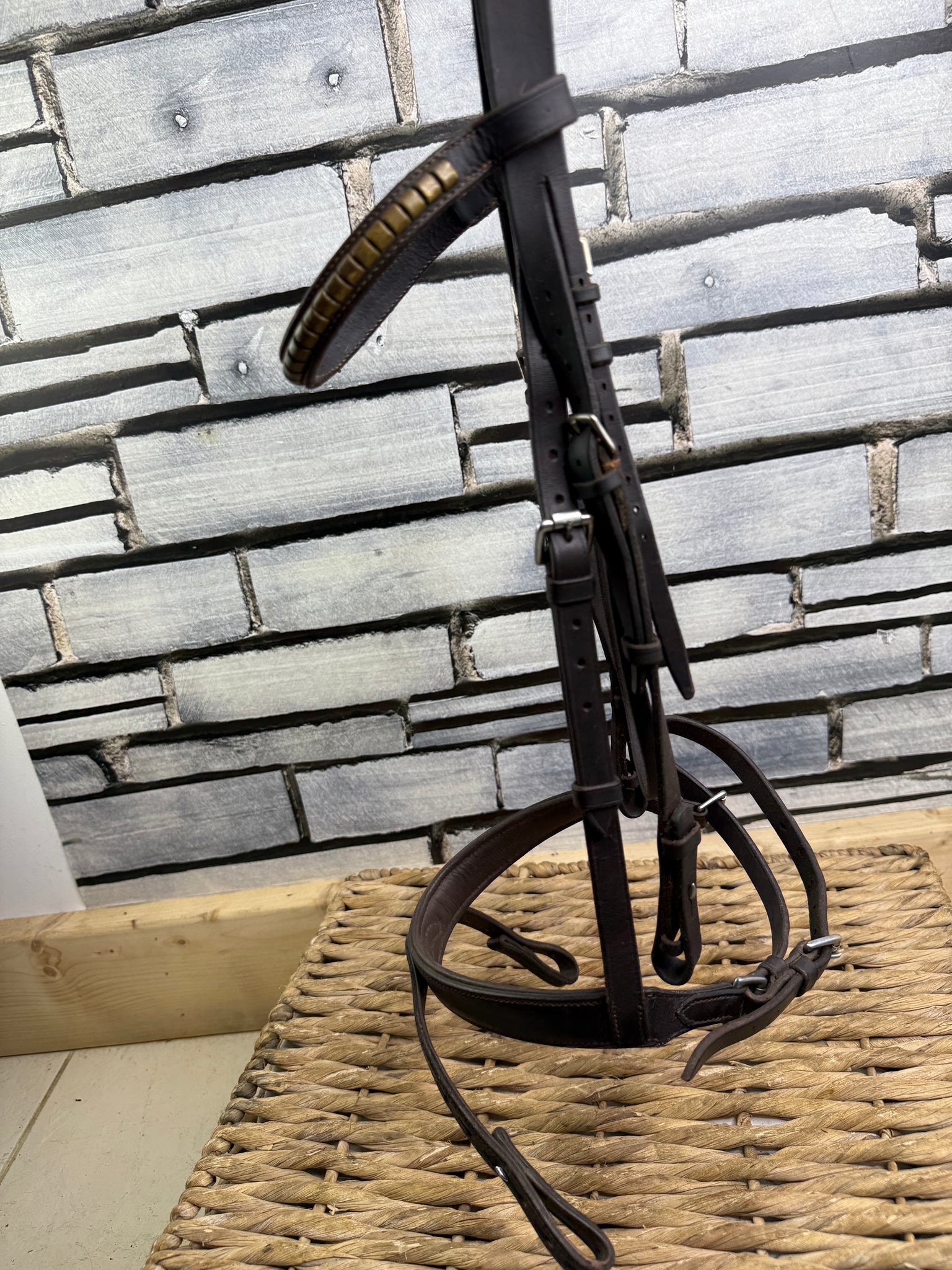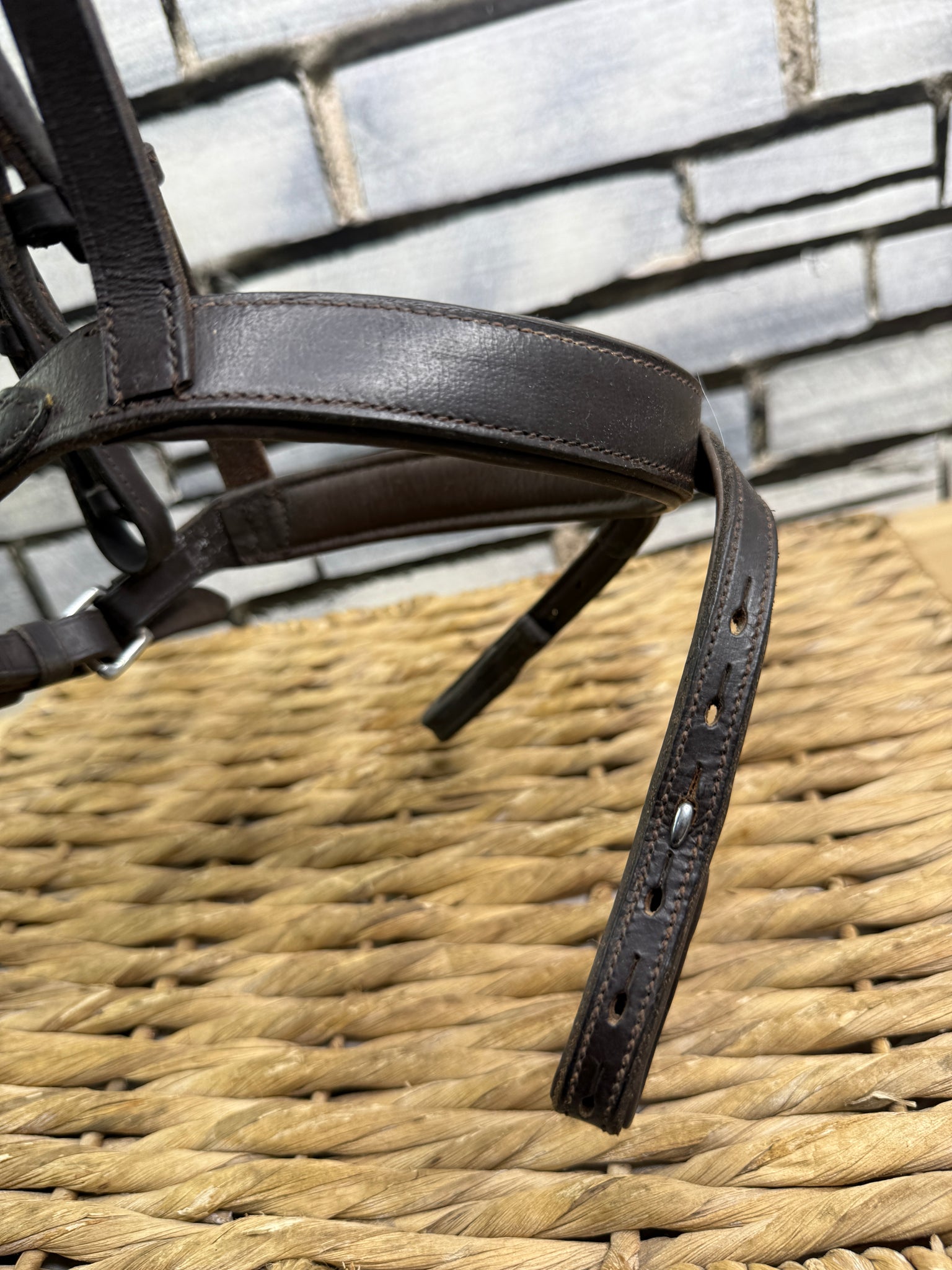 Lovely quality English bridle with Clinchered brow. Worcestershire noseband is broad and padded with loops that fix round the bit ring and disperse some rein pressure over the nose - similar in action to a Kineton.