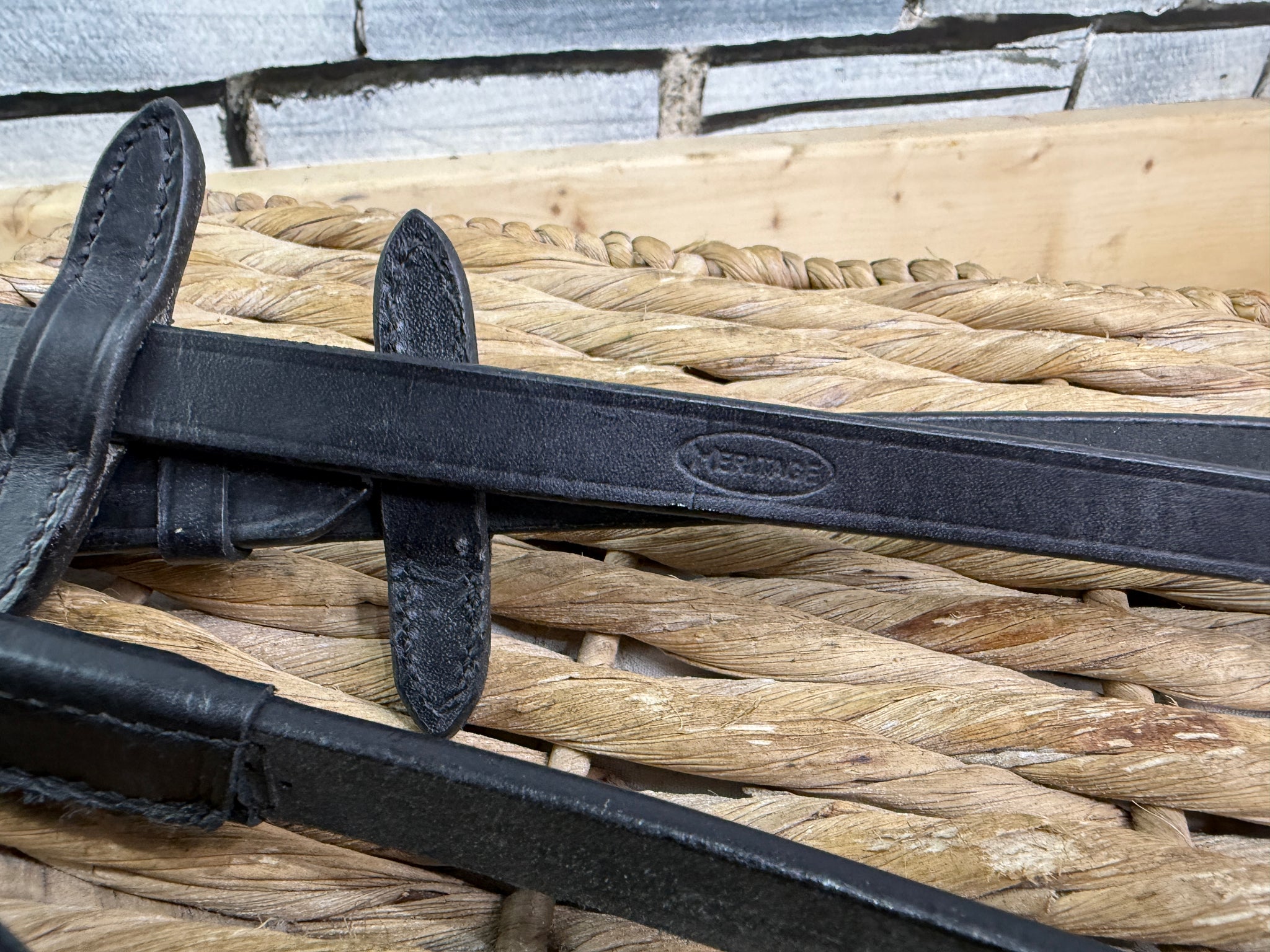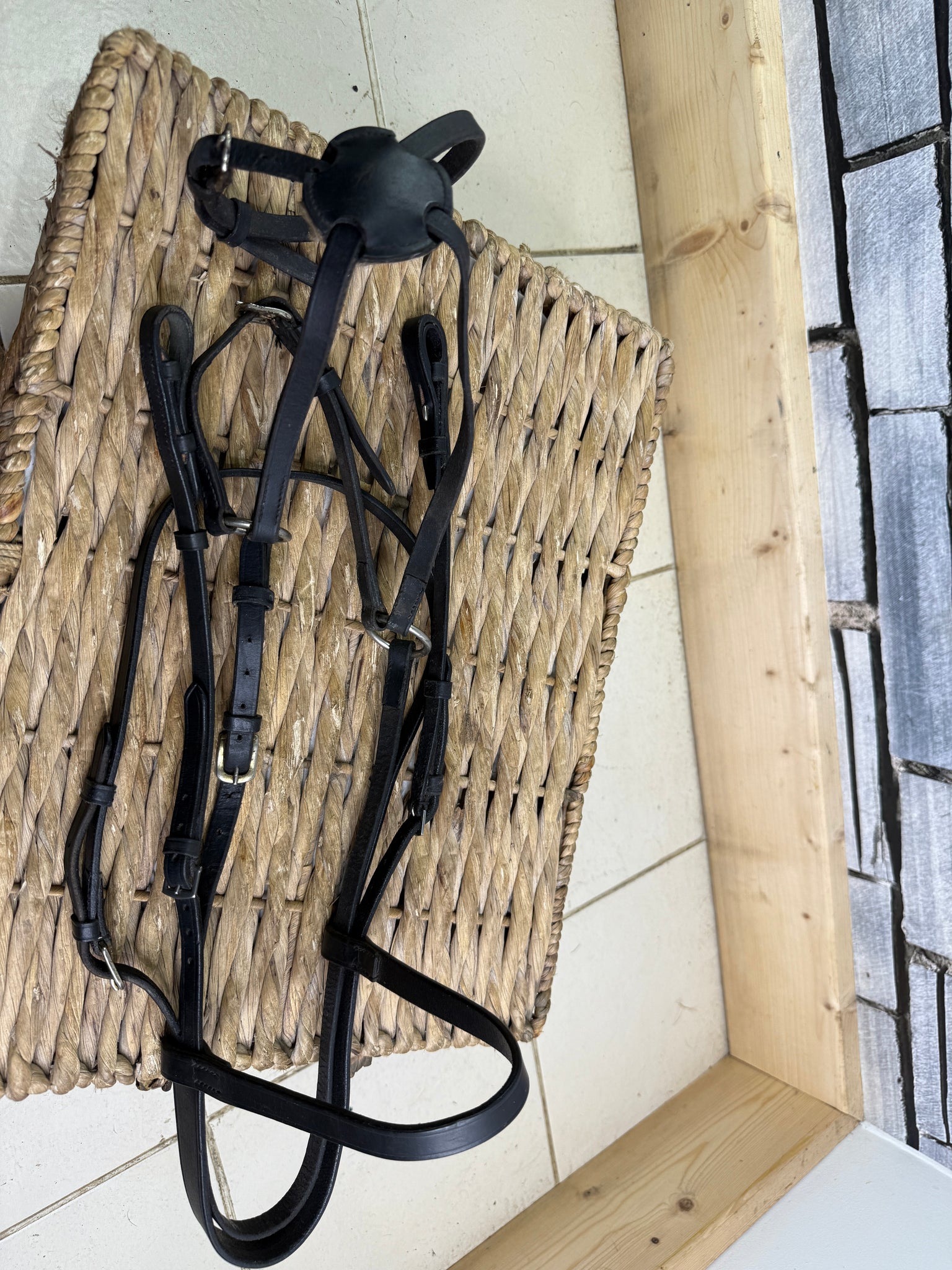 Black. Used but sound - bridle, reins (reins are new) and running martingale . Useful bit of kit. full size.