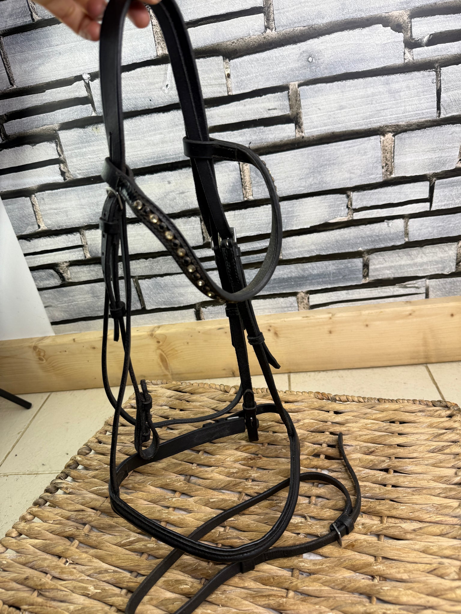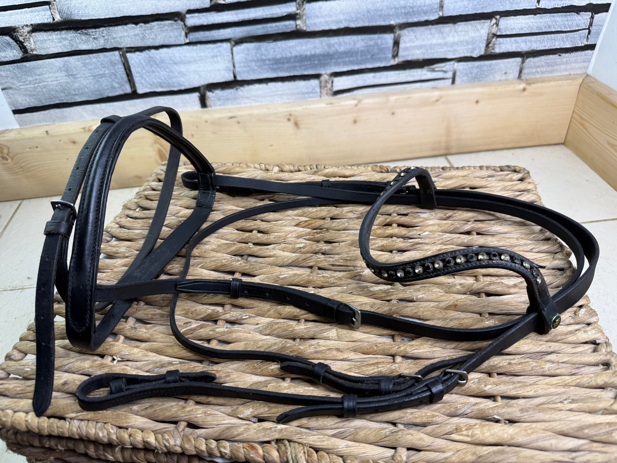 English made flash bridle, used, leather is supple and safe. With a patent black & white crystal and ave browband.