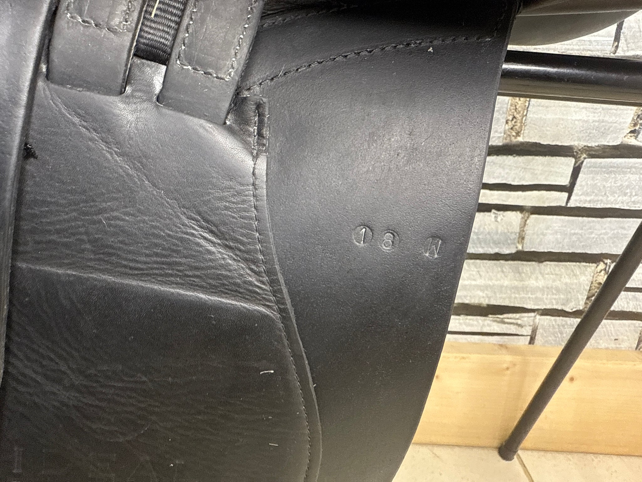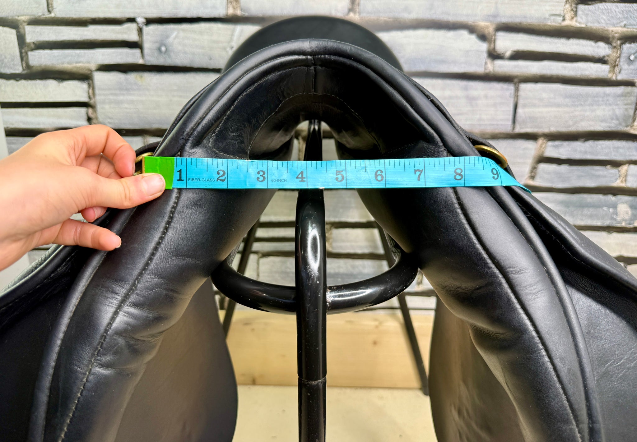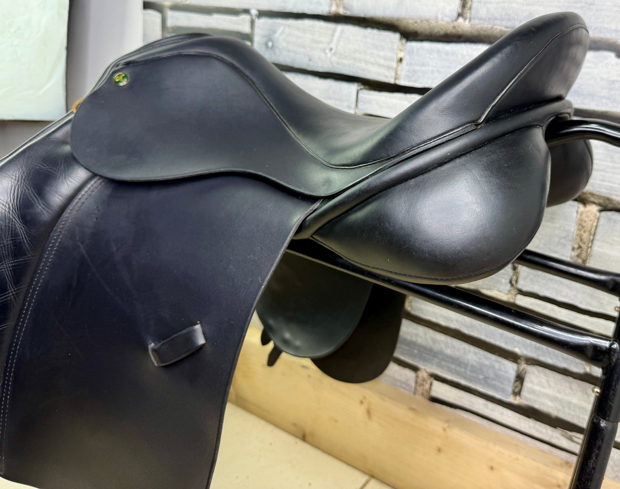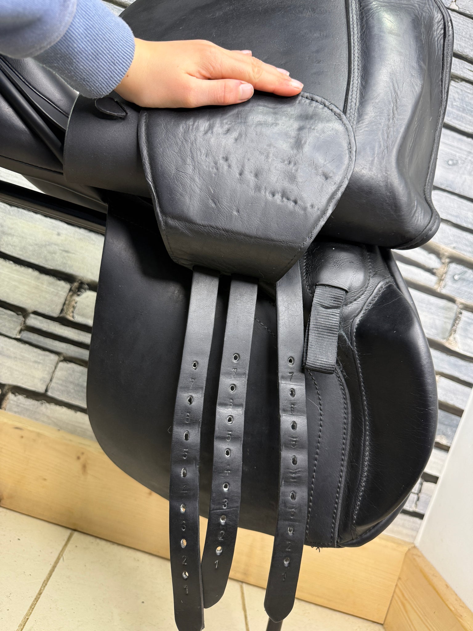 GP558 - Really useful saddle in excellent used condition. Good blocks, moulded knee pad, very comfy. Wool flocked panel. Stamped 18 W, but measures like a 17 1/2”.