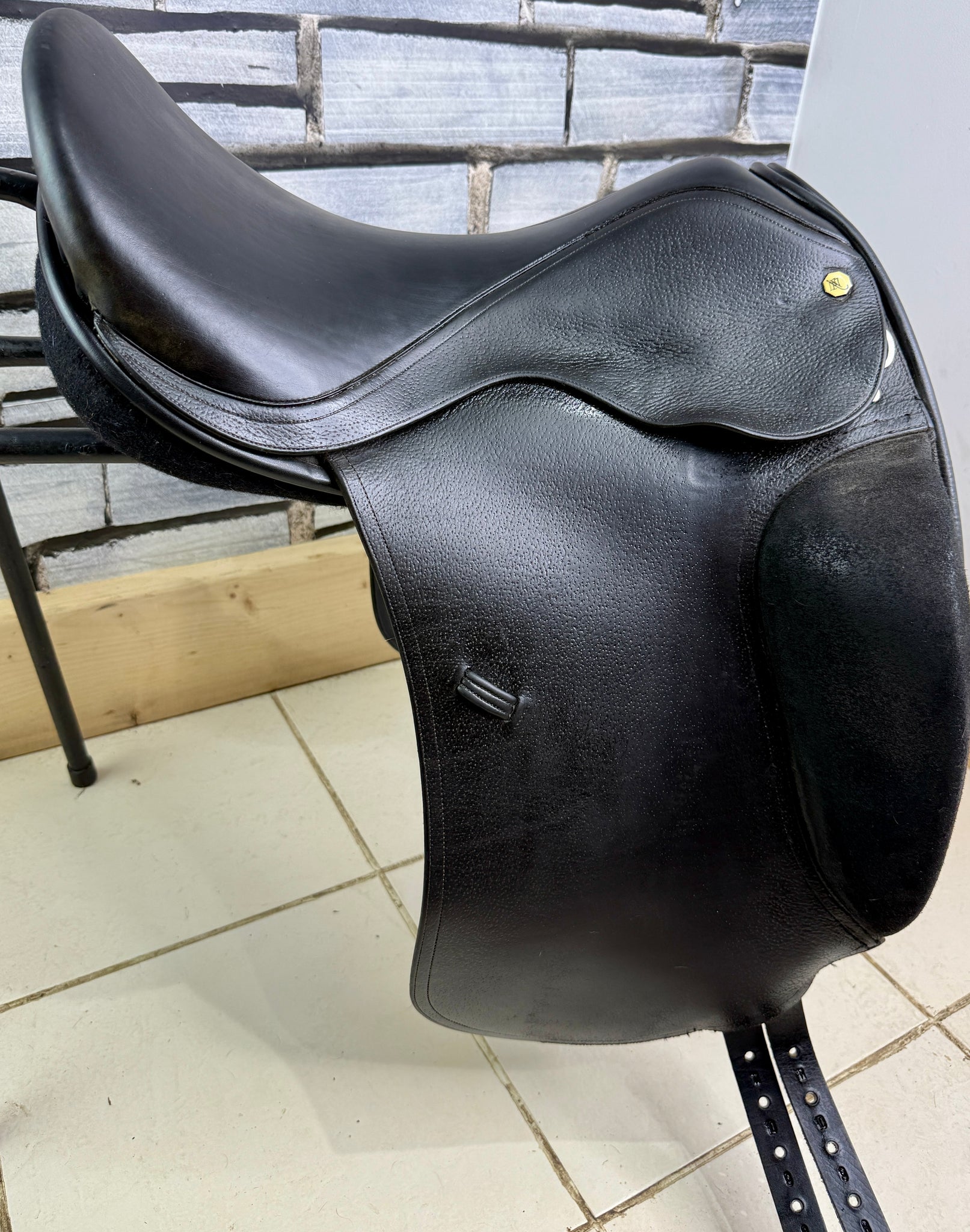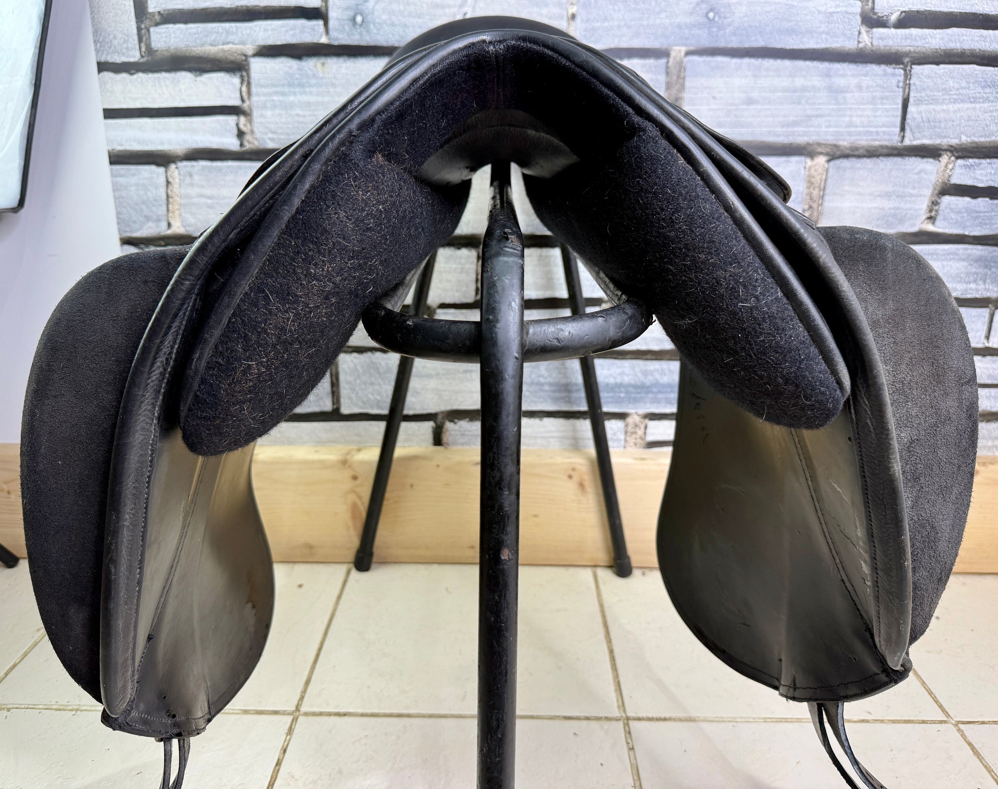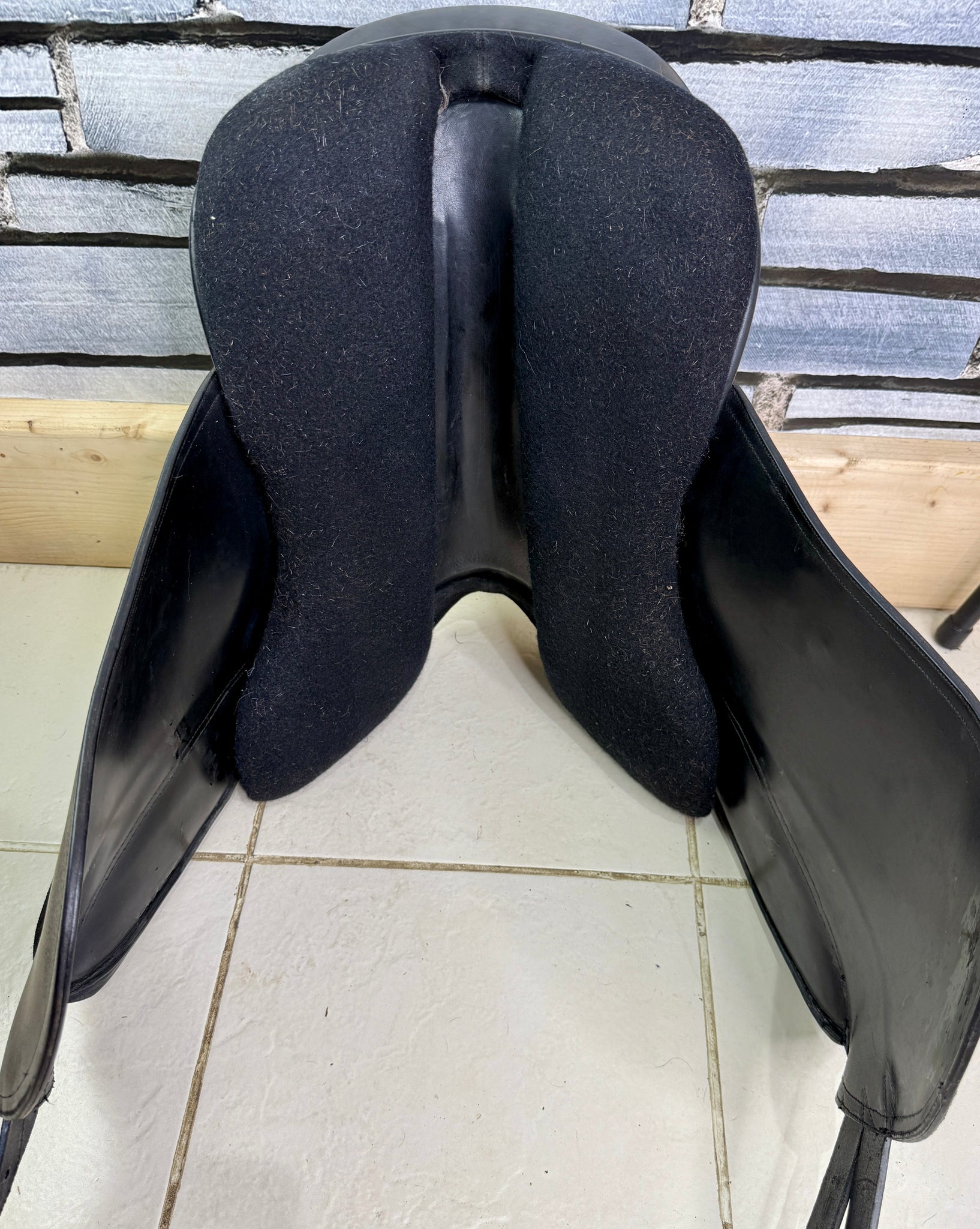 D273 - Smart dressage saddle. Believed made by Nick Dolman. Big, anatomic surface blocks which are mega secure. Half owen panels which suit a horse with a big shoulder and give lots of freedom of movement. Wool flocked serge panel - super soft, warm and comfy for the horse. Wide seat tree gives a wider bearing area for the panels. New straps all round. Ideally suited to a chunky native type - broad, short panels suit a compact, flat back.
