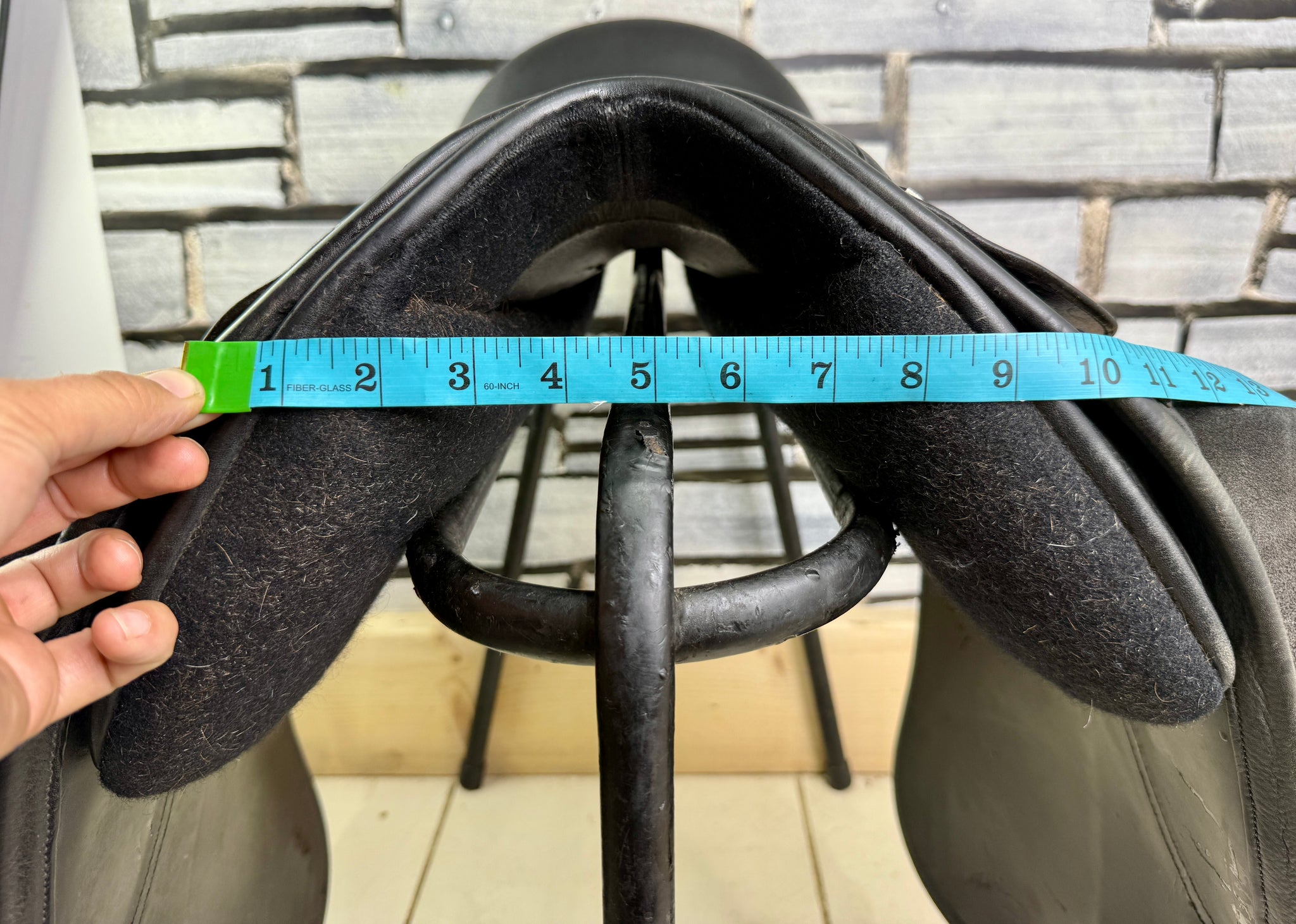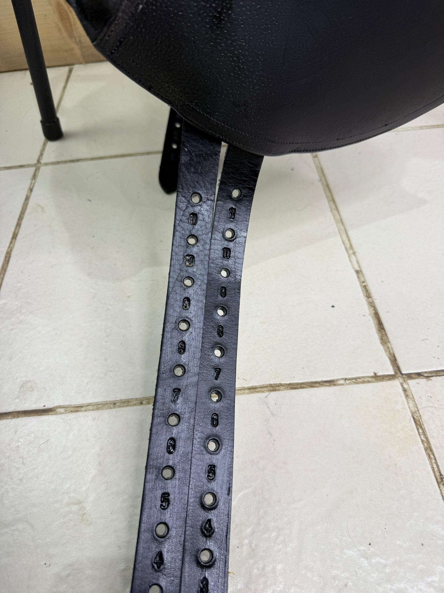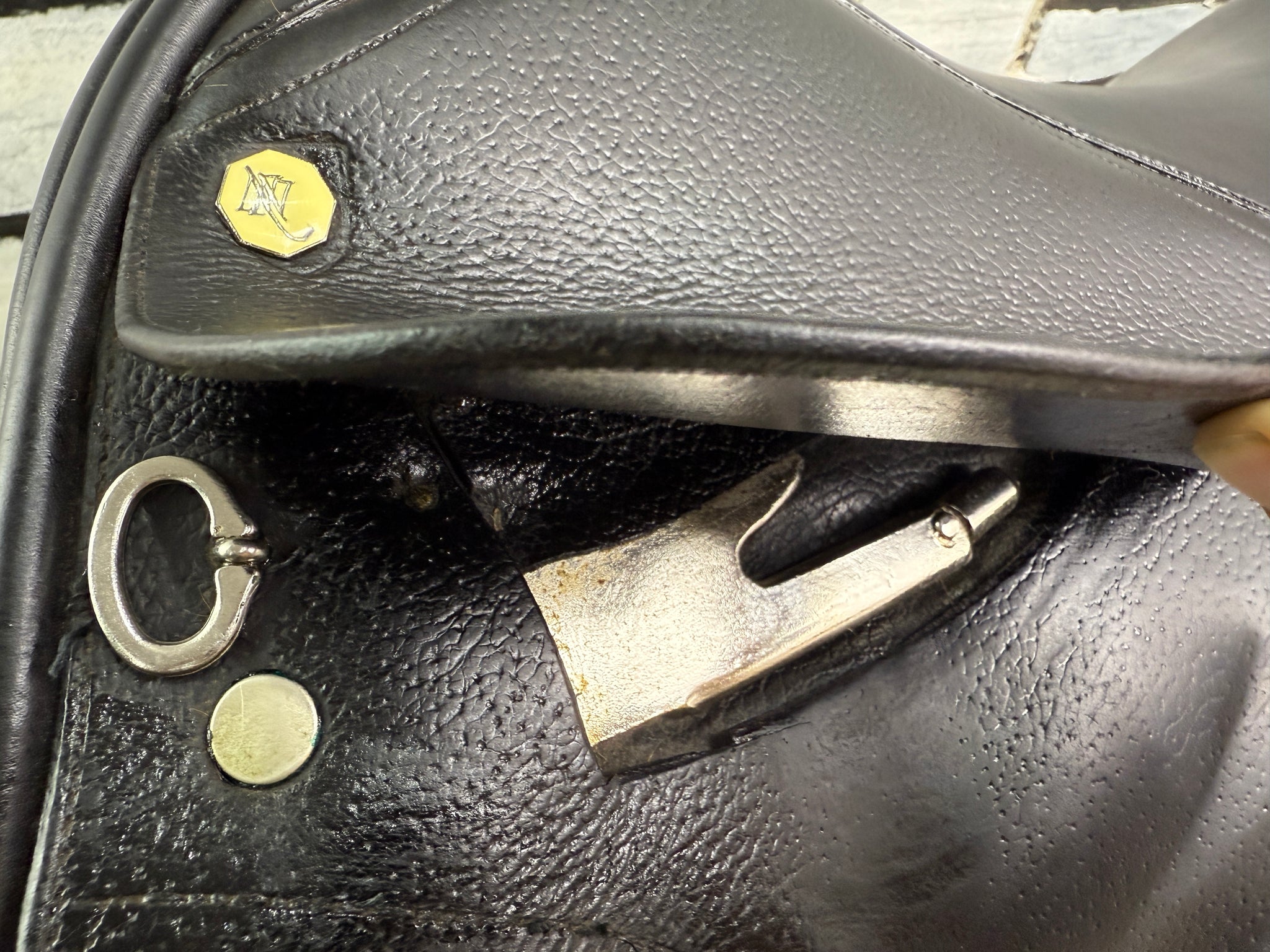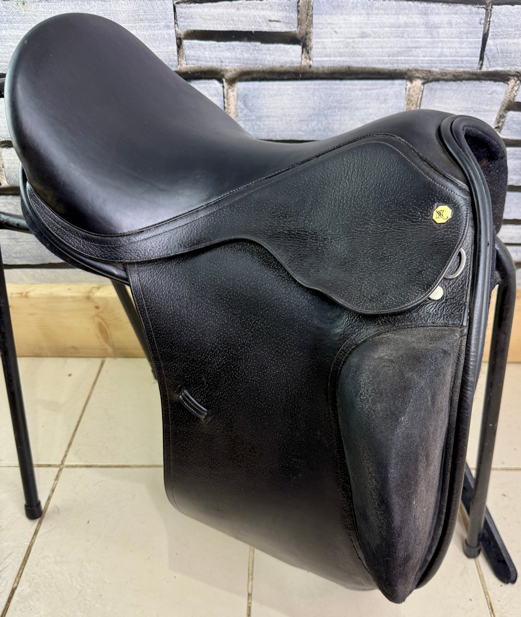 D273 - Smart dressage saddle. Believed made by Nick Dolman. Big, anatomic surface blocks which are mega secure. Half owen panels which suit a horse with a big shoulder and give lots of freedom of movement. Wool flocked serge panel - super soft, warm and comfy for the horse. Wide seat tree gives a wider bearing area for the panels. New straps all round. Ideally suited to a chunky native type - broad, short panels suit a compact, flat back.