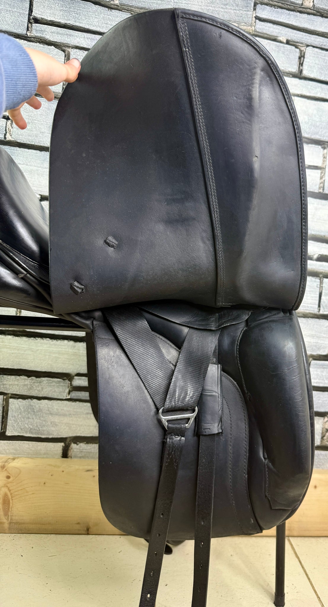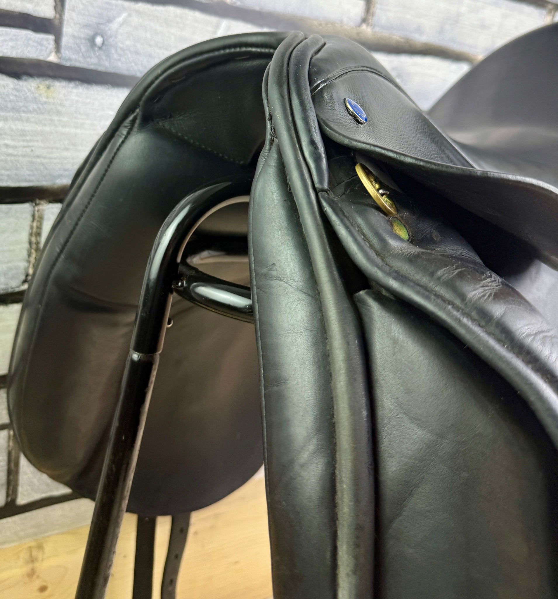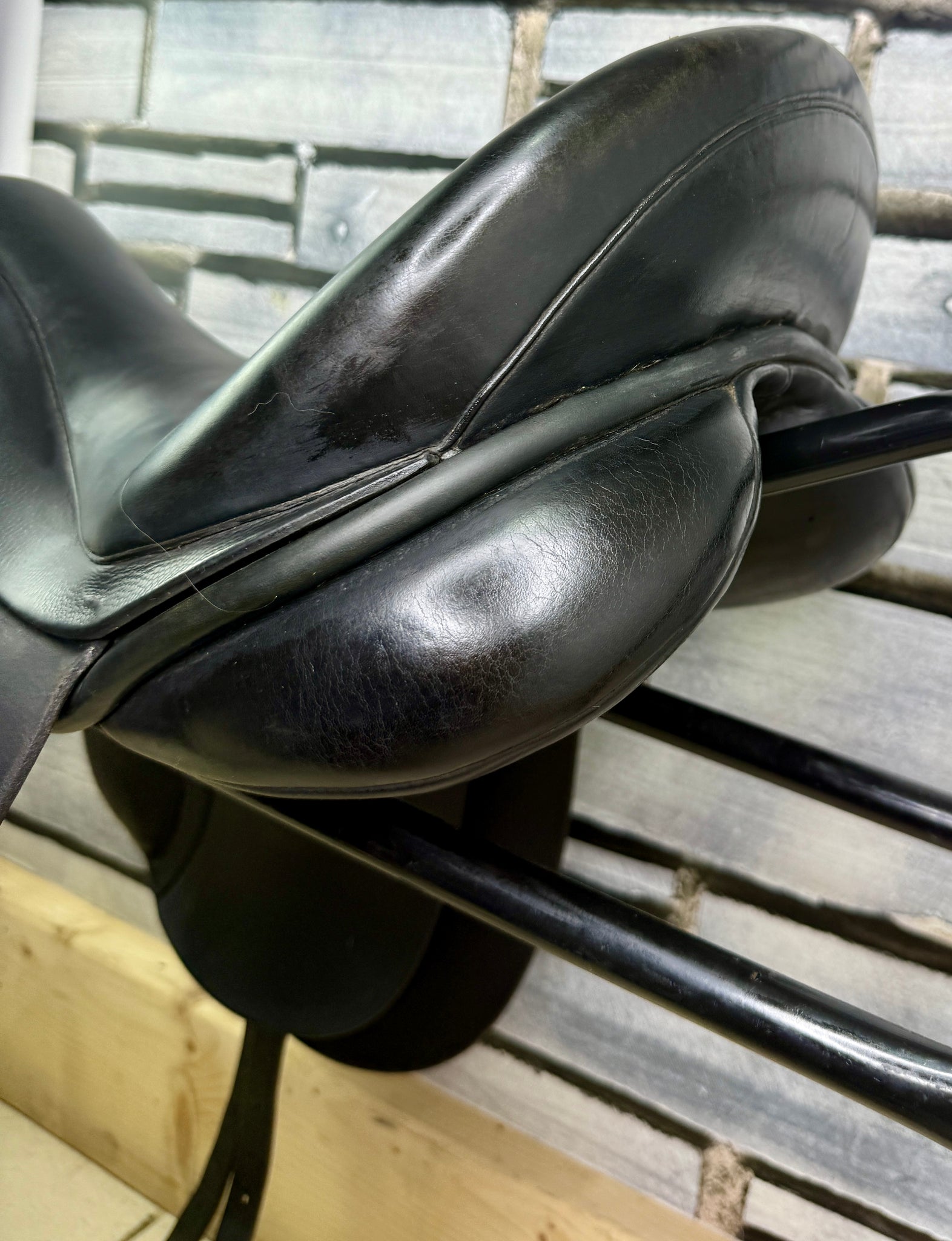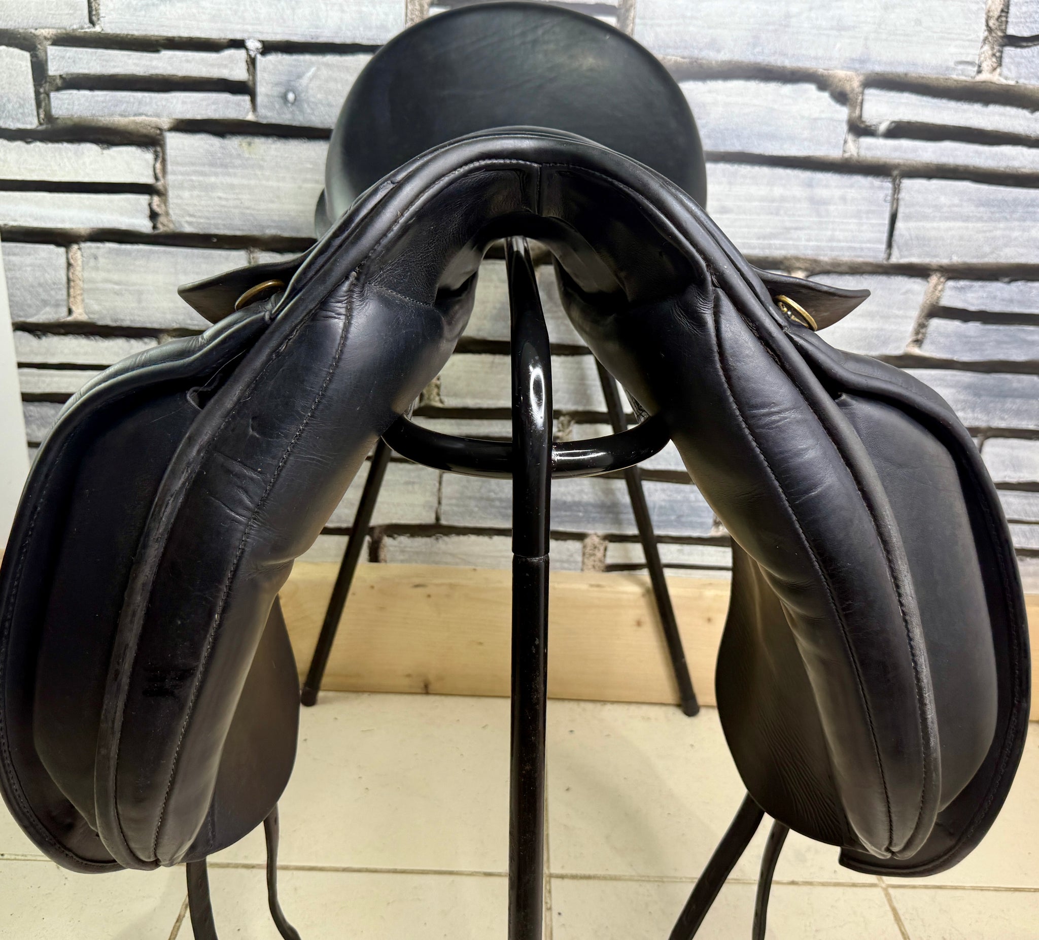 D280 - Front & back gussets. Deep seat, big blocks with moulded knee pads. Soft wool flocked panel. No point strap to alleviate shoulder pressure. Excellent condition. No size stamps.