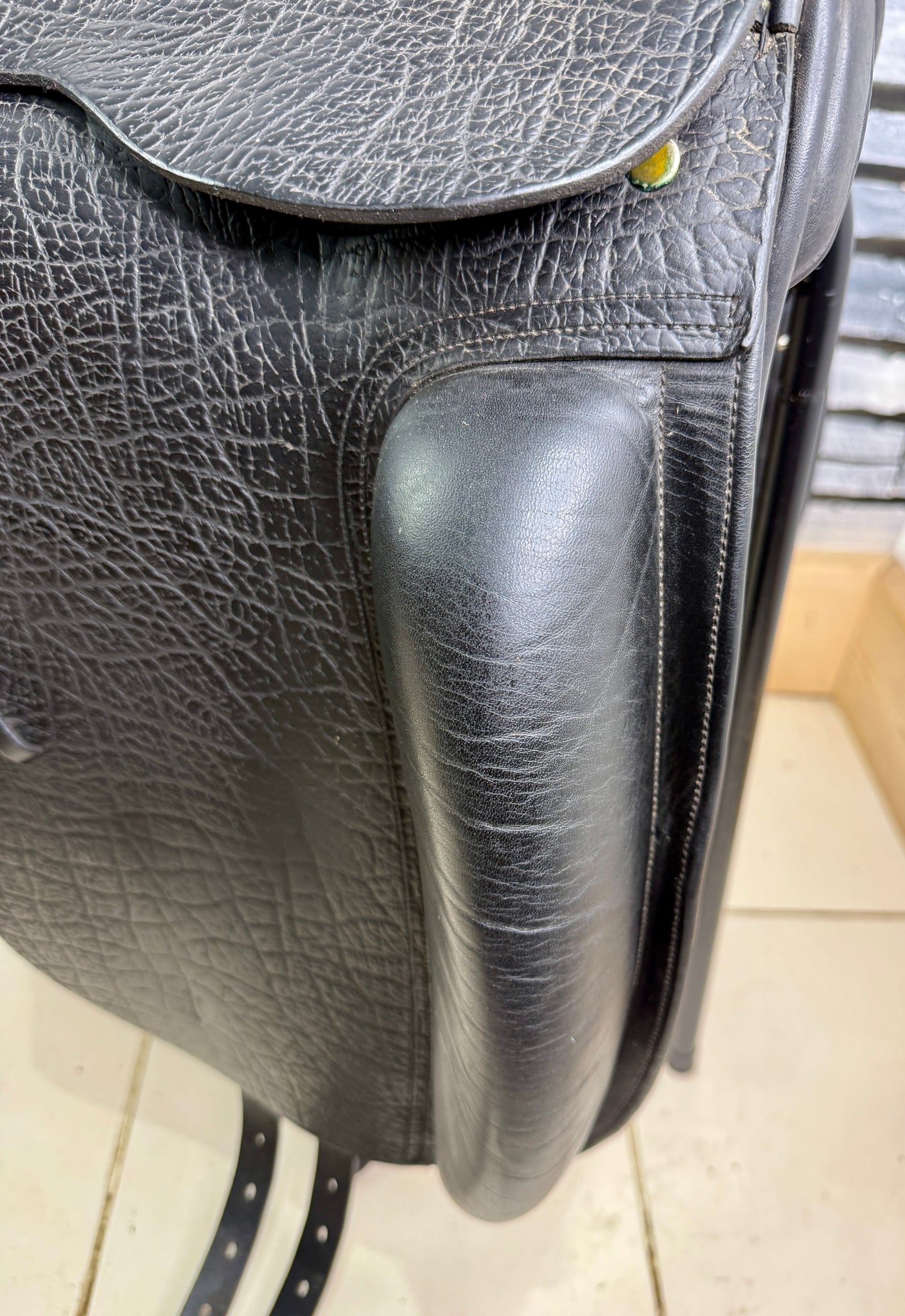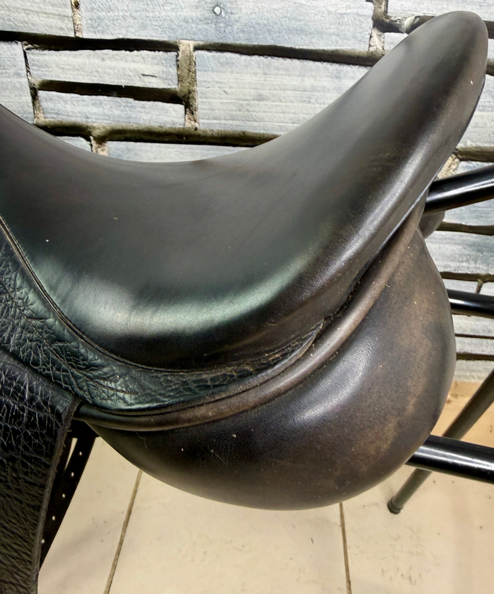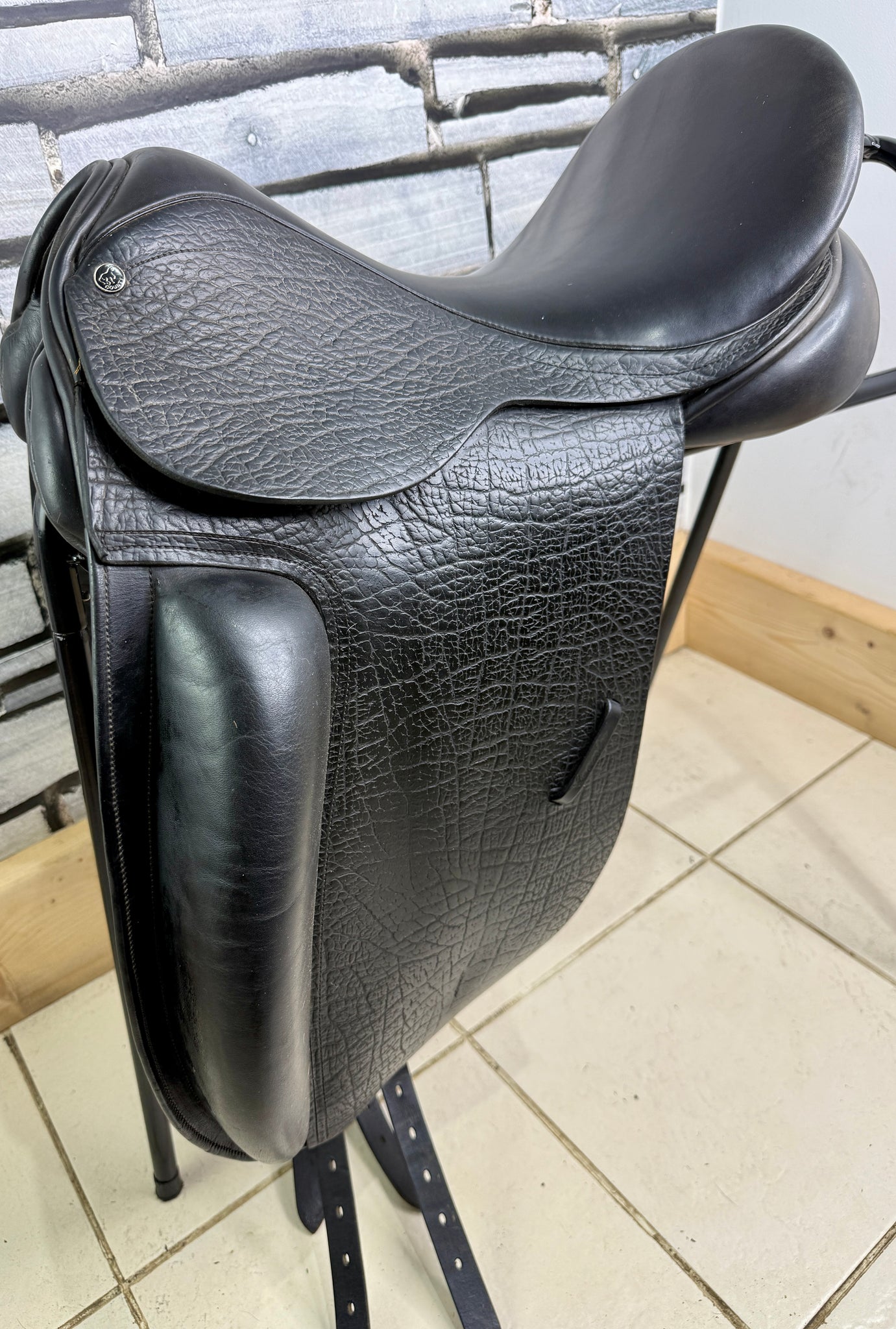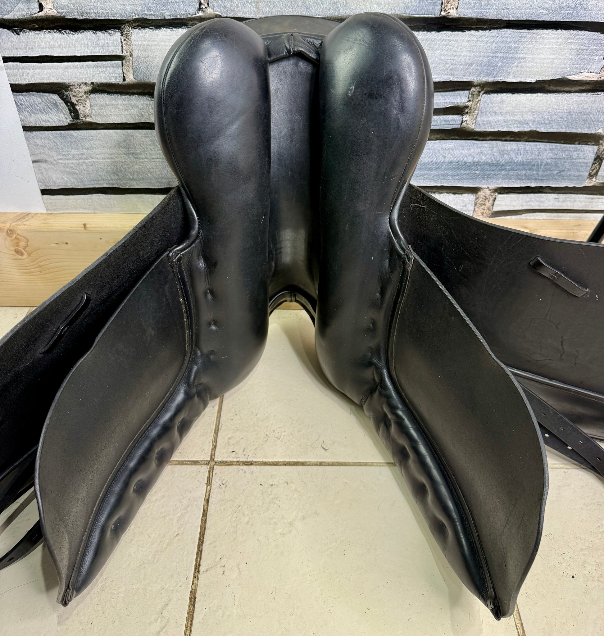D300 - Gorgeous quality English made dressage saddle. Beautiful leather - flaps and skirt are grippy buffalo leather which is so supple. Soft padded seat & big anatomical surface blocks. Deep seat. Front gussets and a drop panel so will suit a high wither. Wool flocked panel.