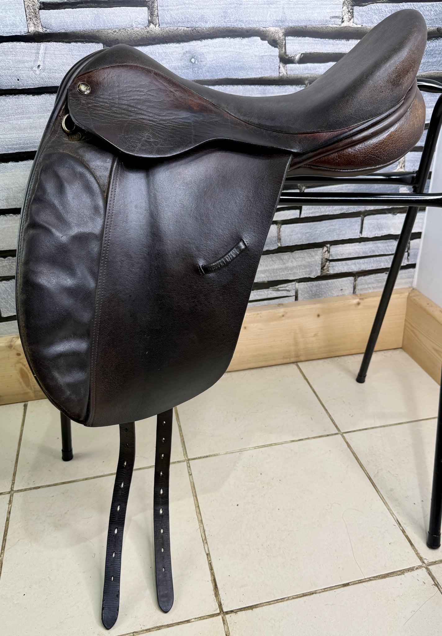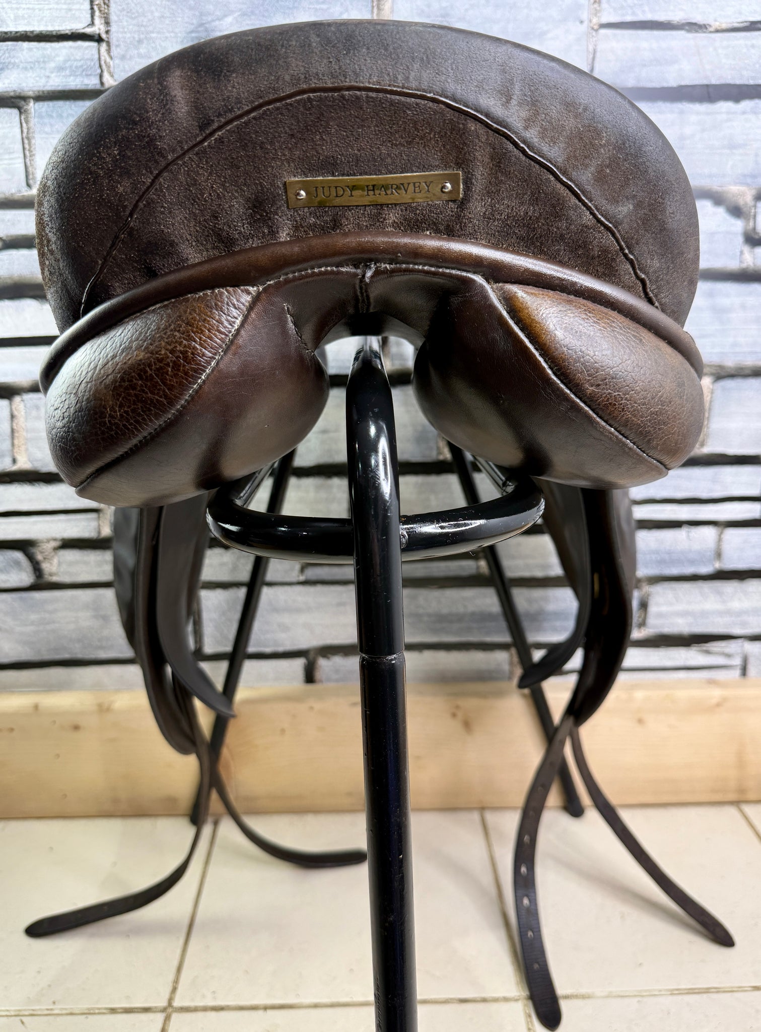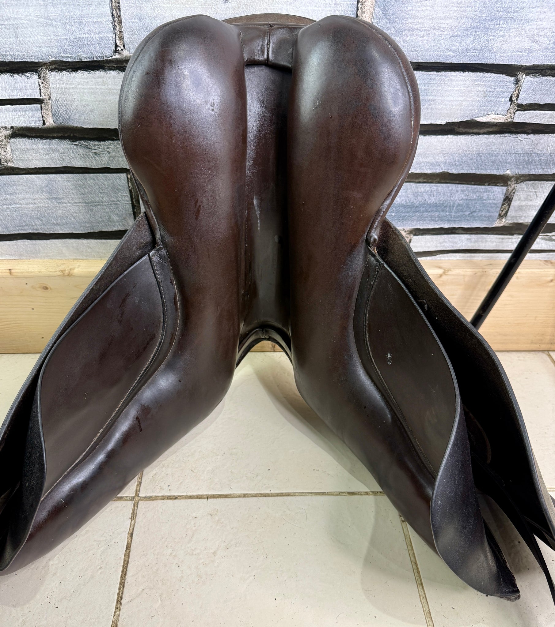 D294 - Well used condition, but tidy and safe! Big blocks. Point straps for extra stability. Wool flocked panel. Fab saddles - this was made for the National Saddle Centre, and has soft buffalo leather flaps with a suede seat & knees.