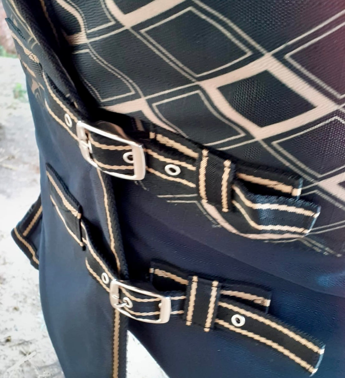 black/gold. 1200D extra strength ripstop turnout rug, with 50g polyfill with standard neck. Made using quality waterproof /breathable material this rug really looks the part. With cross surcingles, large tail flap, elasticated leg straps and twin chest buckles this rug offers great value,
