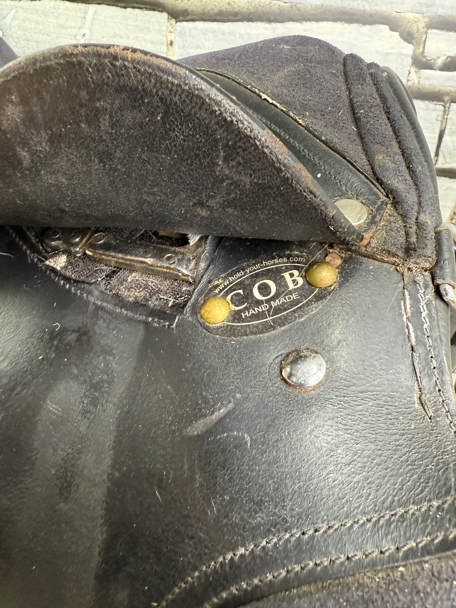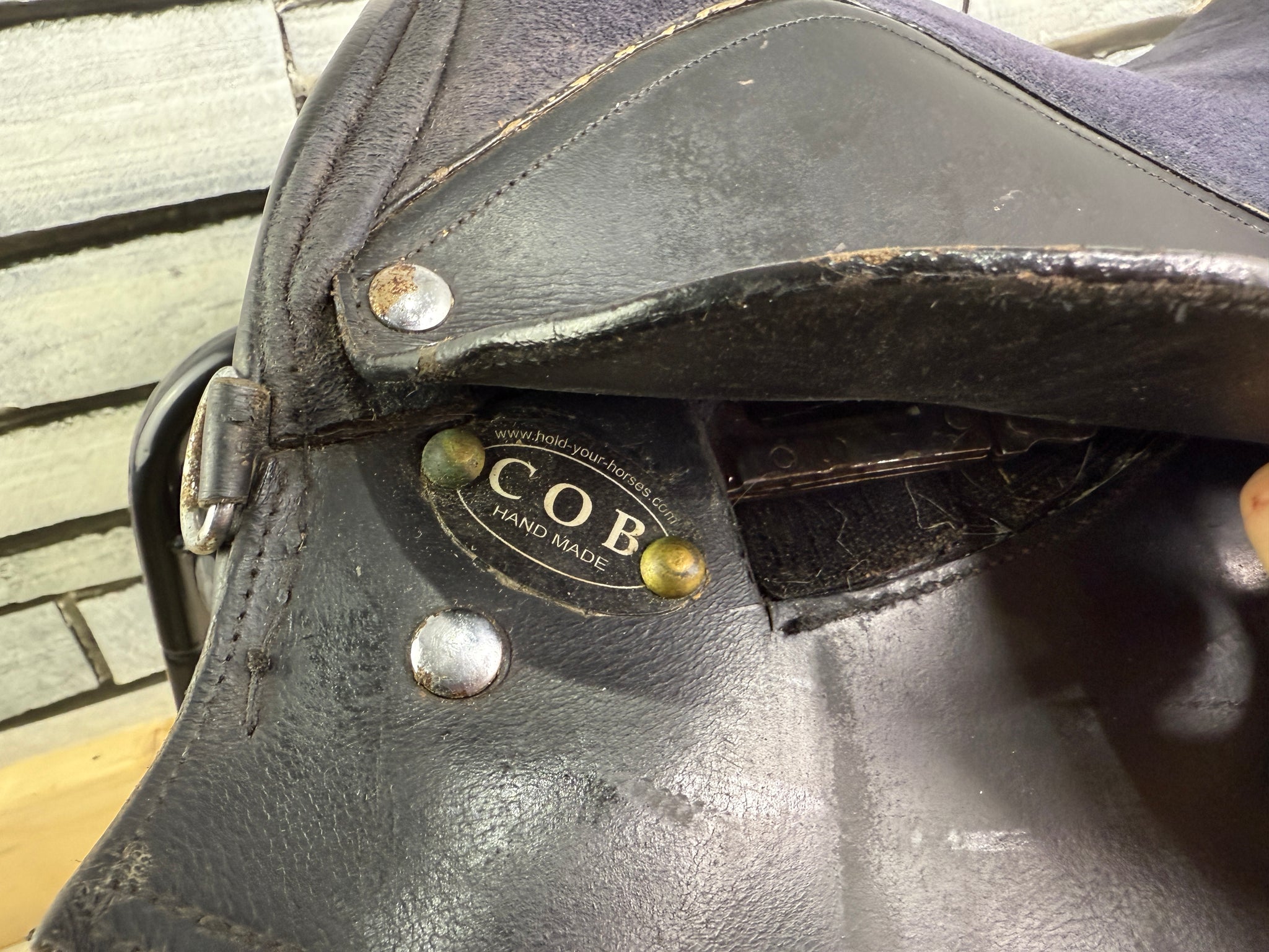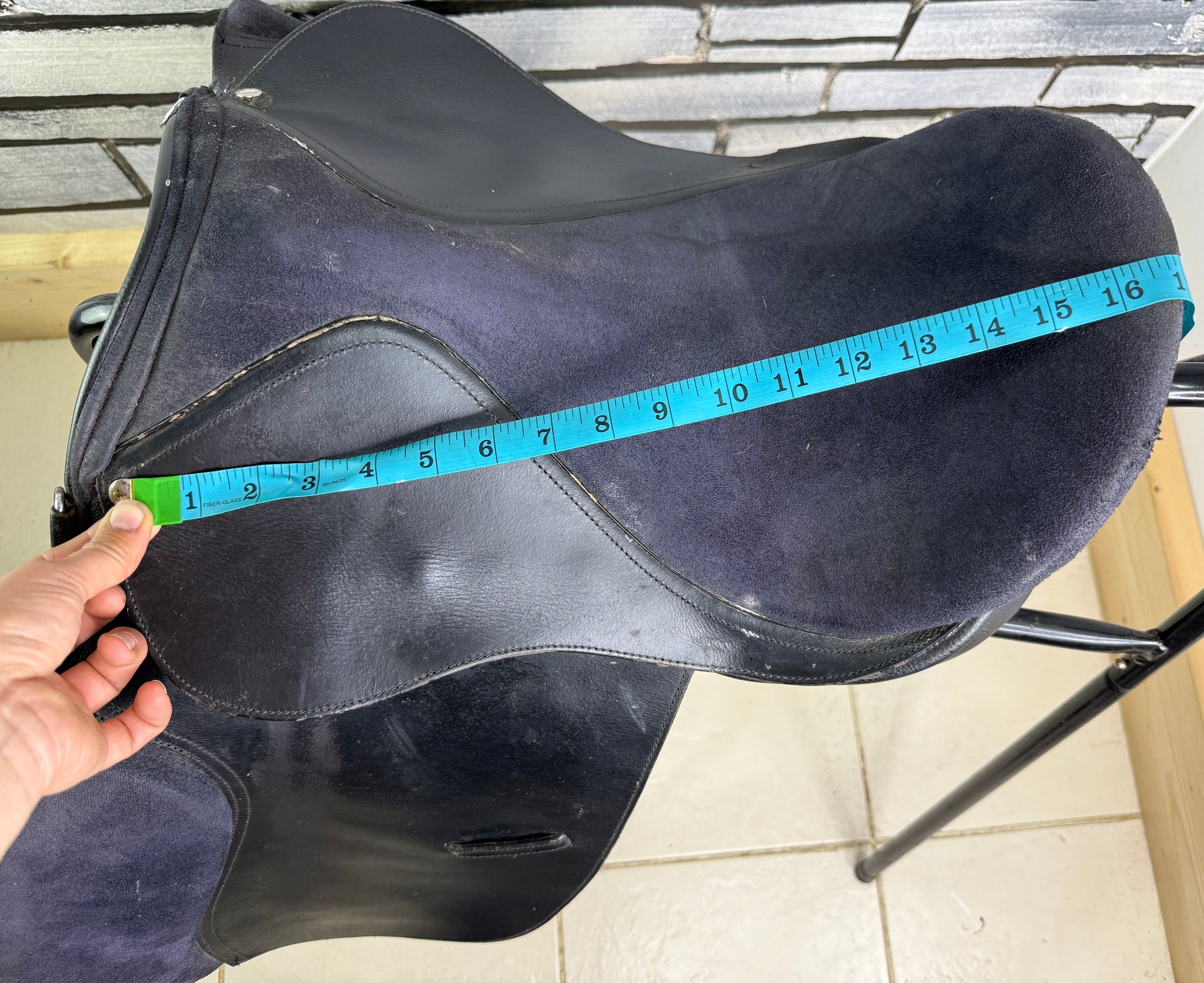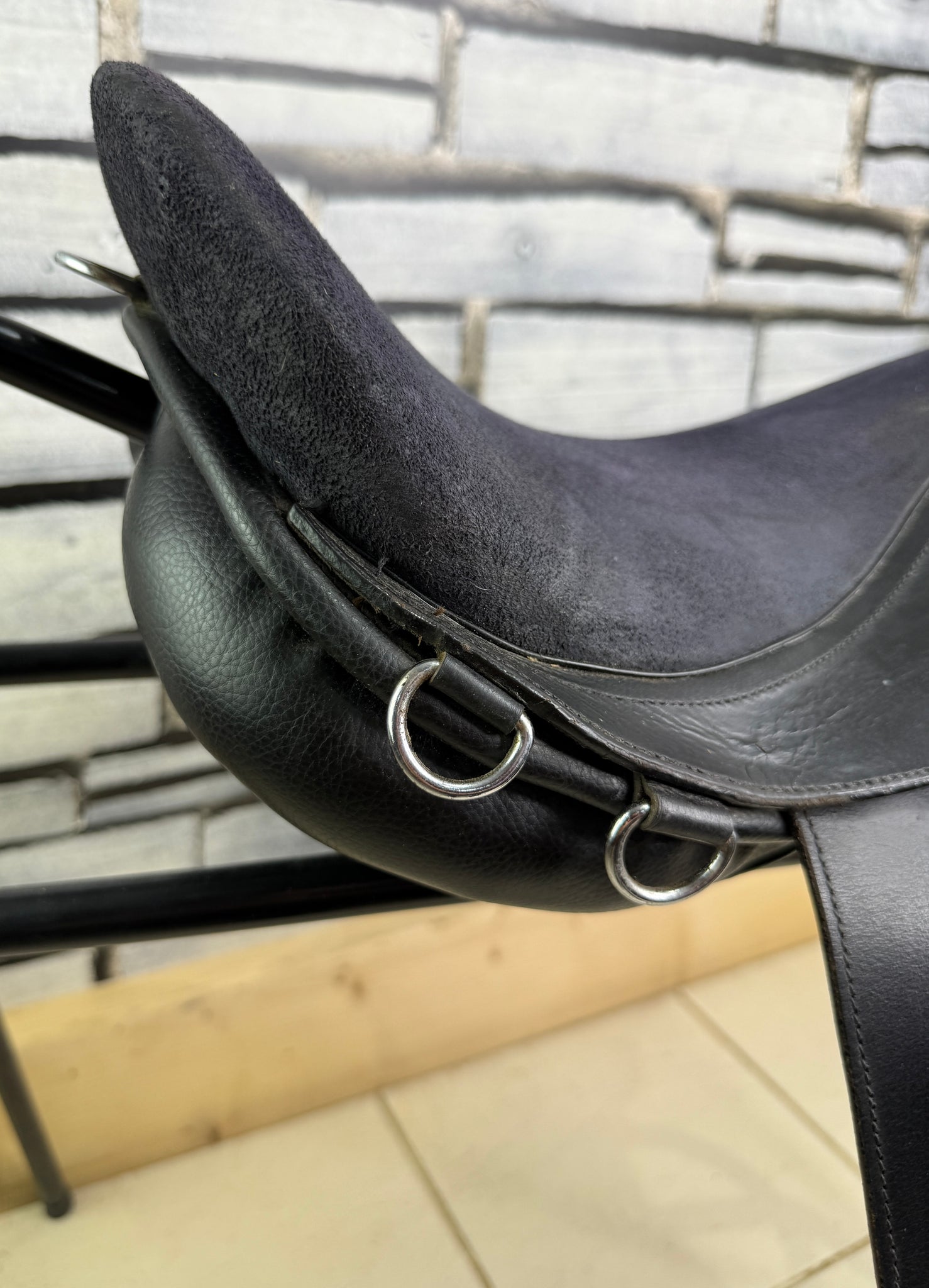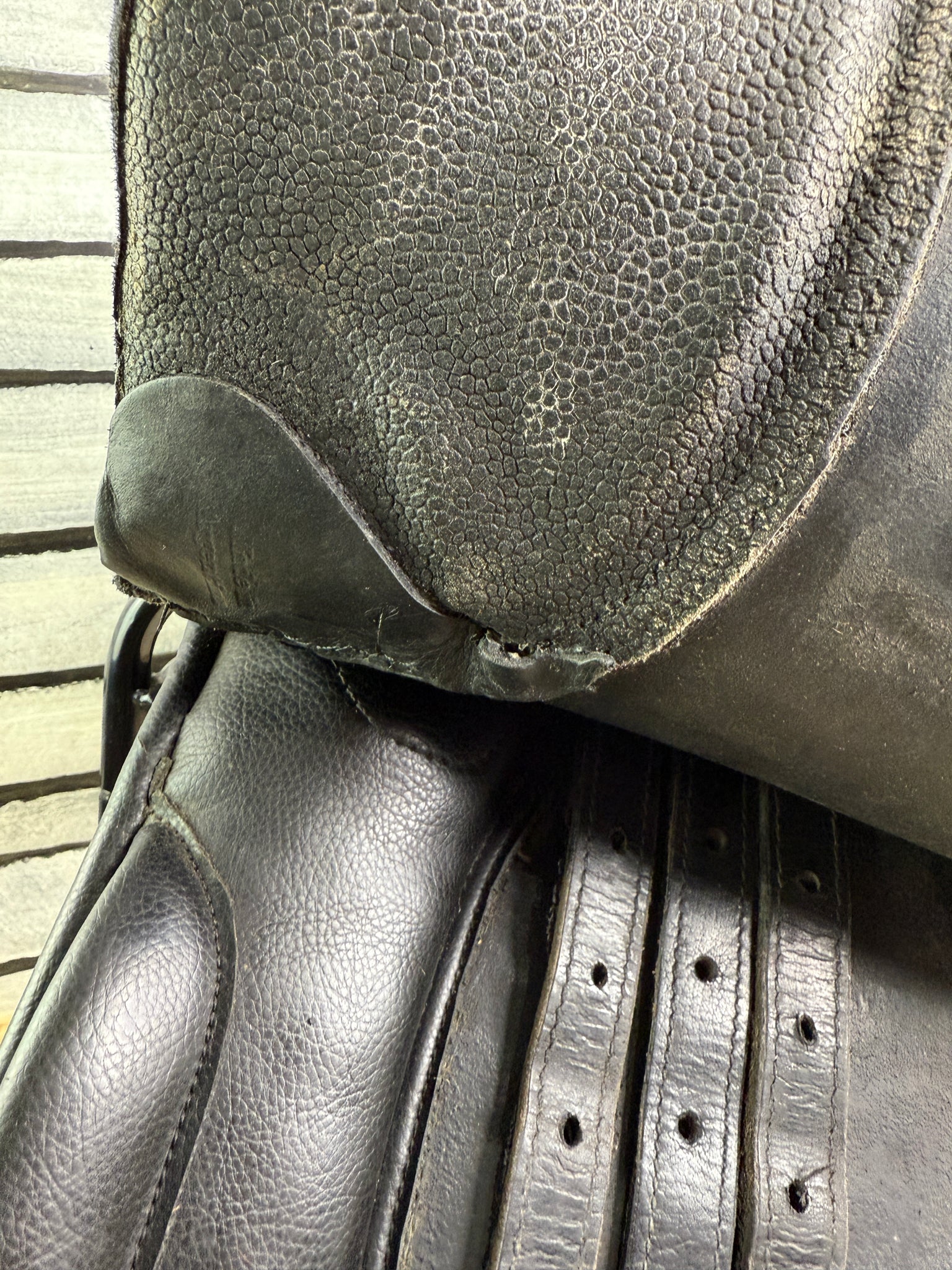 Suede type seat & knees. Has a patch/repair on the back of one knee pad. Good used condition.