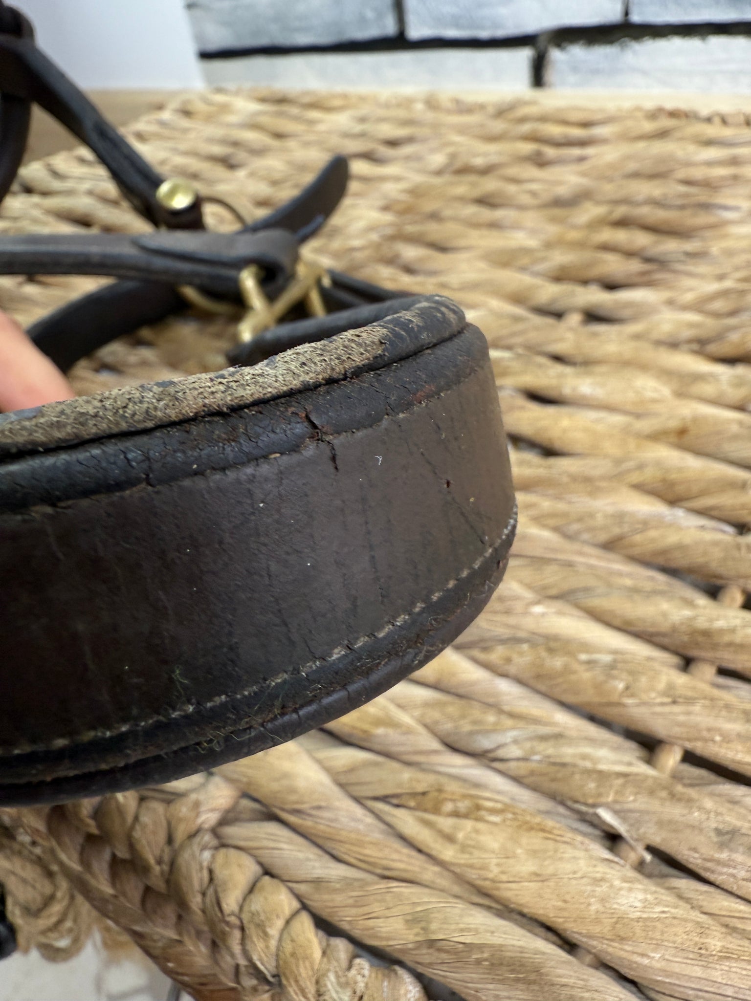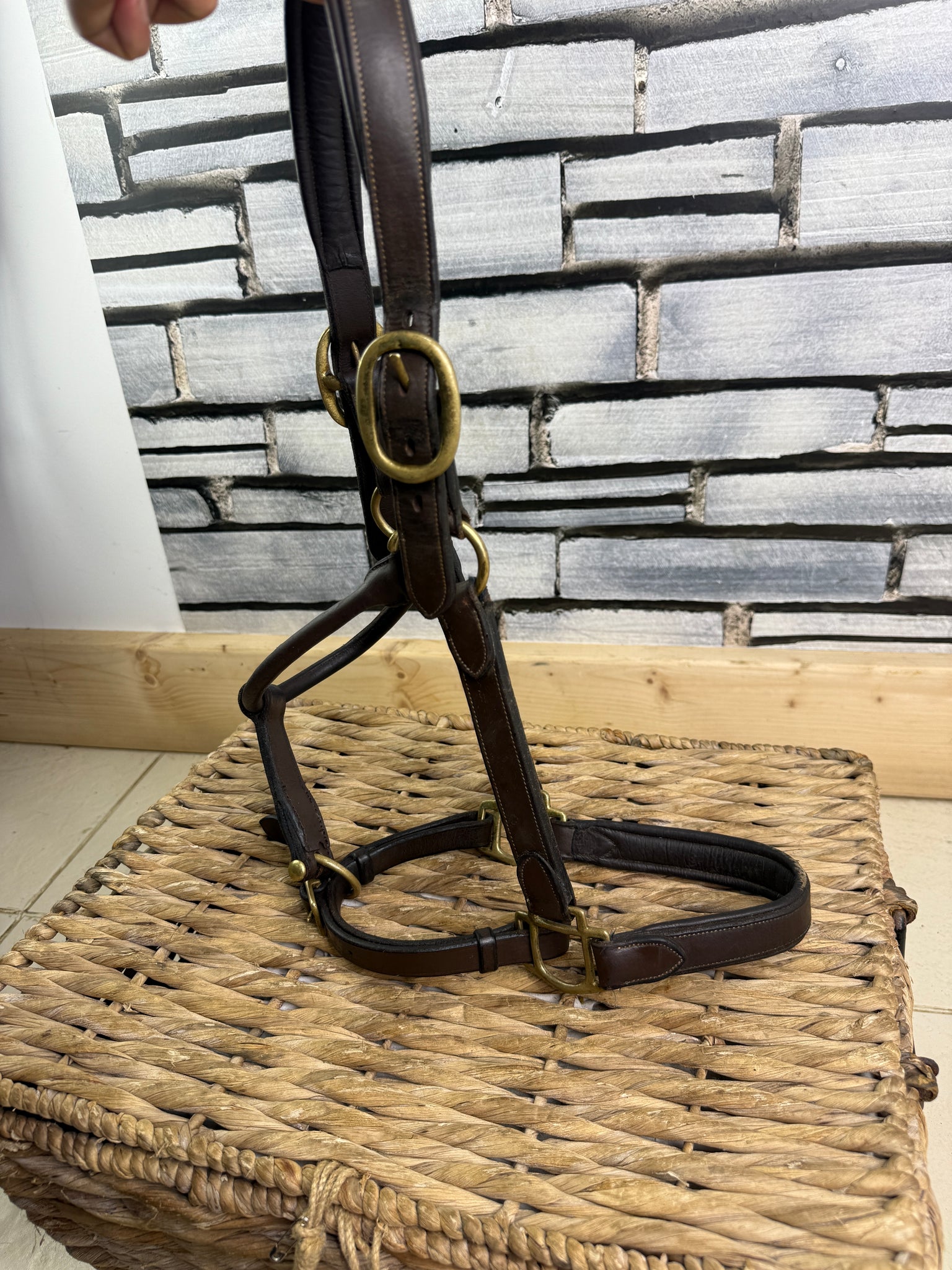 Good quality headcollar. Has had a neat repair to the back of the nose and has a scuff on the front of the nose. Clip throat & double buckle.
