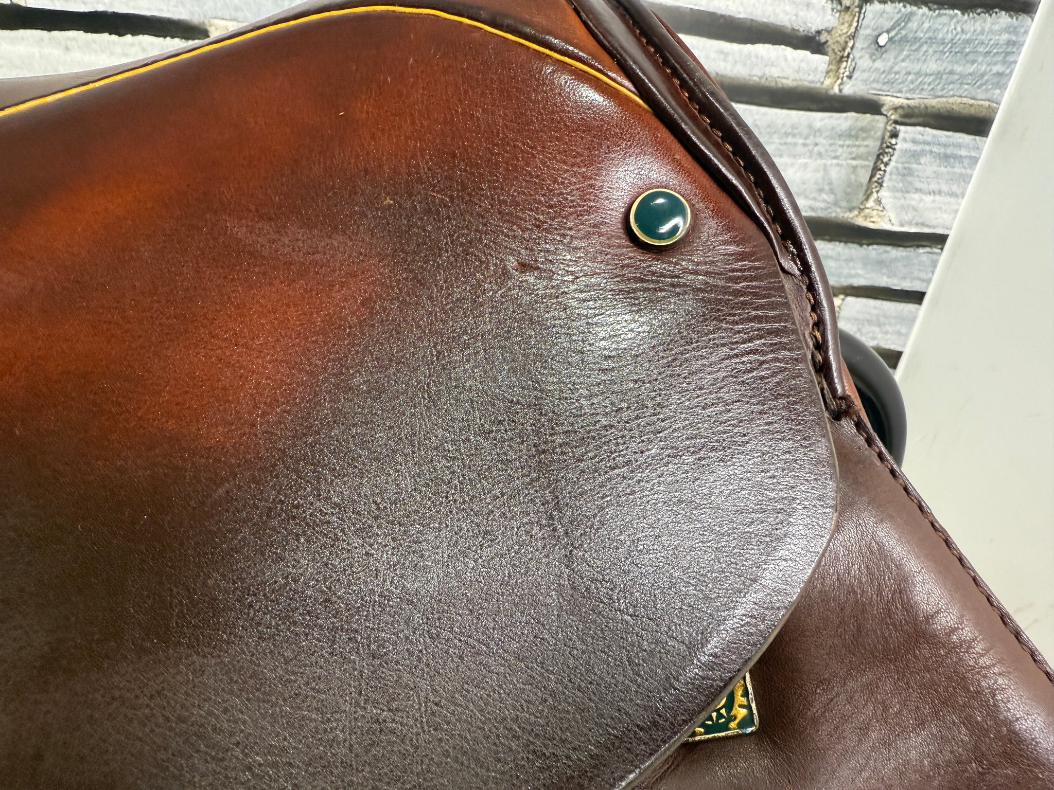 J442 - Really smart saddle! Never actually used - it’s been on display in the Ralph Lauren store! Few marks from being moved around the shop but nothing that affects use. Square cantle. Triangular jumping blocks. Flocked panel.