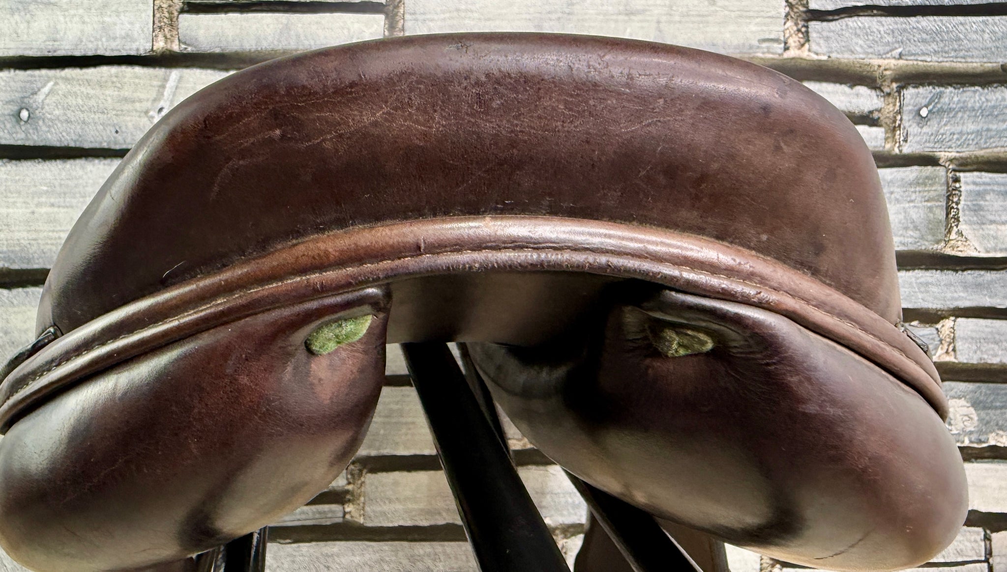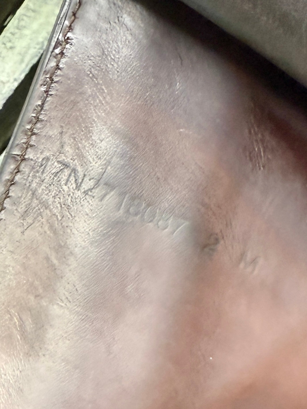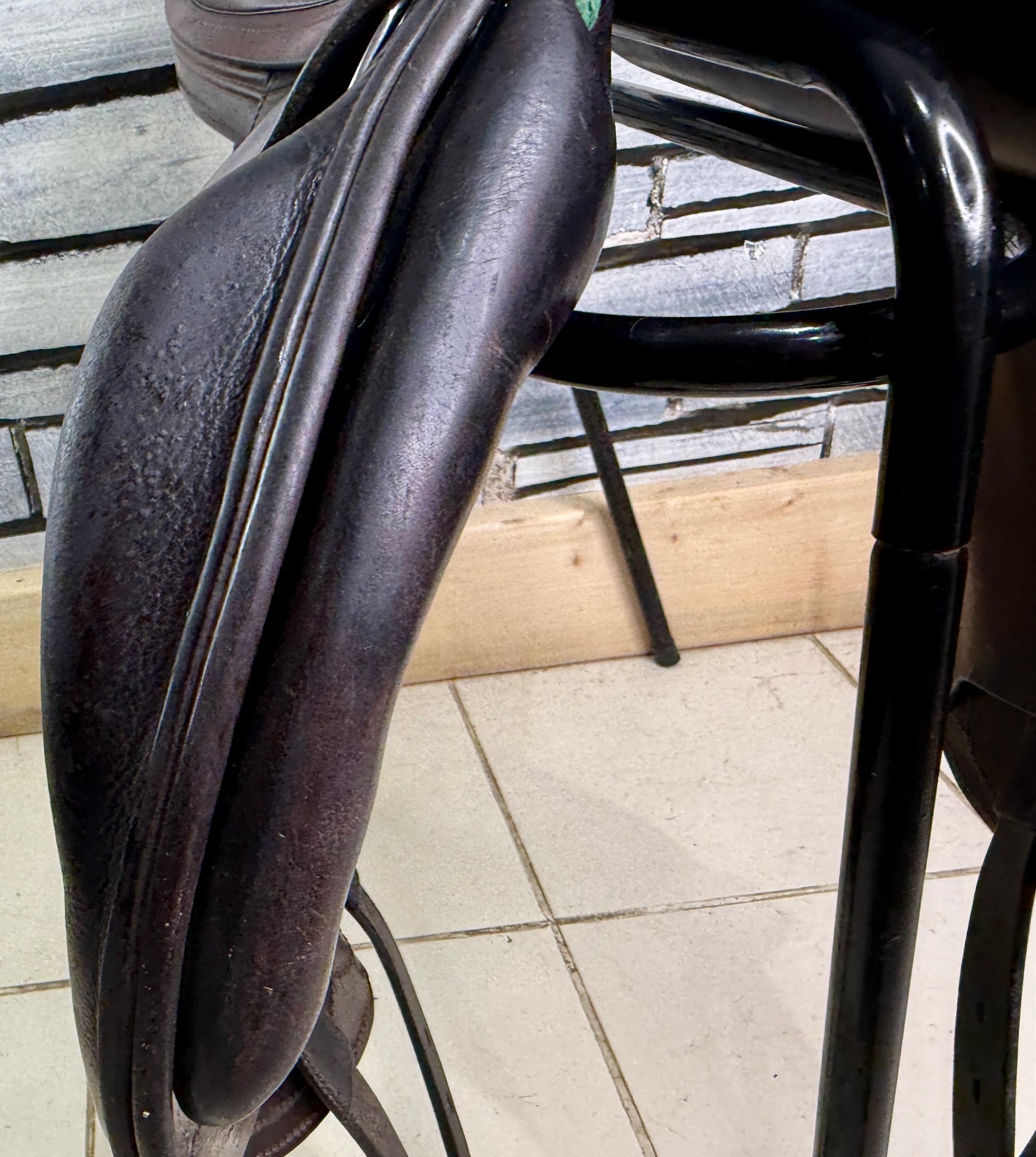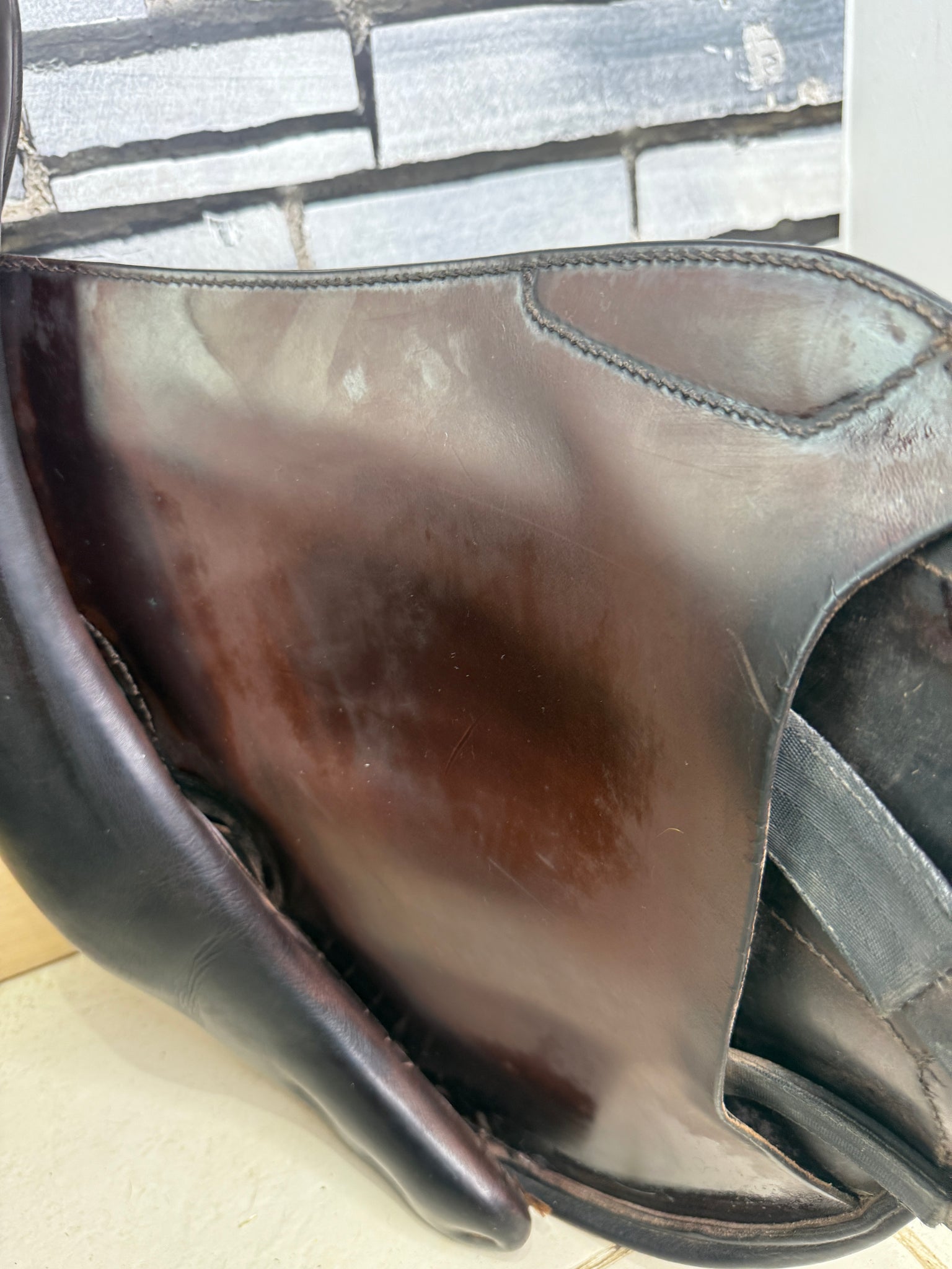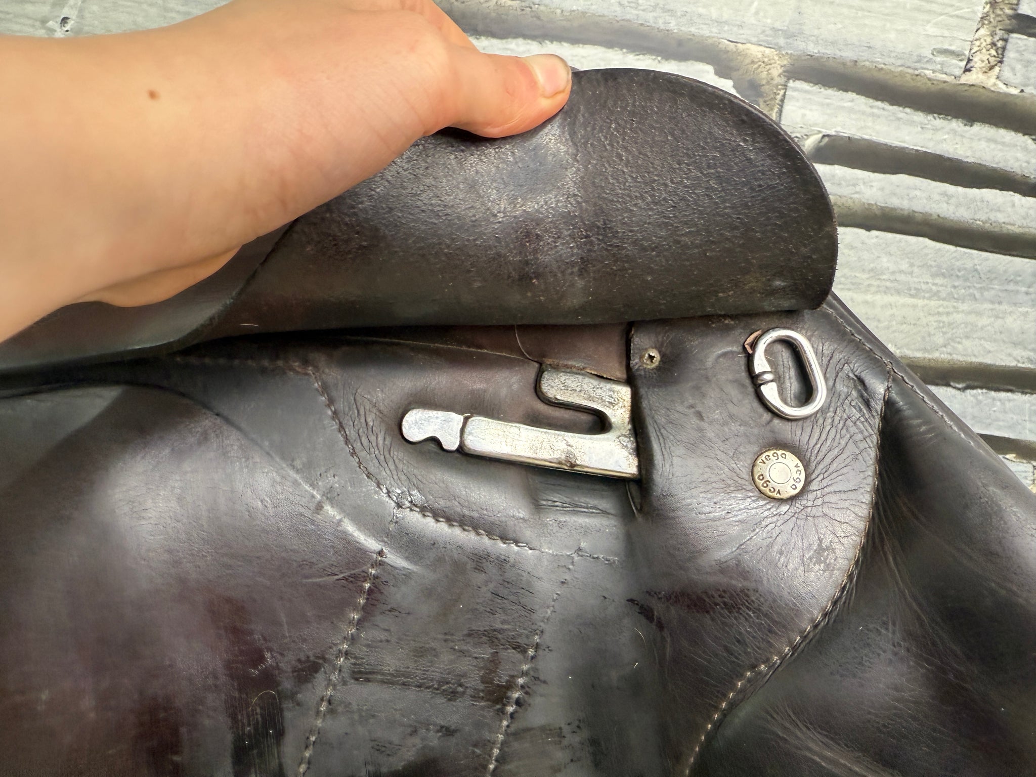 J446 - Good used condition, beautiful saddle! Felt lined and wool flocked panel. Had a very easy life! Surface front and back blocks. Square cantle, very neat. Stamped 17.