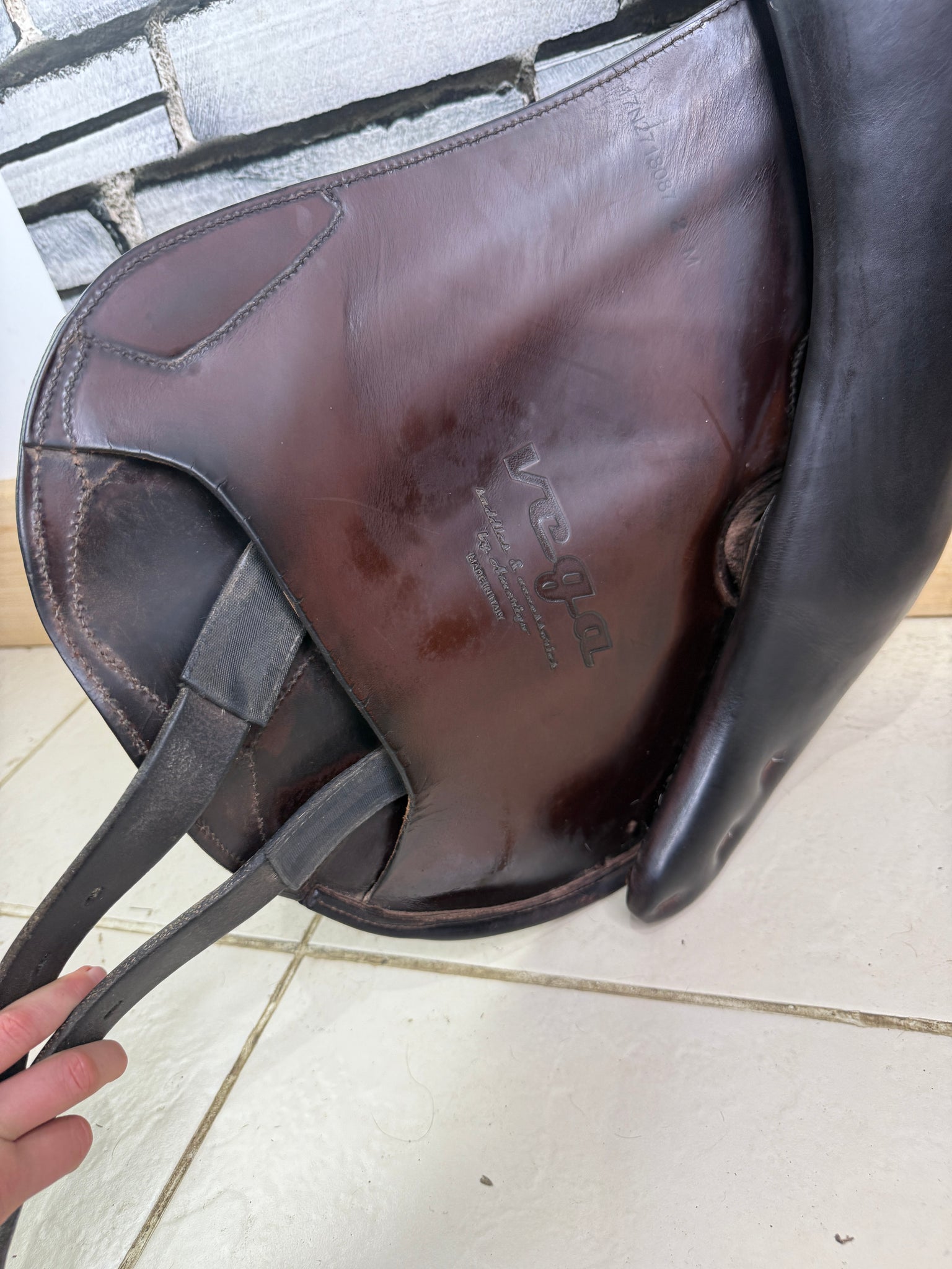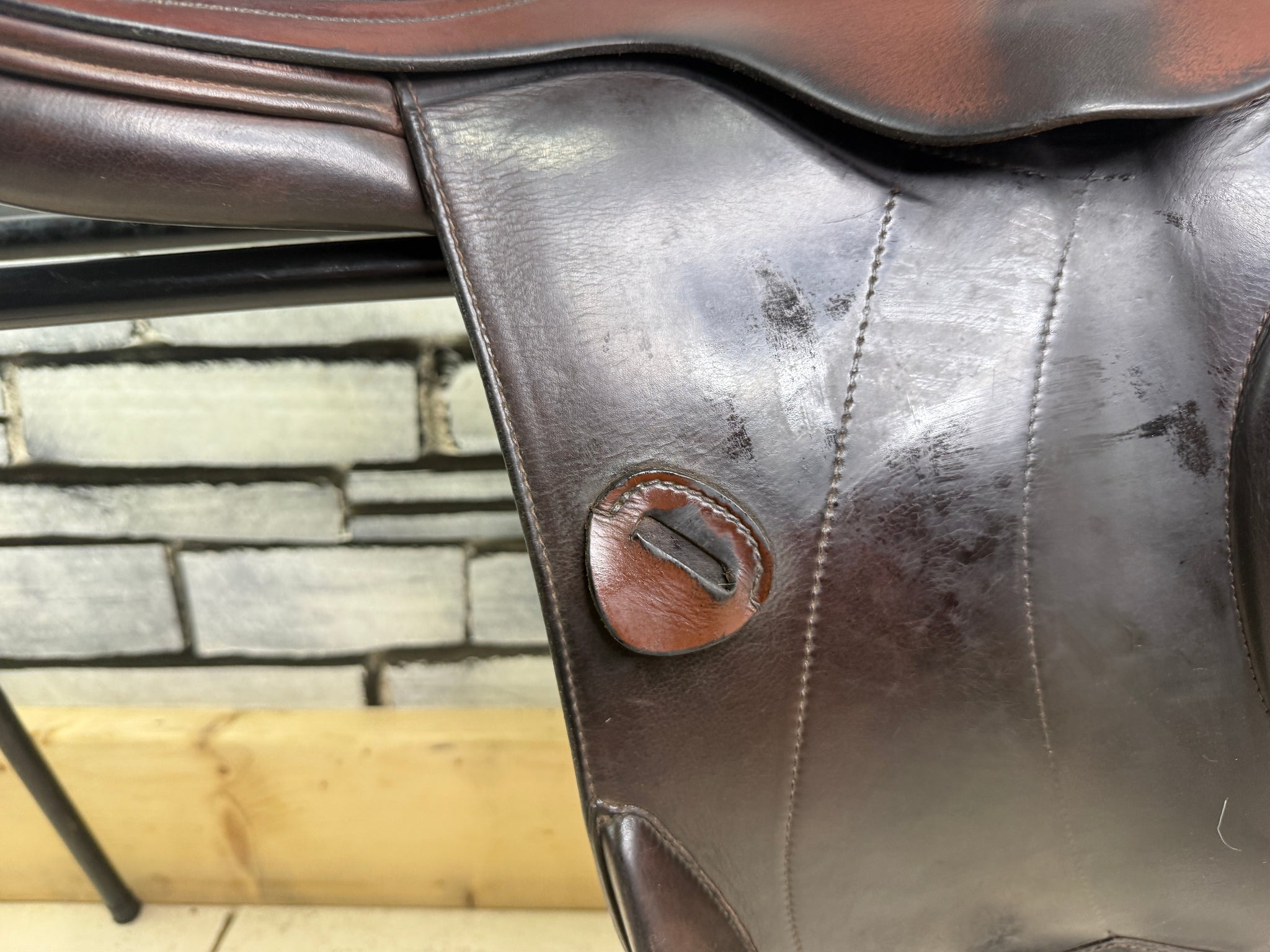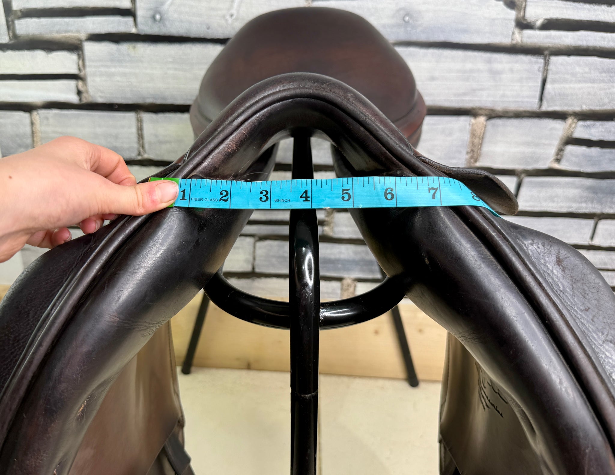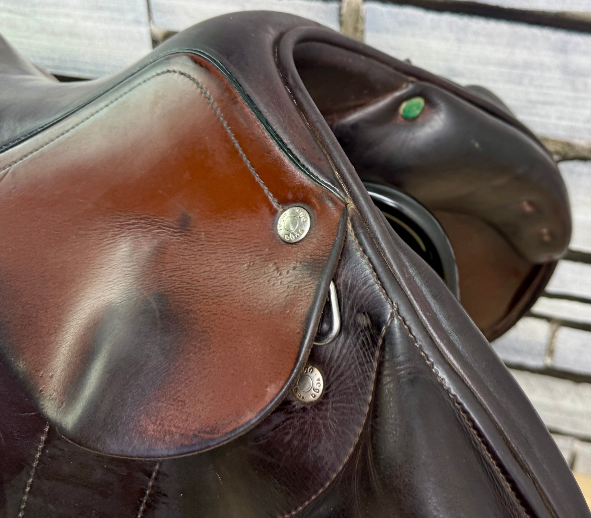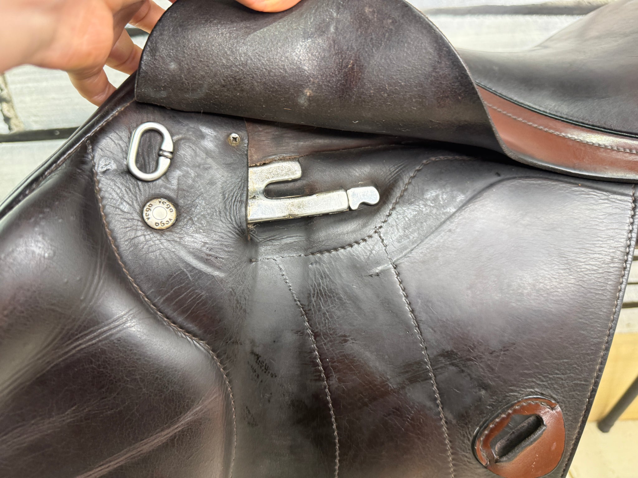 J446 - Good used condition, beautiful saddle! Felt lined and wool flocked panel. Had a very easy life! Surface front and back blocks. Square cantle, very neat. Stamped 17.