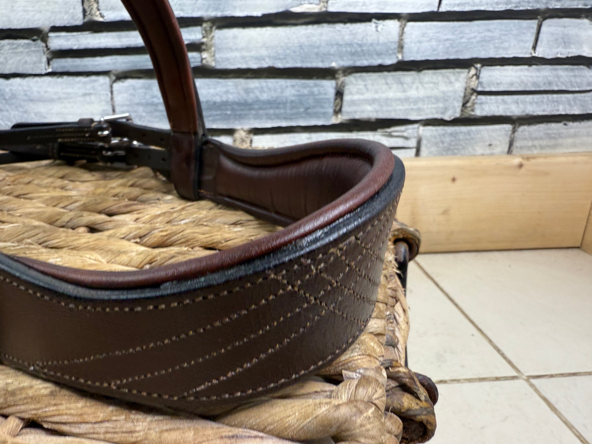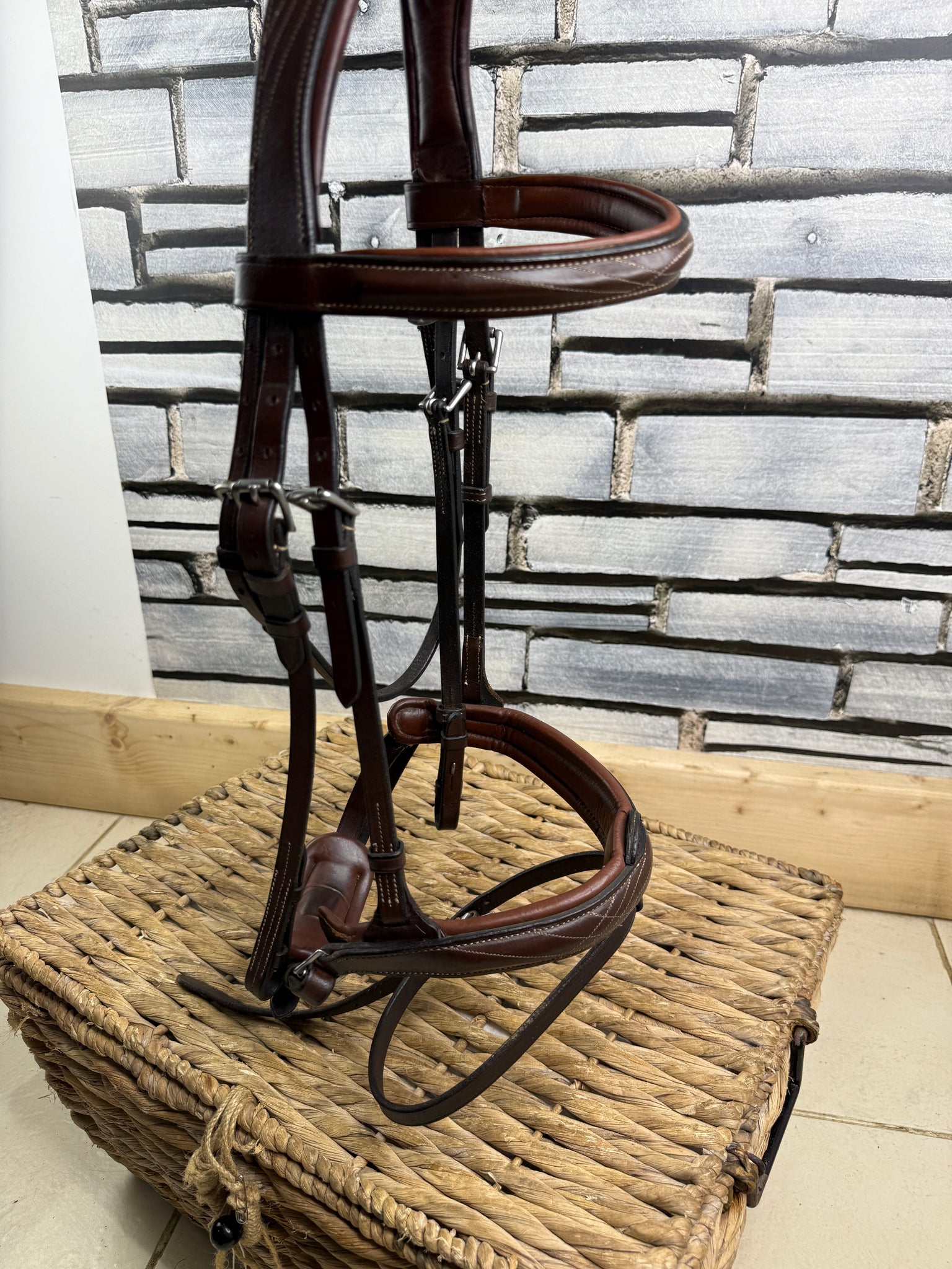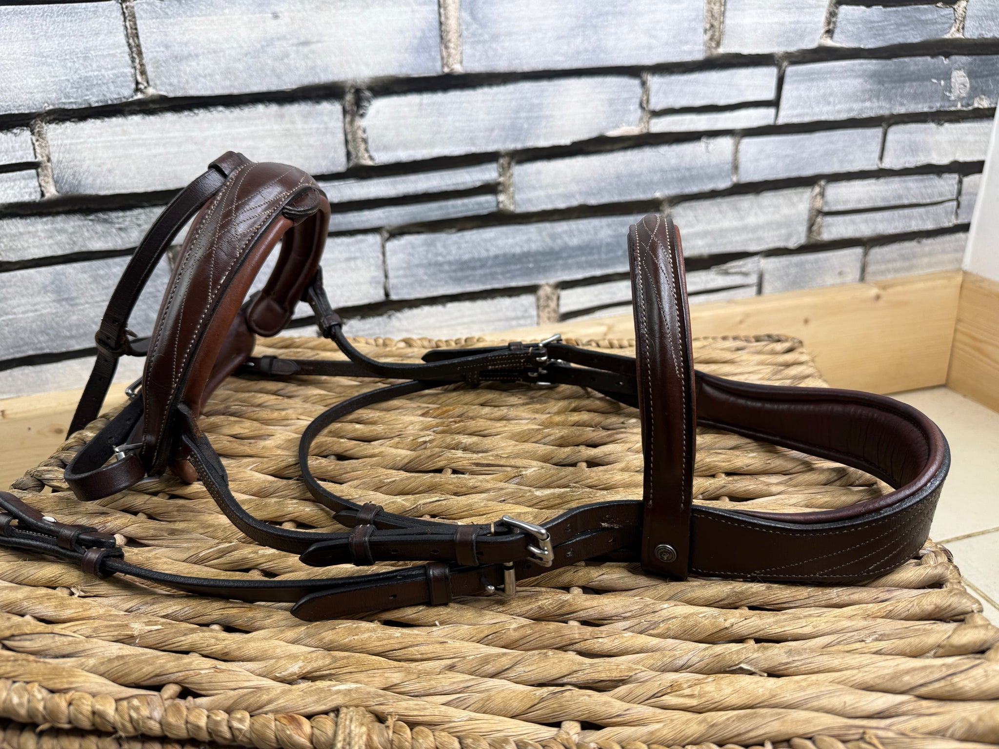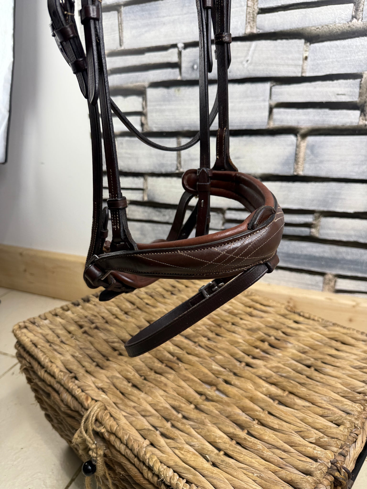 Padded leather bridle. Wide shaped and padded headpiece. Chunky crank noseband with removable flash attachment. Smart white stitched design.
