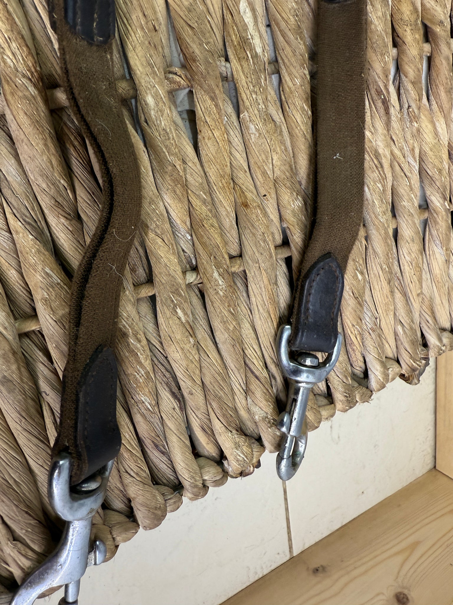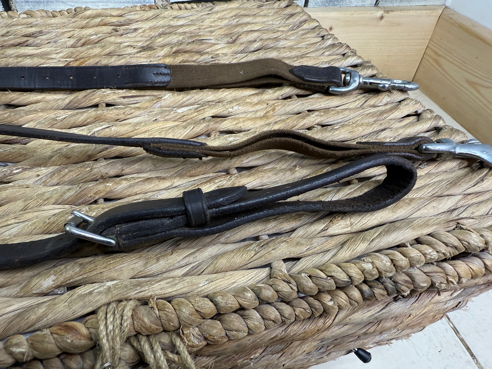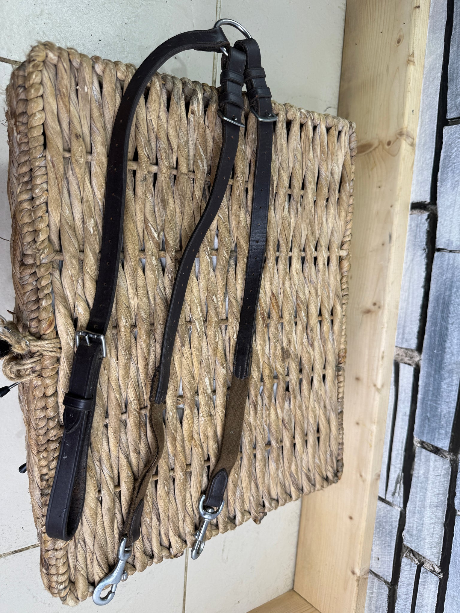 Used. Good quality. Few little marks. Clips to bit and buckle adjustment to the girth. Loads of holes so can be adjusted massively in every direction. Would probably go small enough to fit a pony. Stamped M.