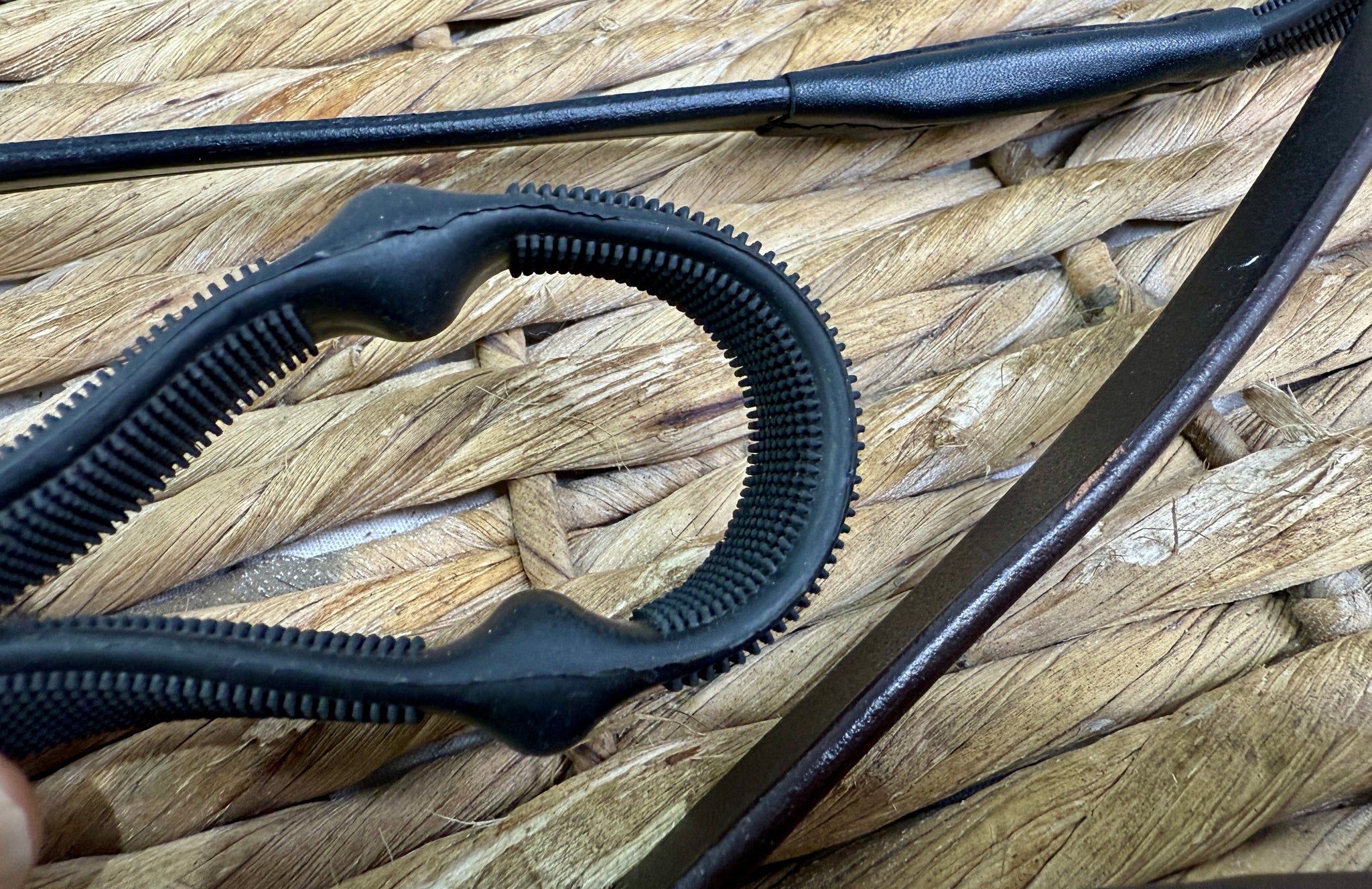 5/8” leatherwork. Billet ends. Lovely quality, mega grip - perfect for hunting and eventing. Still soft and not bulky in the hand - can really help with equally rein pressure by securing your hand on the same blocks.