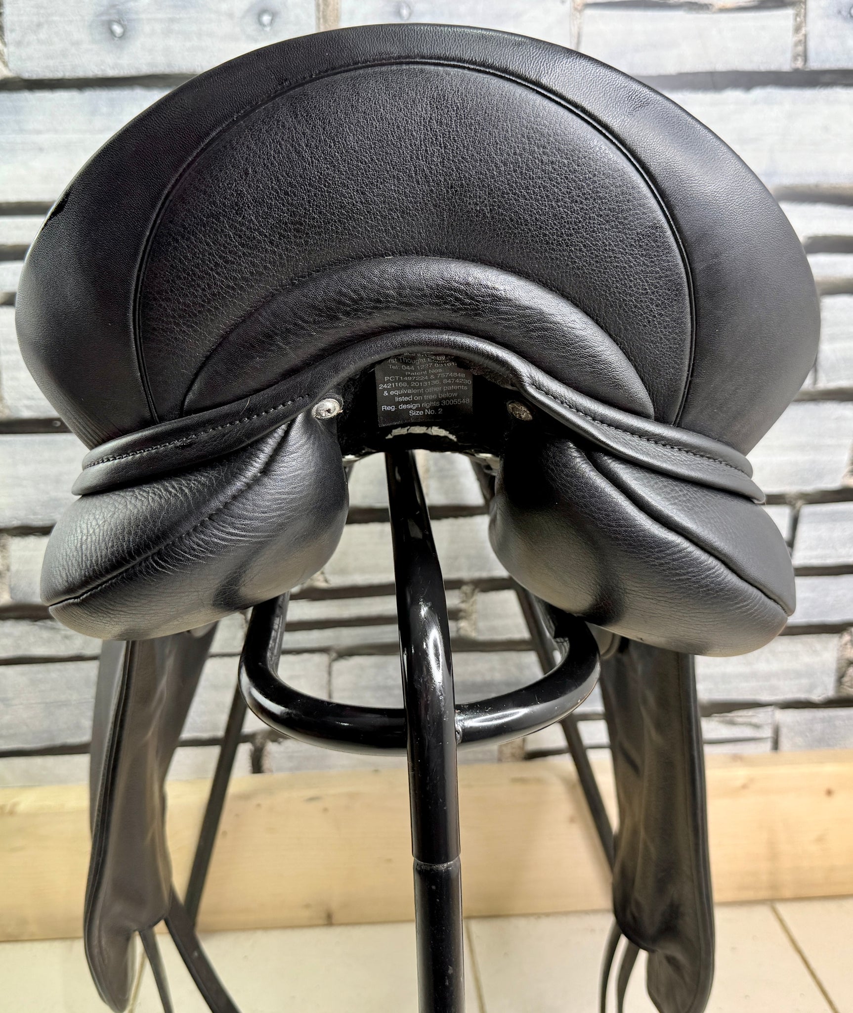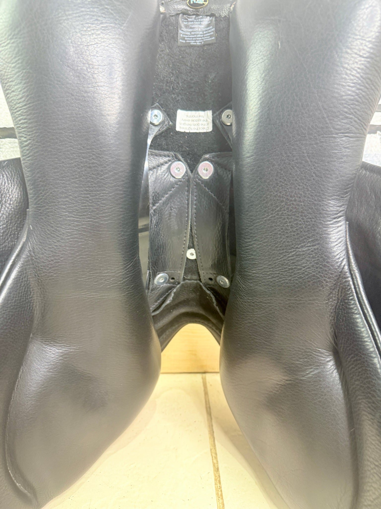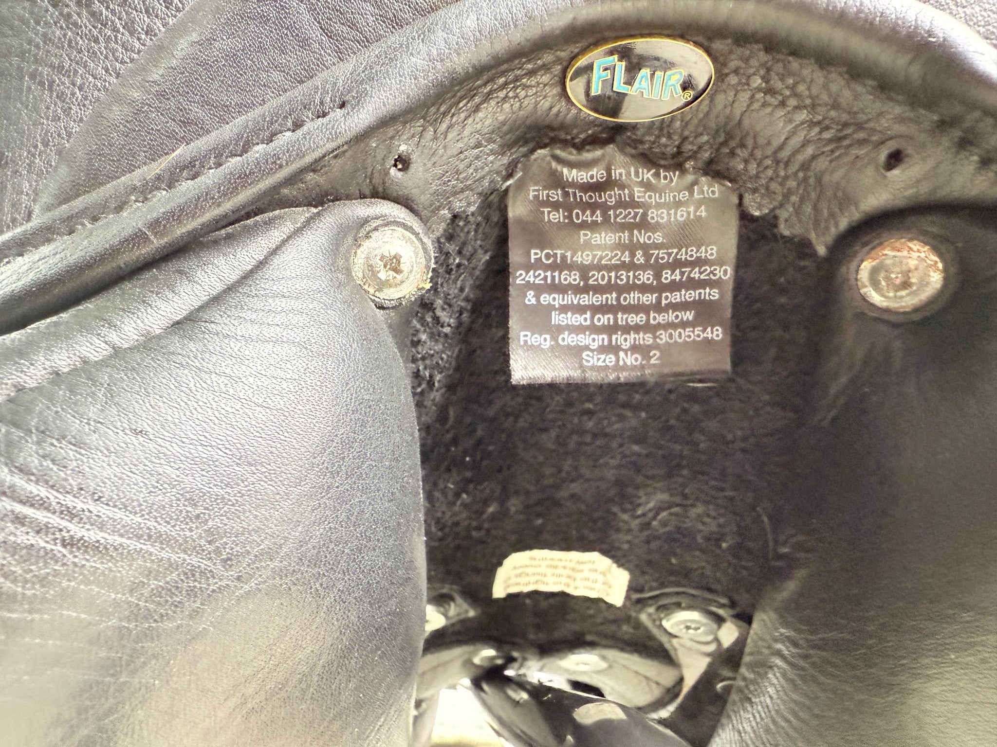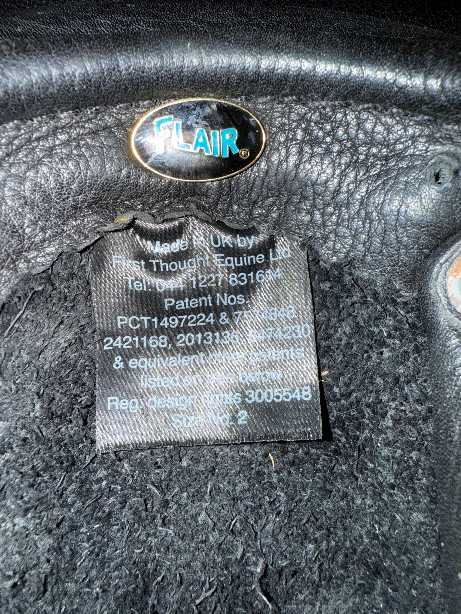D283 - stunning saddle, lightly used. Big Velcro/movebale blocks. Deep, softly padded seat. Soft Flair air flocked panels. Double stirrup bars. Changeable gullet - can go from XN-8XW. Currently fitted with a size 3/MW gullet.