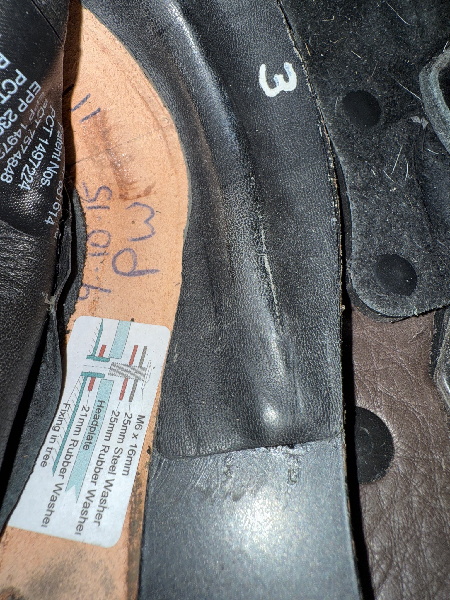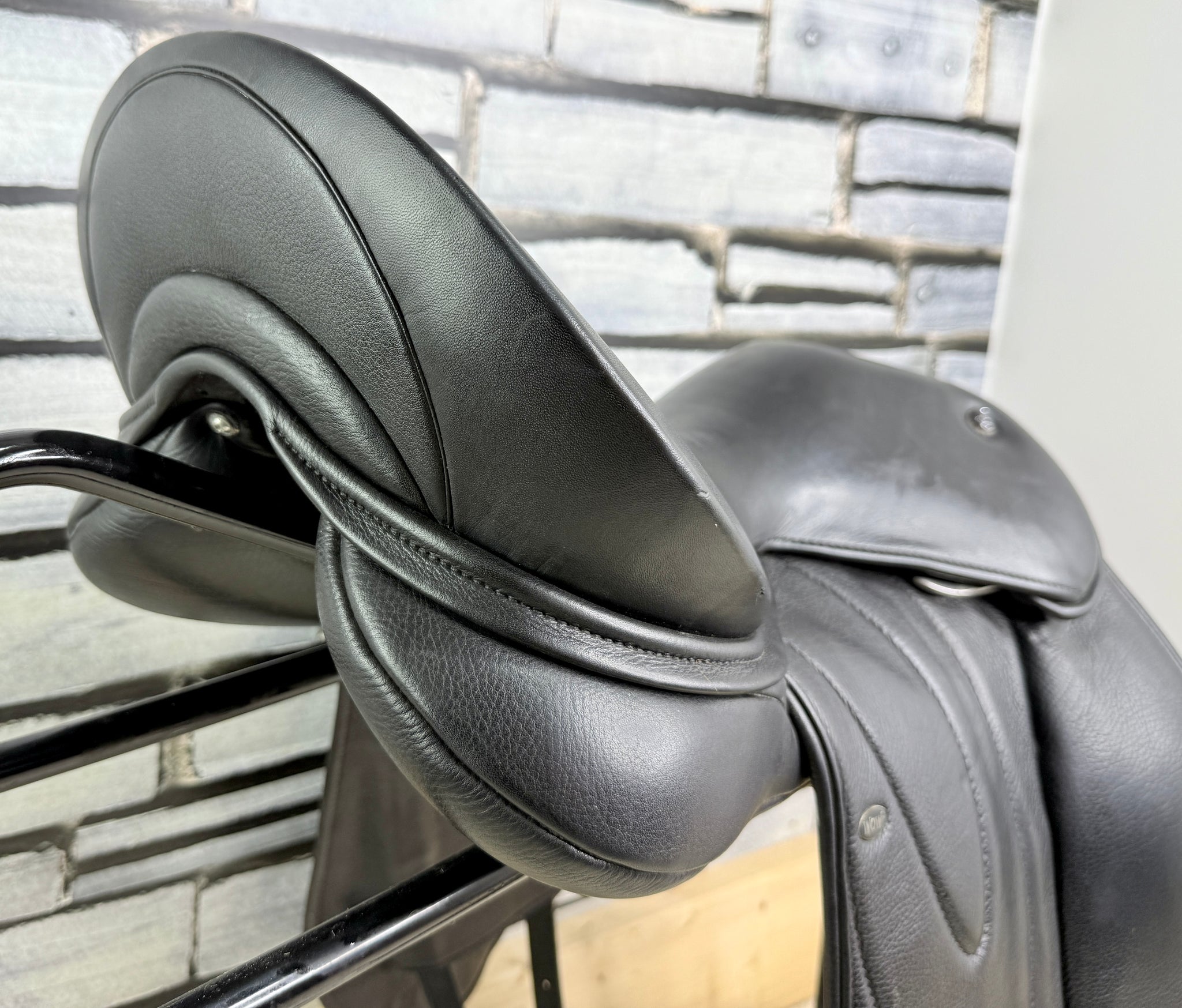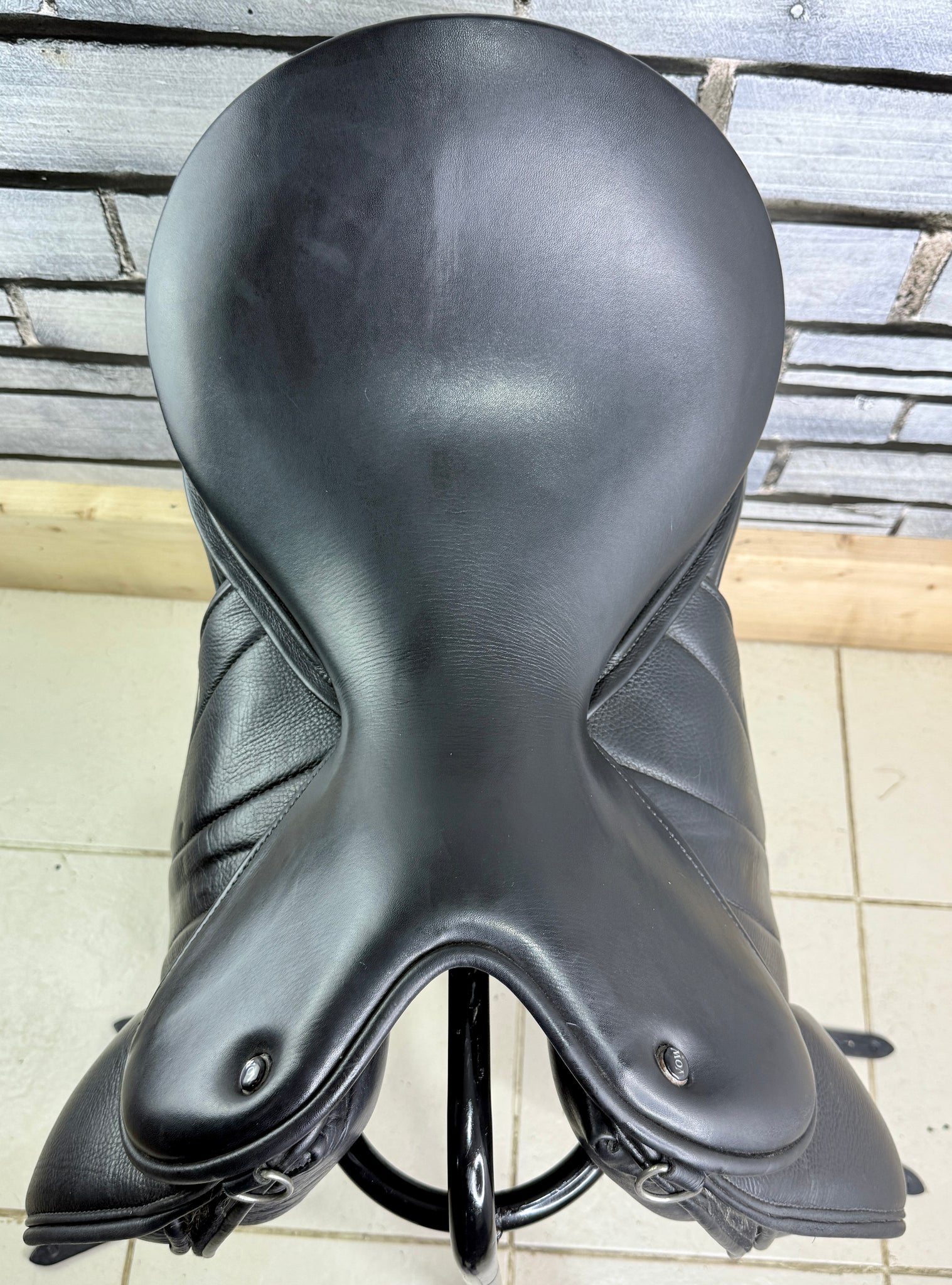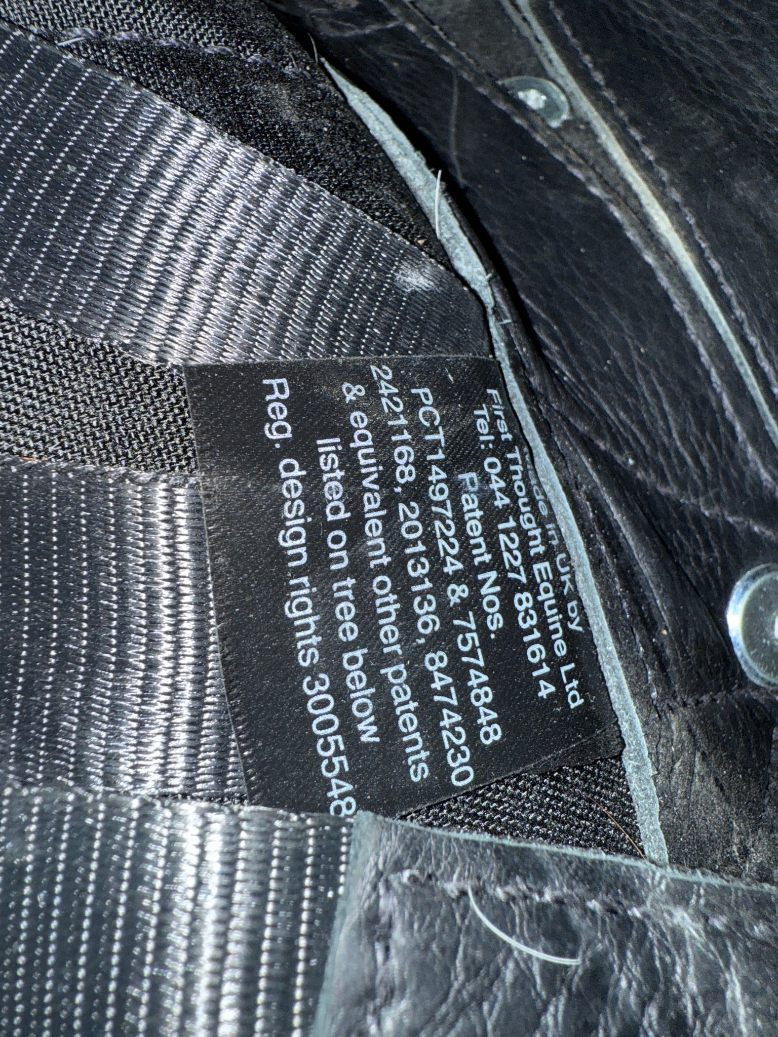 D283 - stunning saddle, lightly used. Big Velcro/movebale blocks. Deep, softly padded seat. Soft Flair air flocked panels. Double stirrup bars. Changeable gullet - can go from XN-8XW. Currently fitted with a size 3/MW gullet.