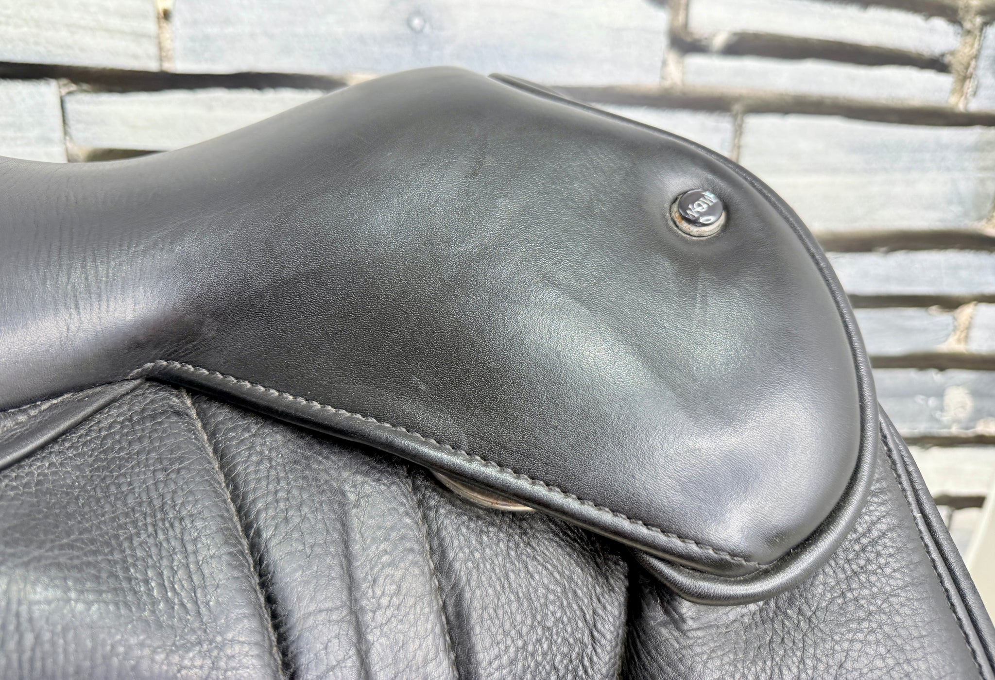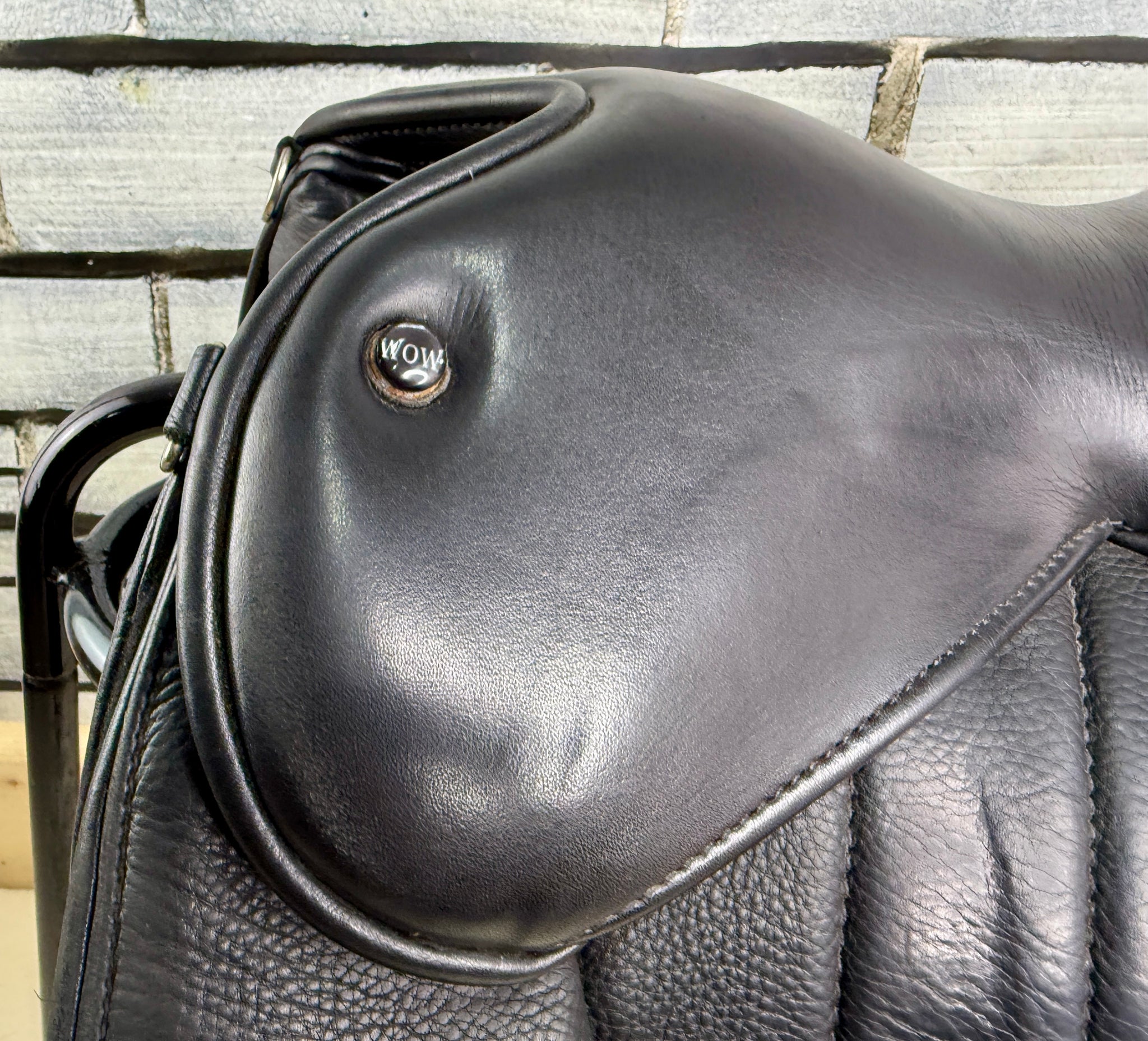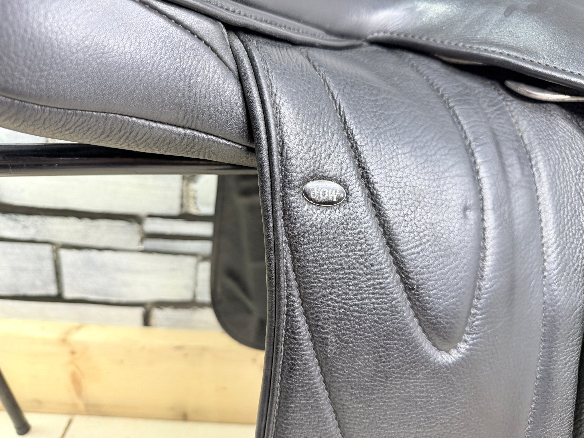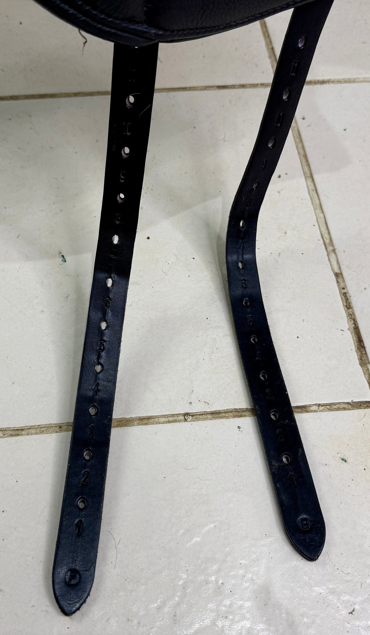 D283 - stunning saddle, lightly used. Big Velcro/movebale blocks. Deep, softly padded seat. Soft Flair air flocked panels. Double stirrup bars. Changeable gullet - can go from XN-8XW. Currently fitted with a size 3/MW gullet.