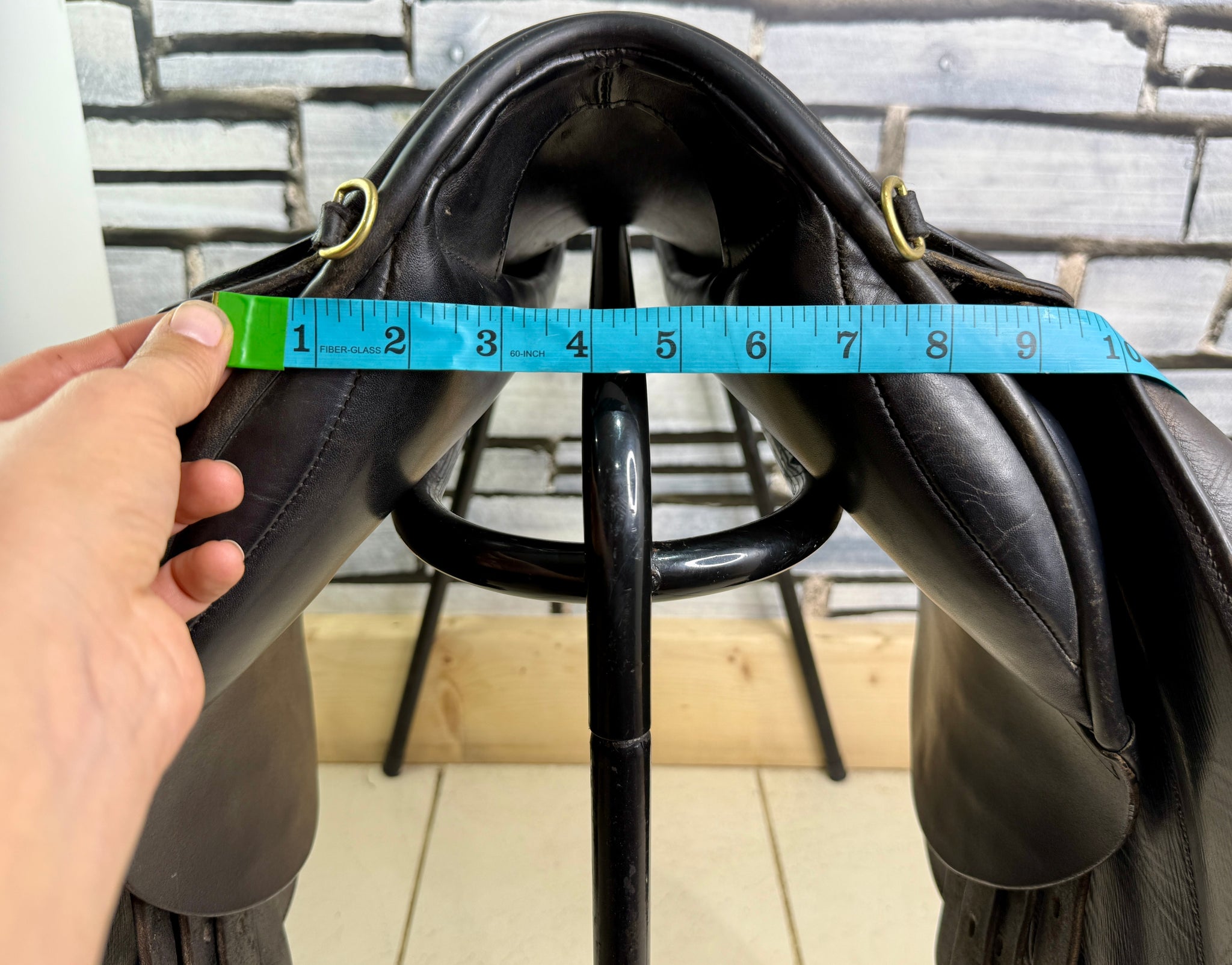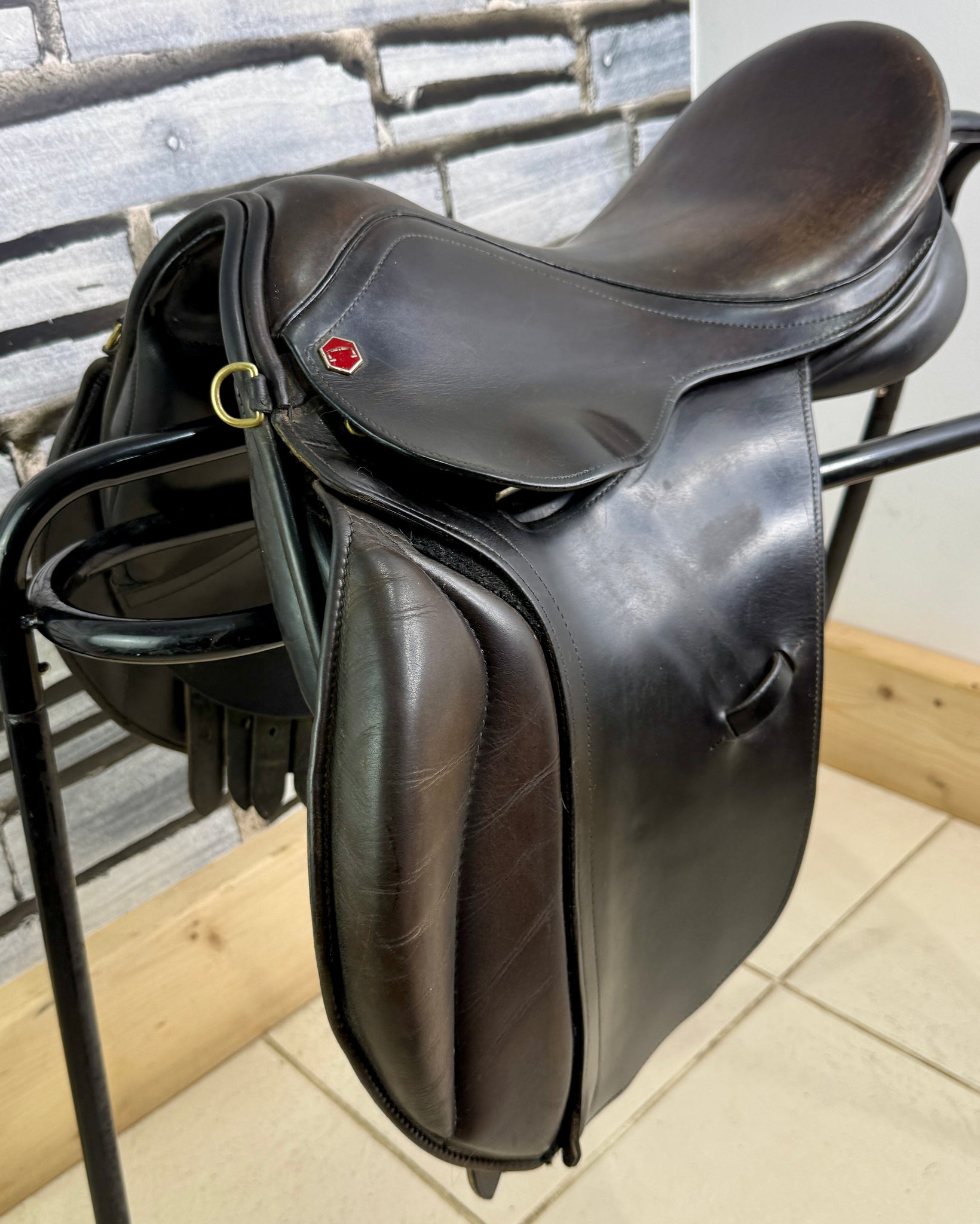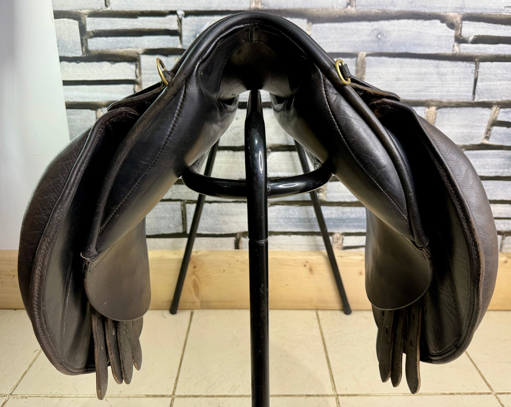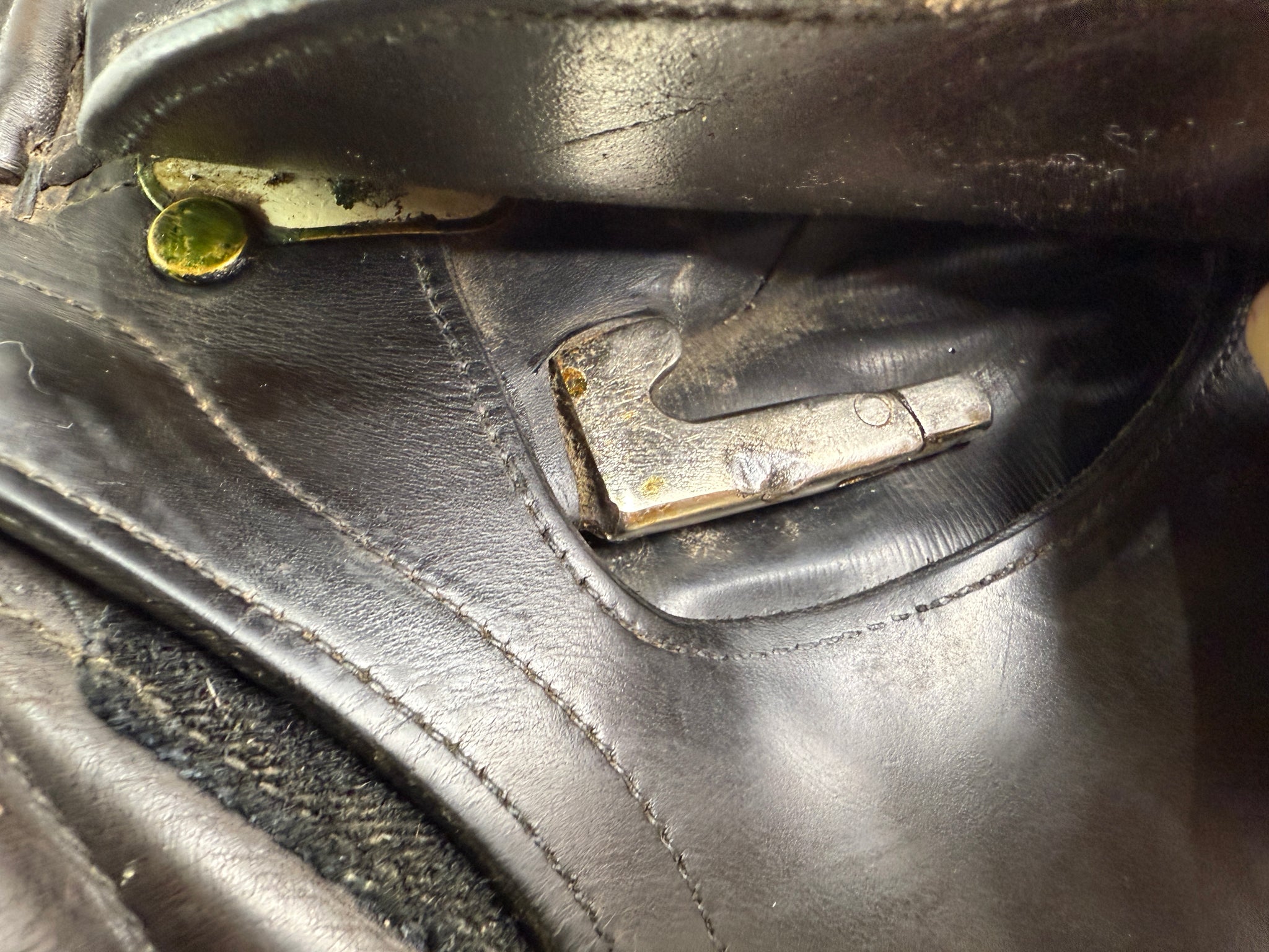 P213 - Rare as hens teeth!! in well looked after condition. The Selecta model comes with changeable pads, this has the GP knee pads with a surface block built in. Other pads are available online. Nice depth of seat, very versatile and supportive, point strap fitted. Wool flocked panel. Top quality. Stamped 15 MW.
